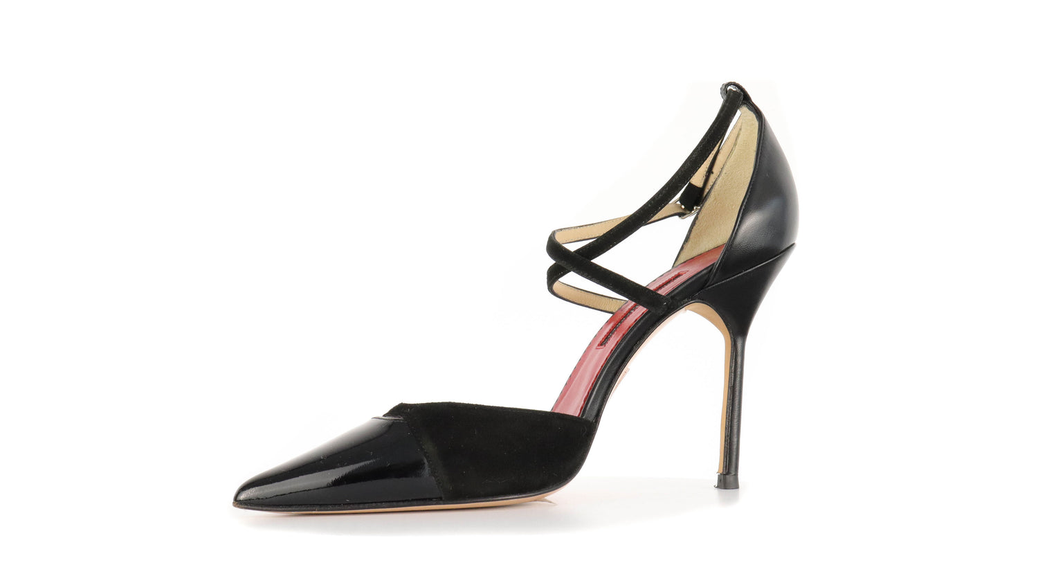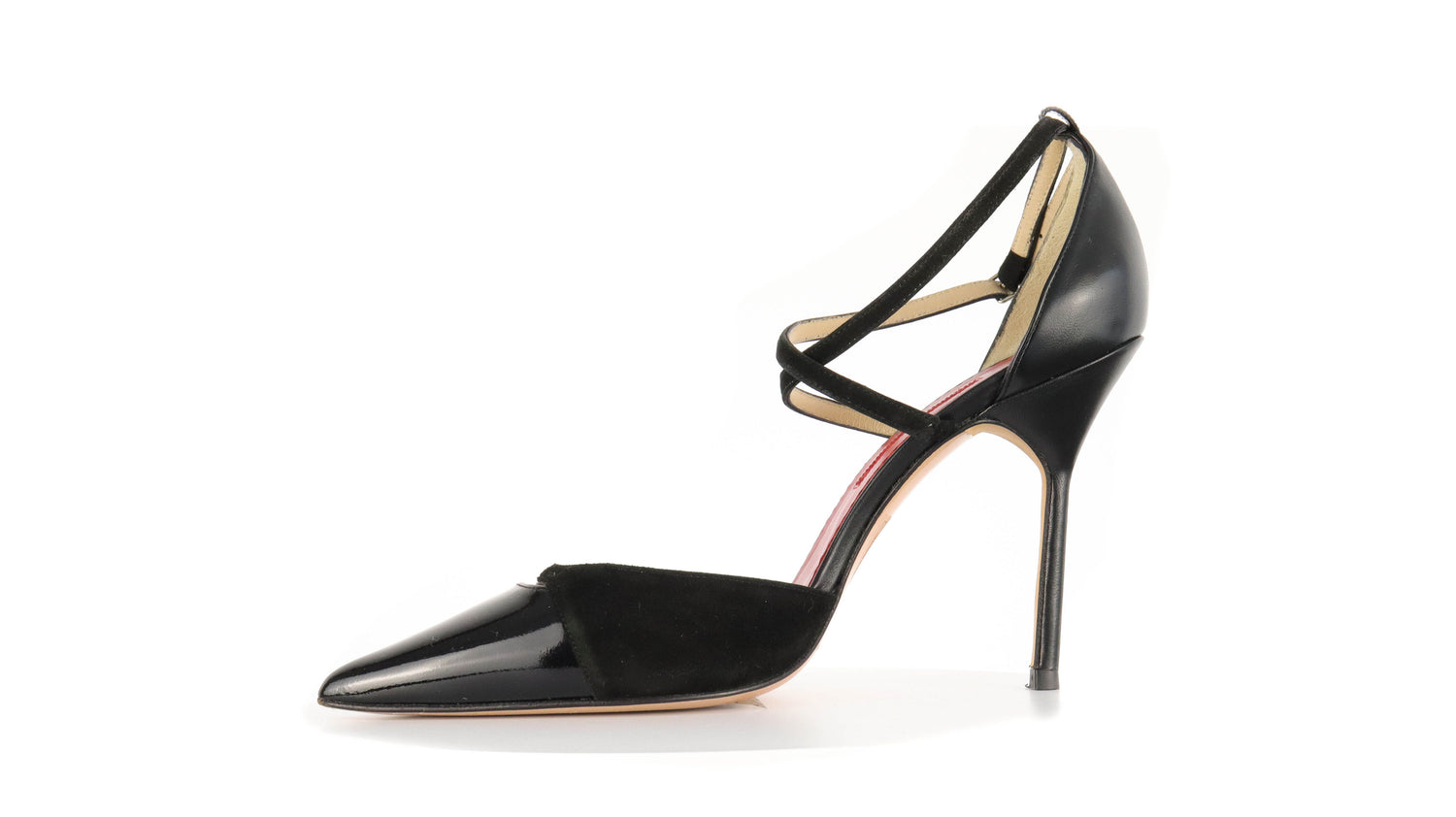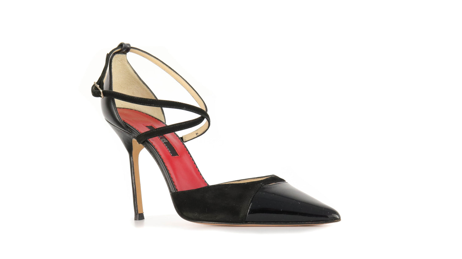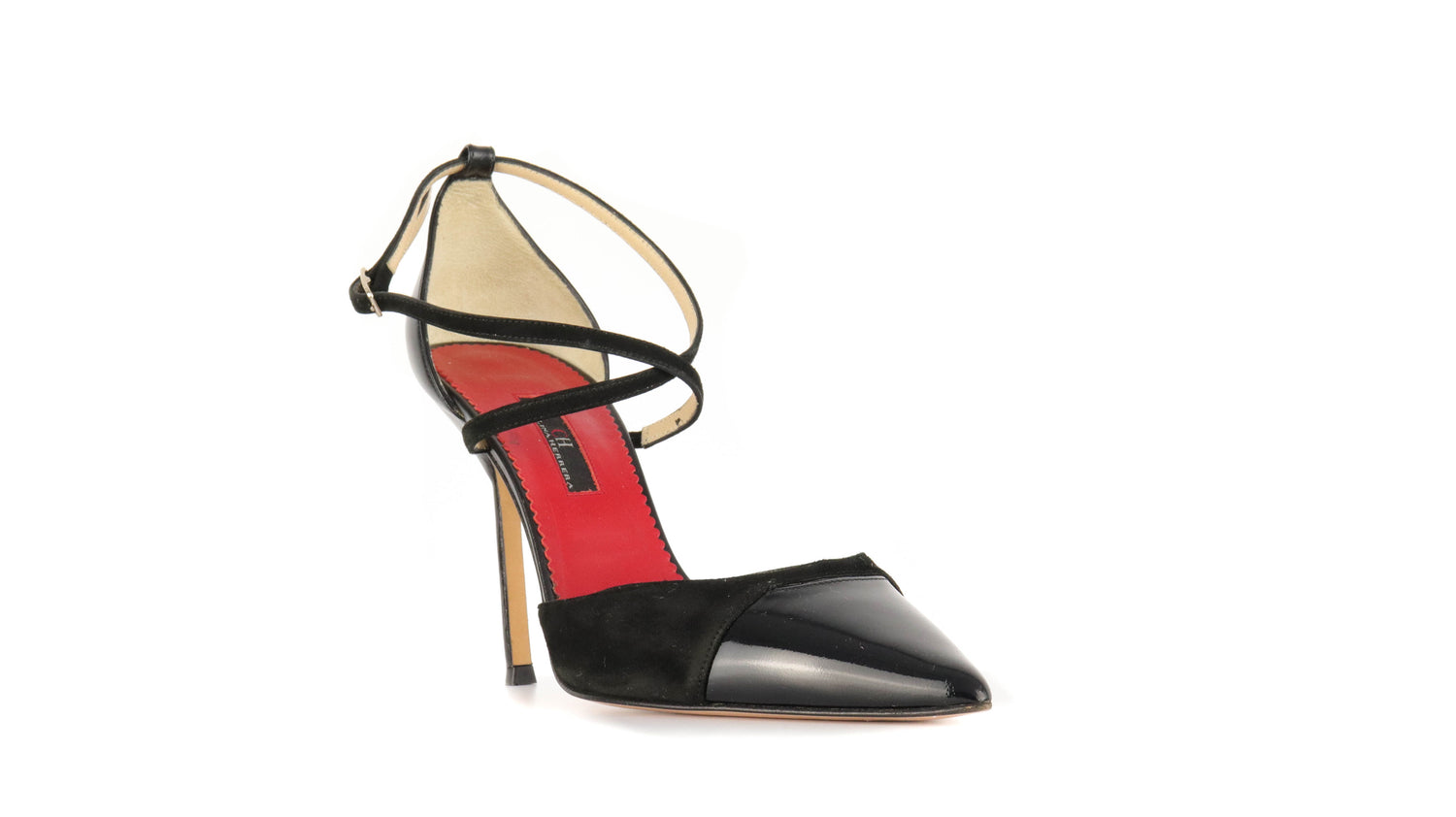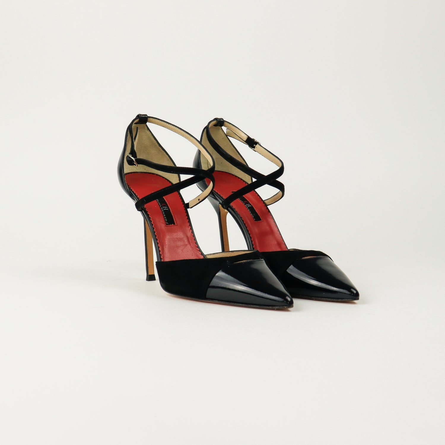 Tacones Carolina Herrera confeccionados en piel y charol negro, talonera con cintas cruzadas.