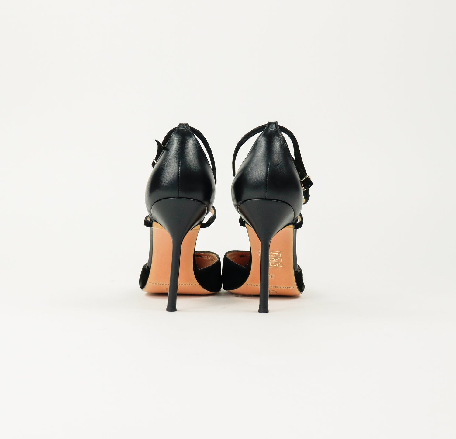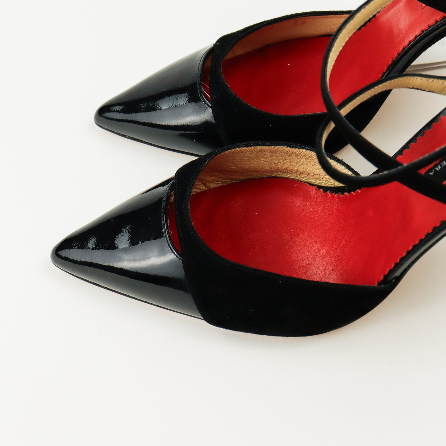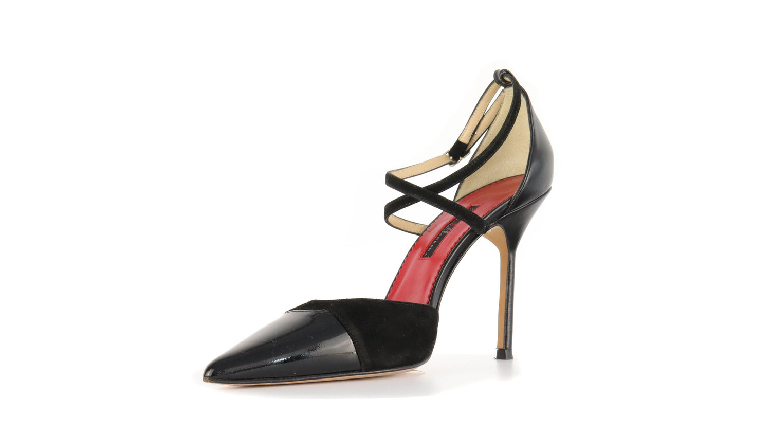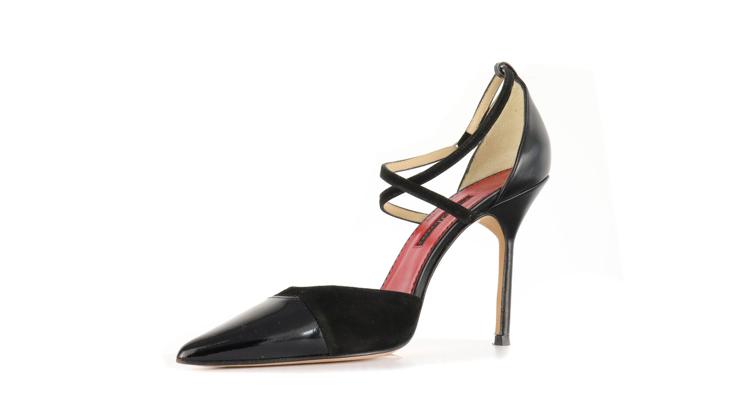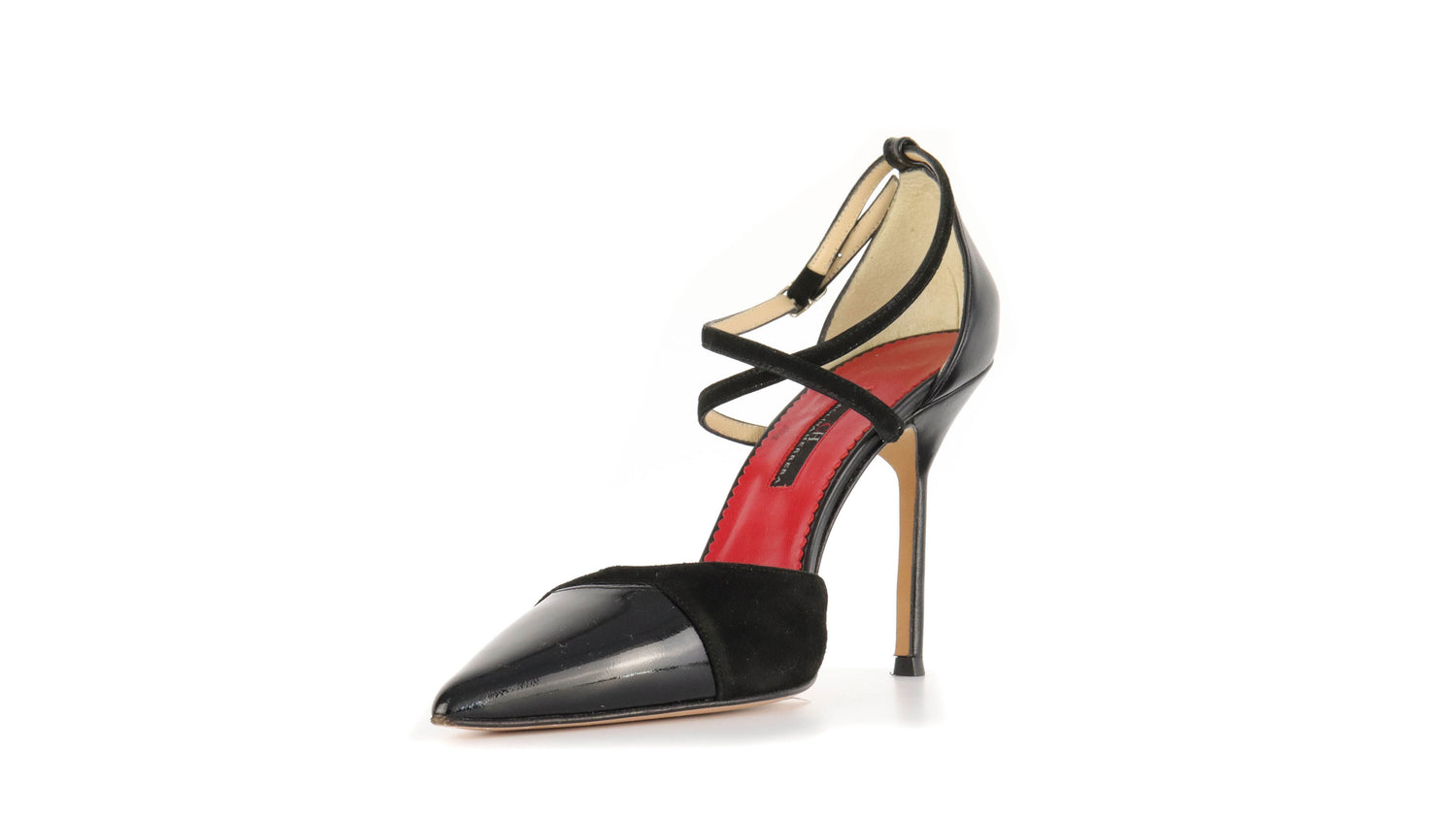 Tacones Carolina Herrera confeccionados en piel y charol negro, talonera con cintas cruzadas.
