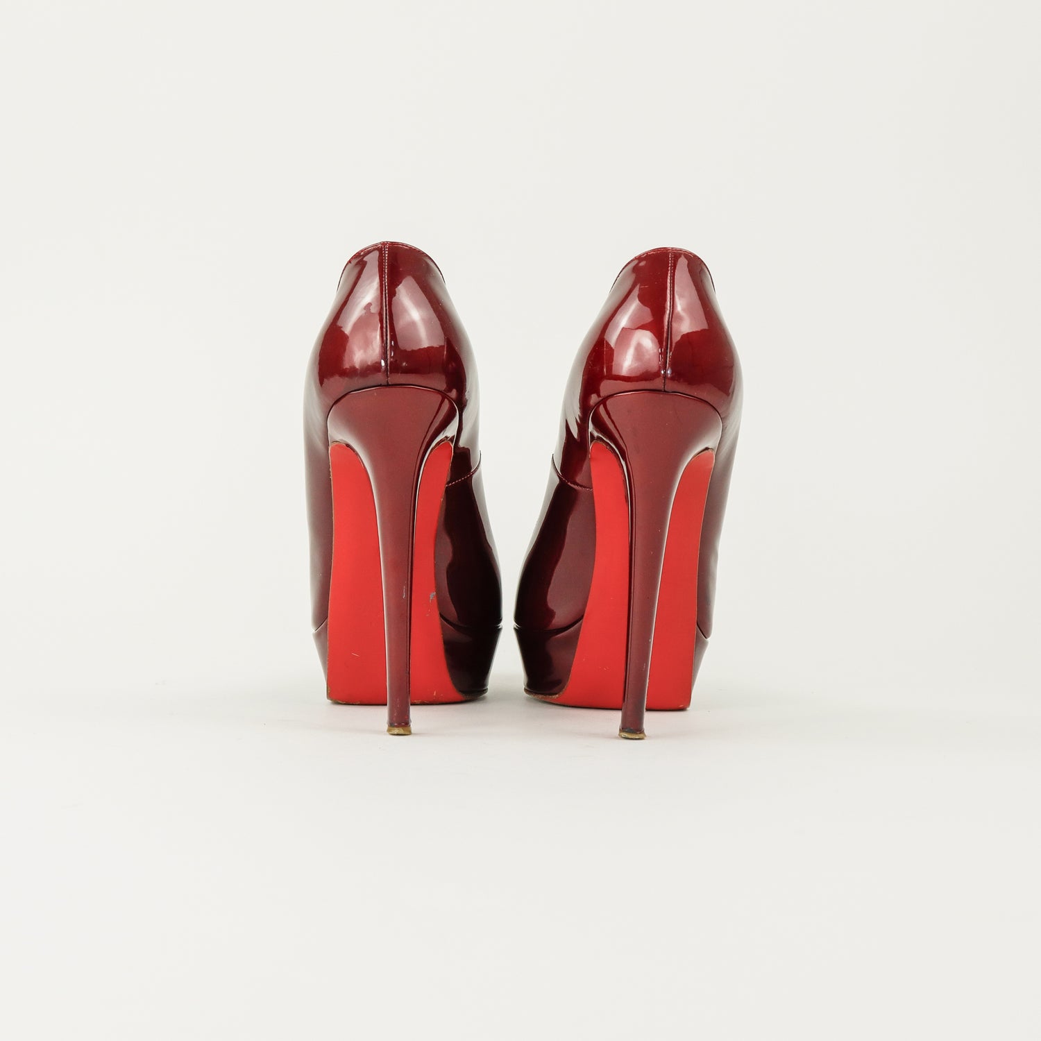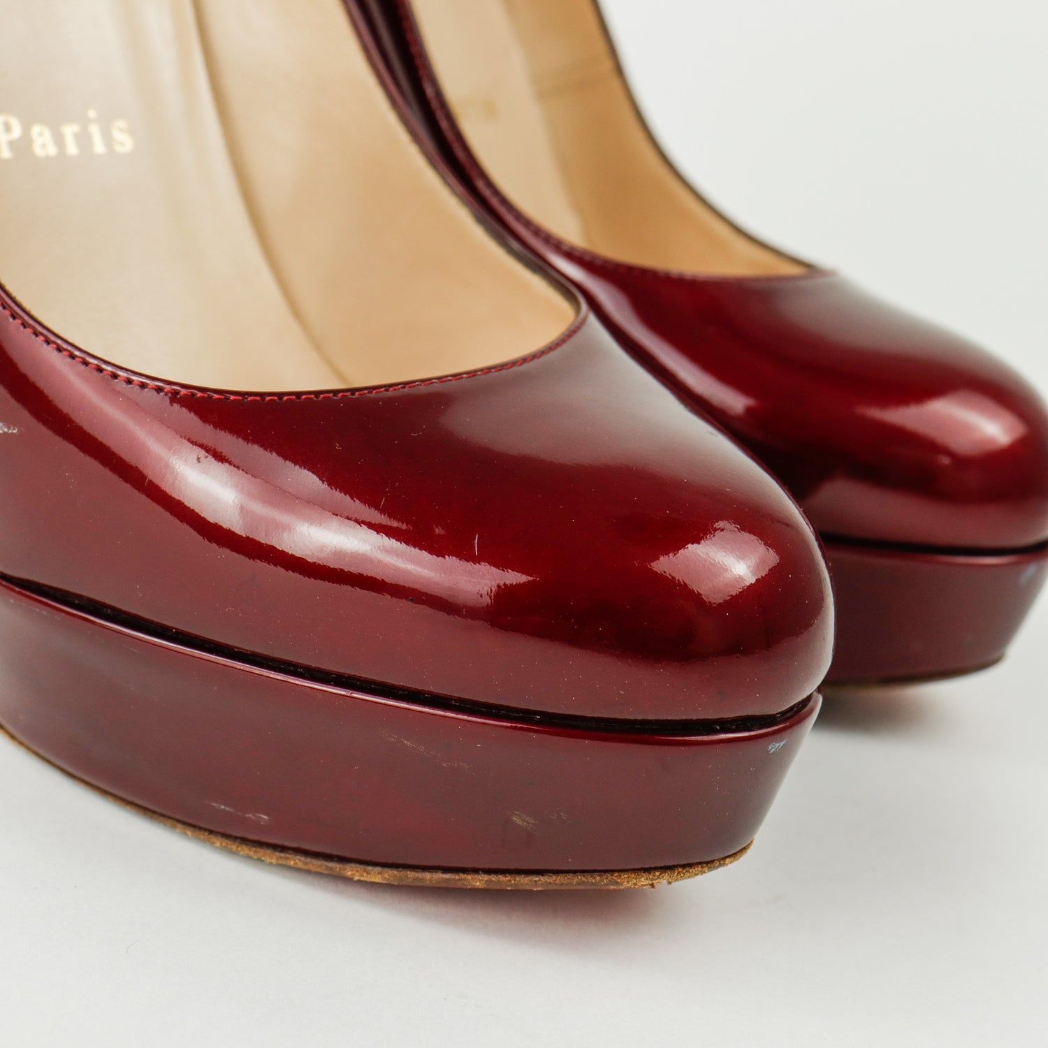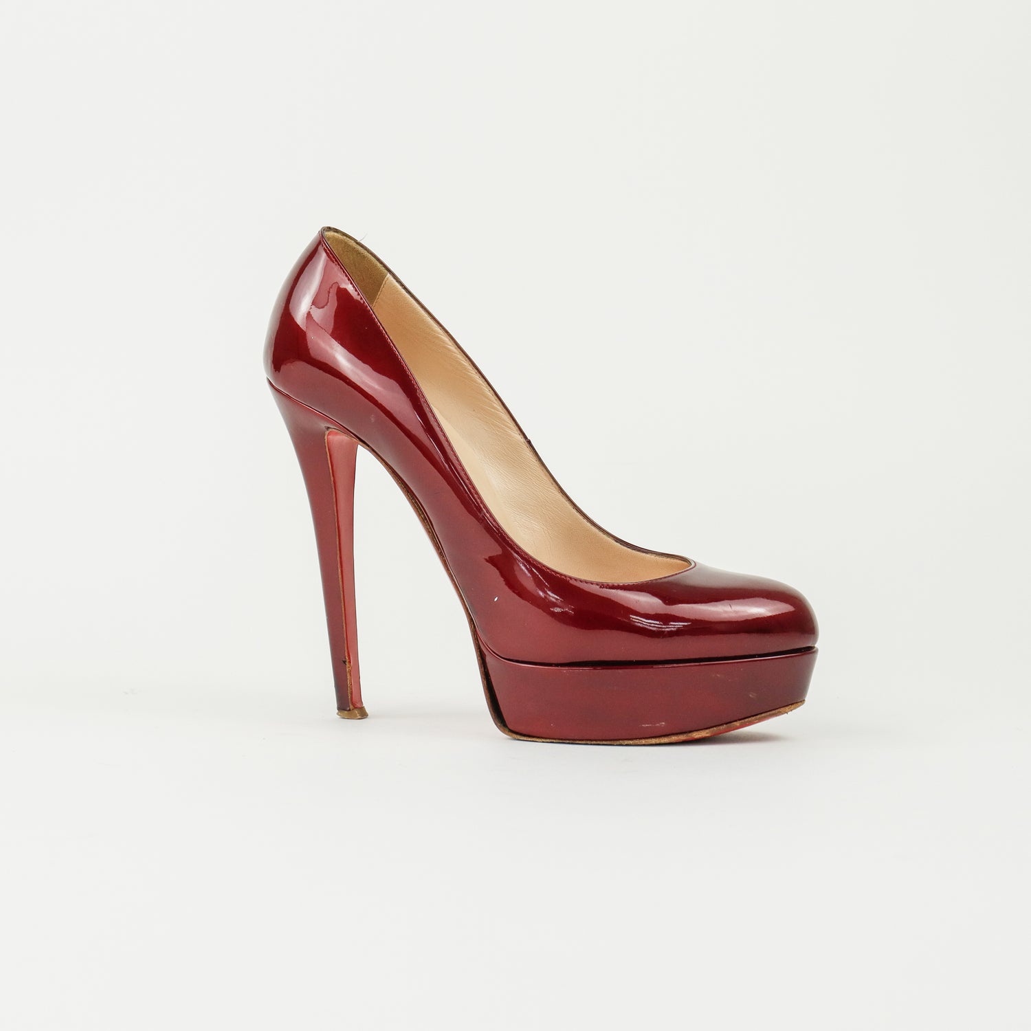 Zapato de tacón Christian Louboutin, elaborado en piel de charol color rojo, estilo slip on, puntera redonda cerrada y empeine descubierto, con plataforma y tacón alto.