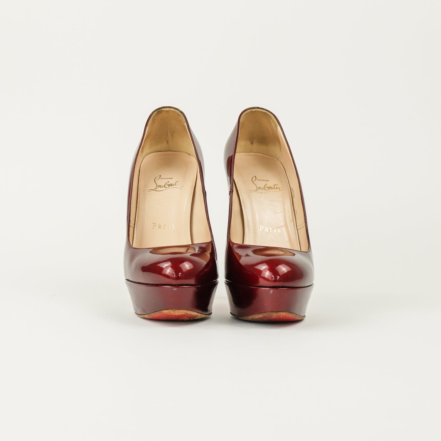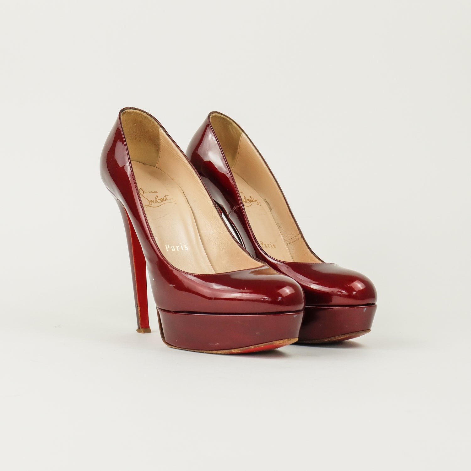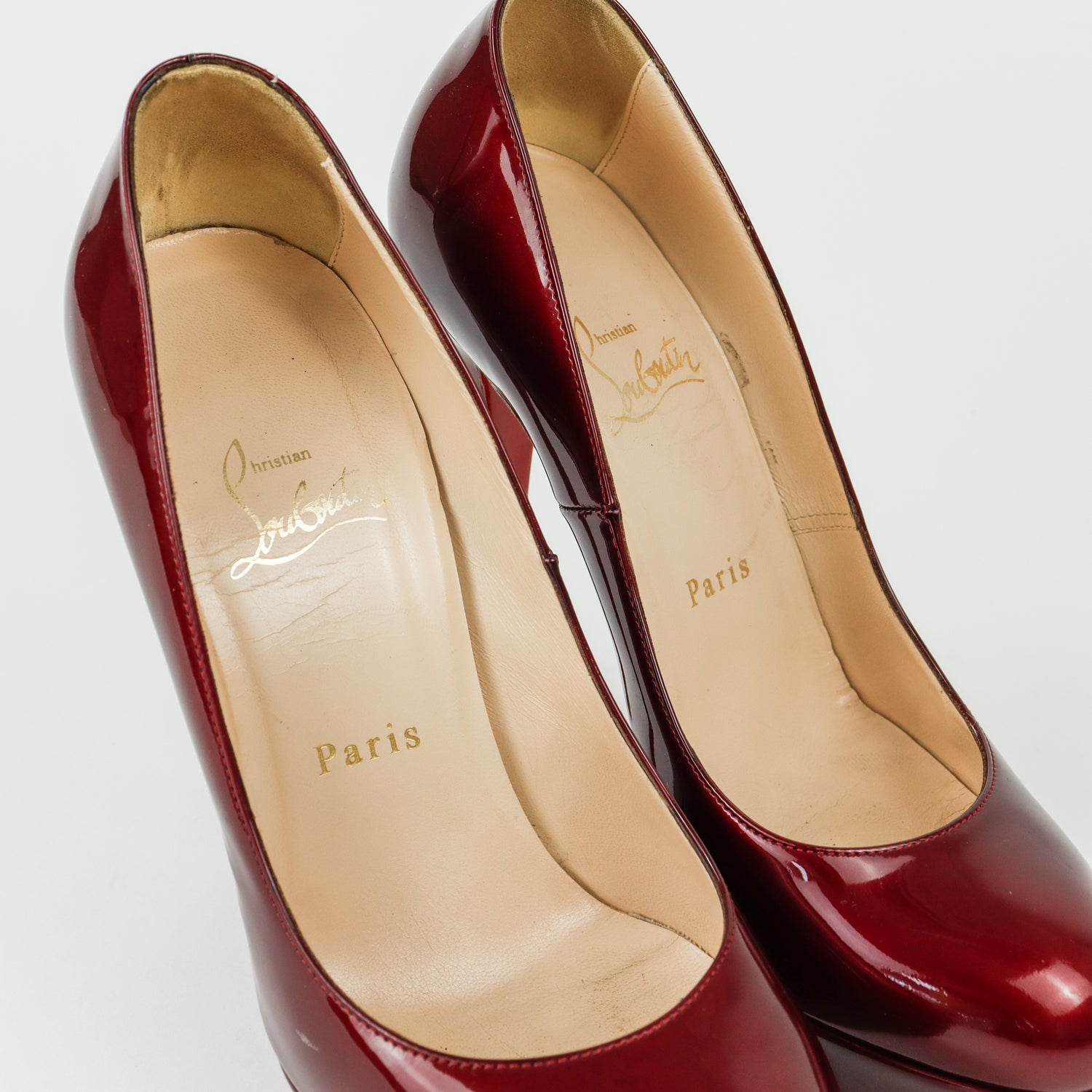 Zapato de tacón Christian Louboutin, elaborado en piel de charol color rojo, estilo slip on, puntera redonda cerrada y empeine descubierto, con plataforma y tacón alto.
