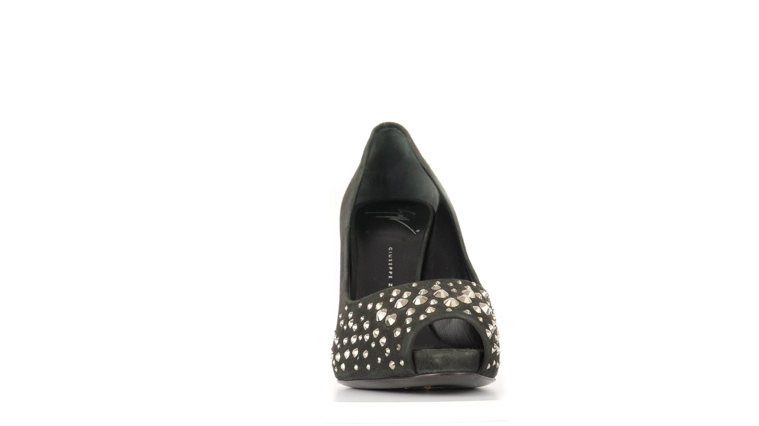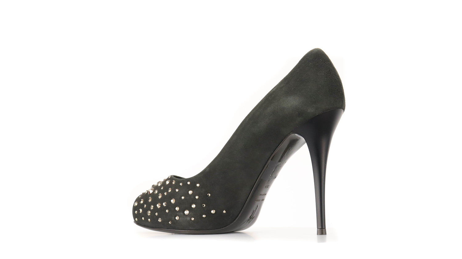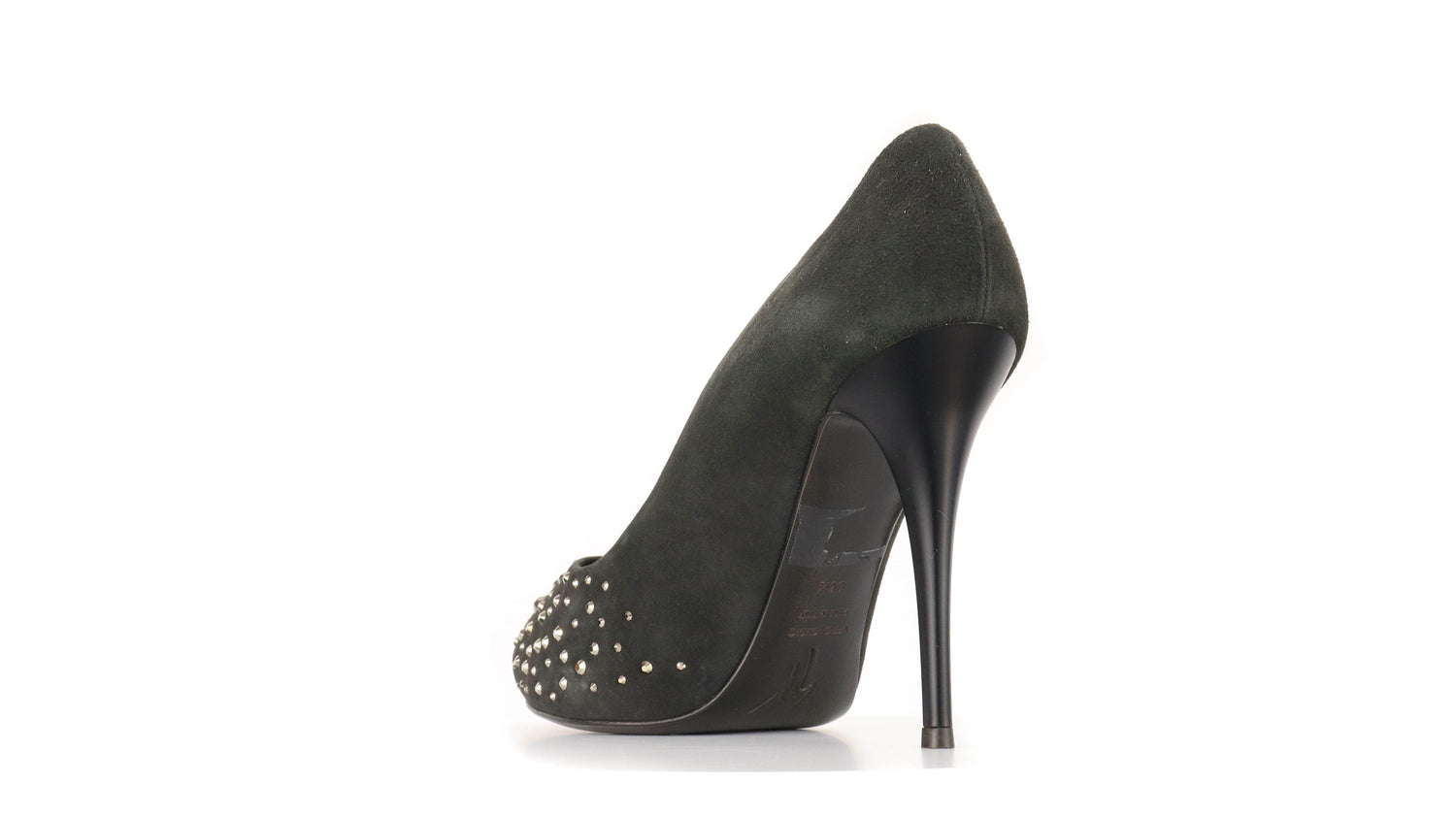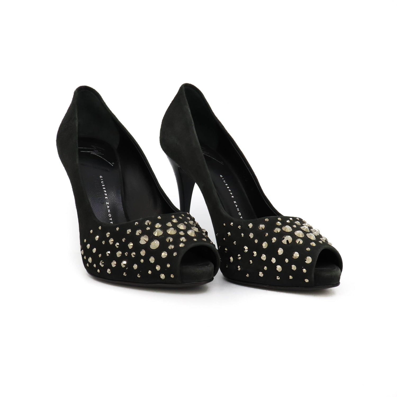 Tacones Giuseppe Zanotti, elaborados en gamuza color negro, con detalles de estoperoles en la parte frontal.
