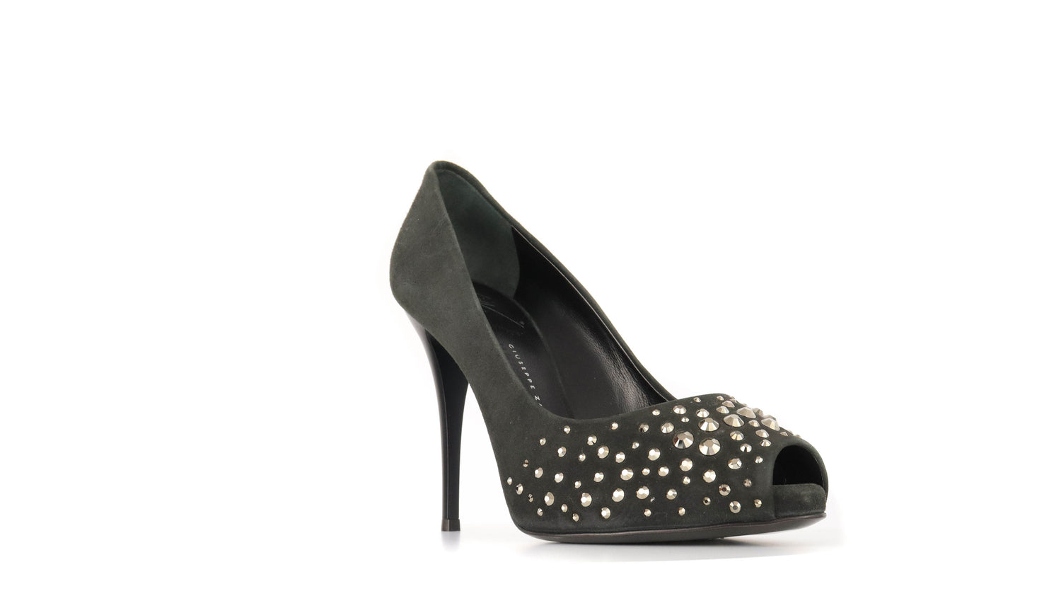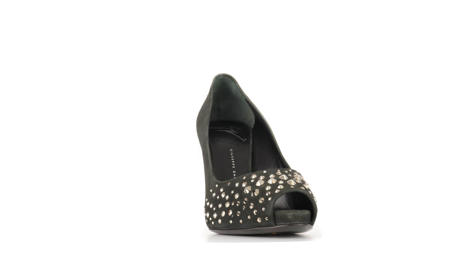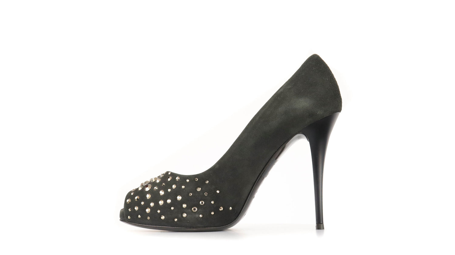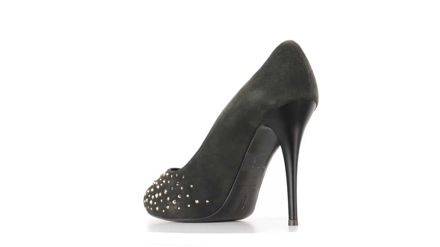 Tacones Giuseppe Zanotti, elaborados en gamuza color negro, con detalles de estoperoles en la parte frontal.