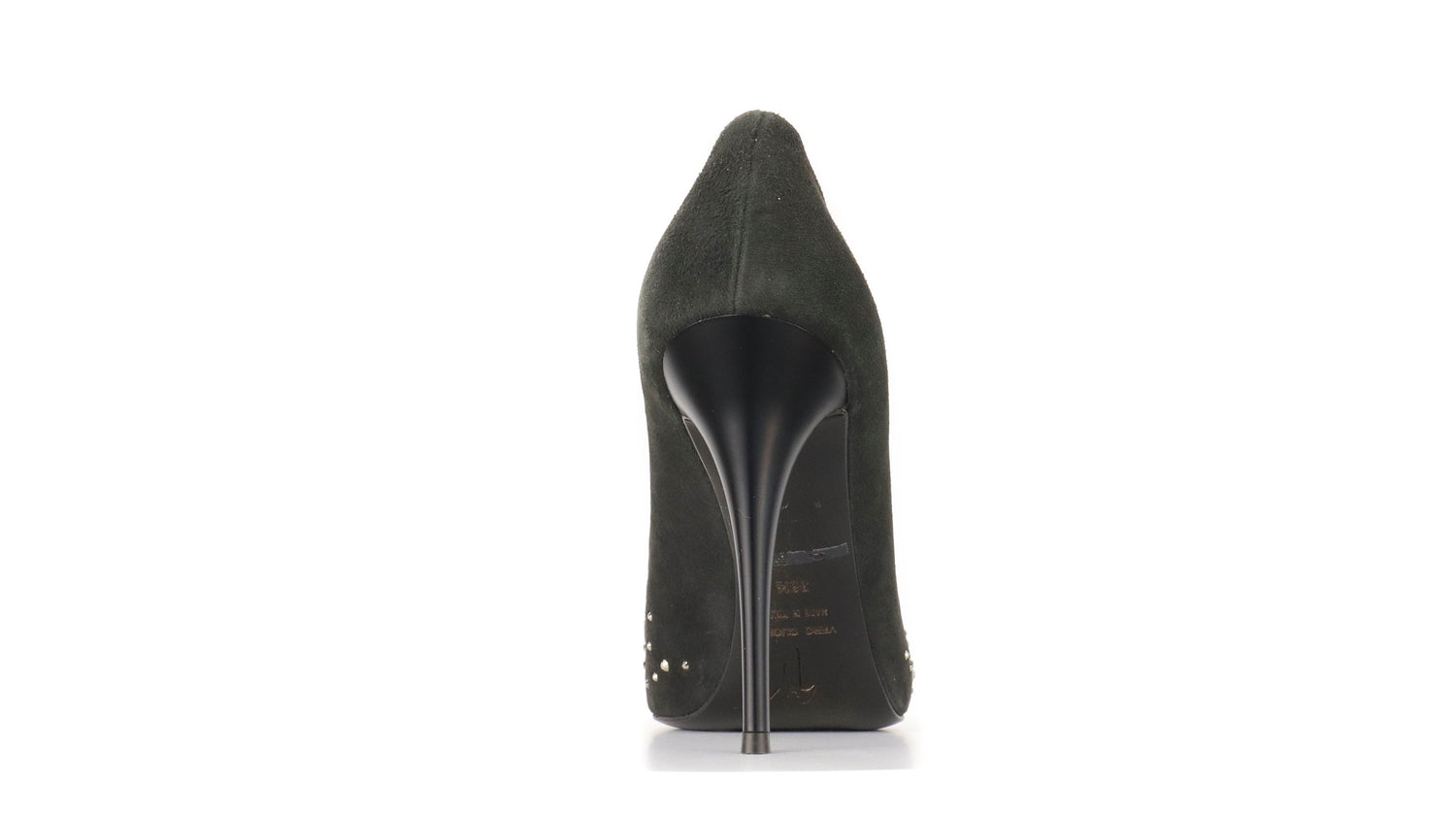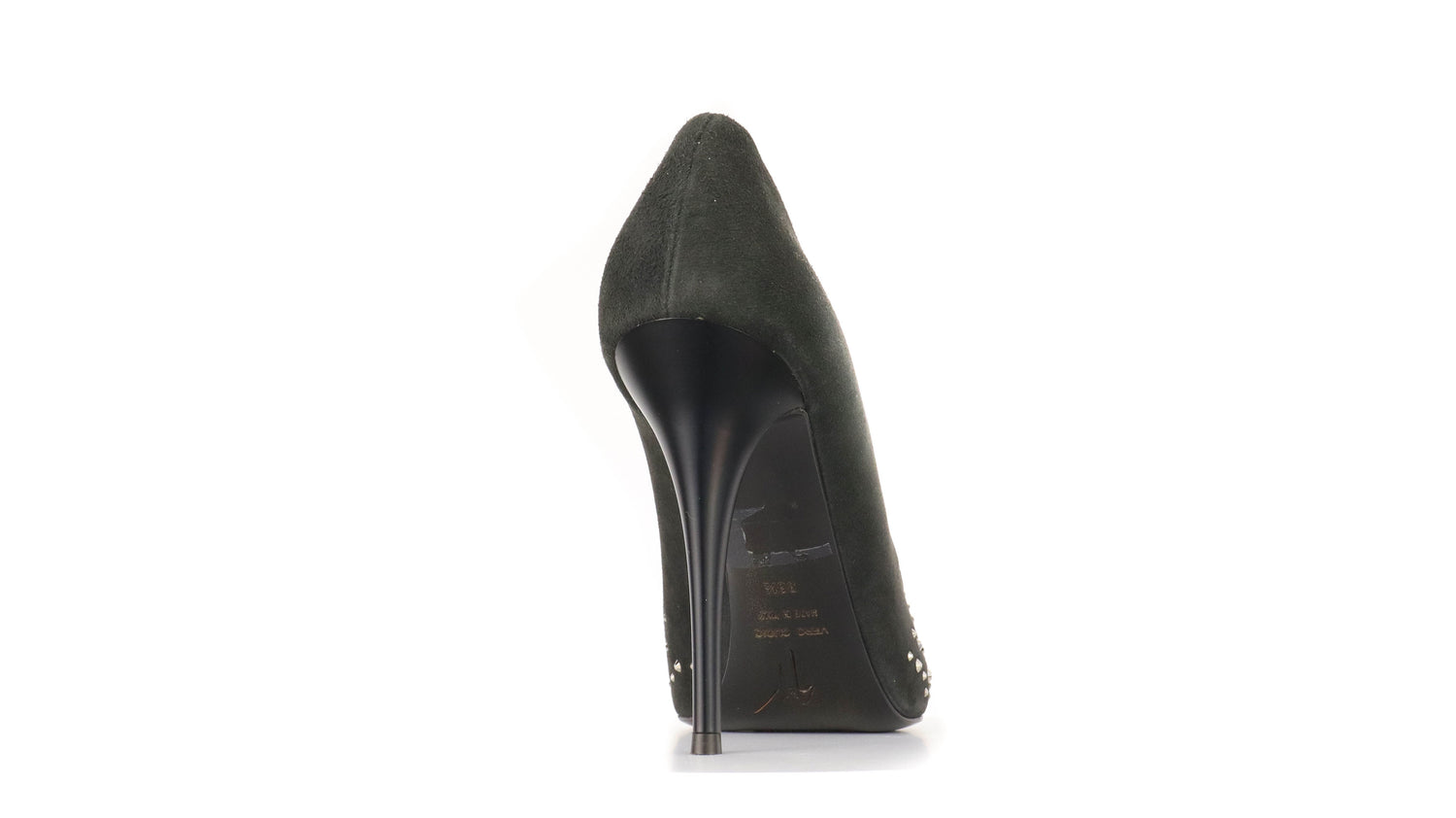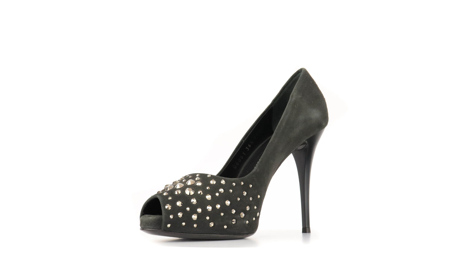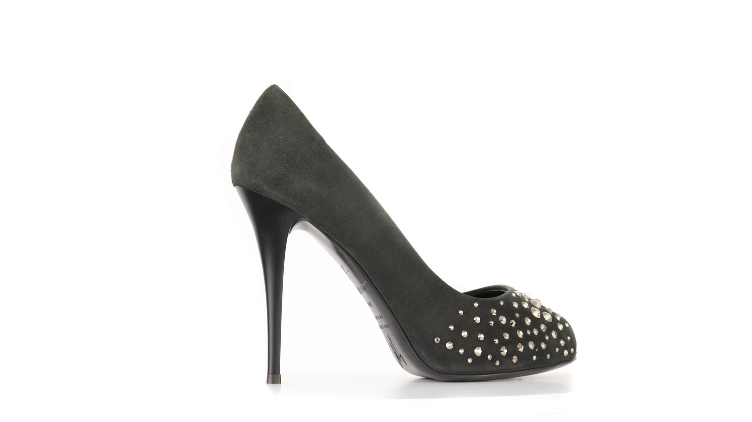 Tacones Giuseppe Zanotti, elaborados en gamuza color negro, con detalles de estoperoles en la parte frontal.