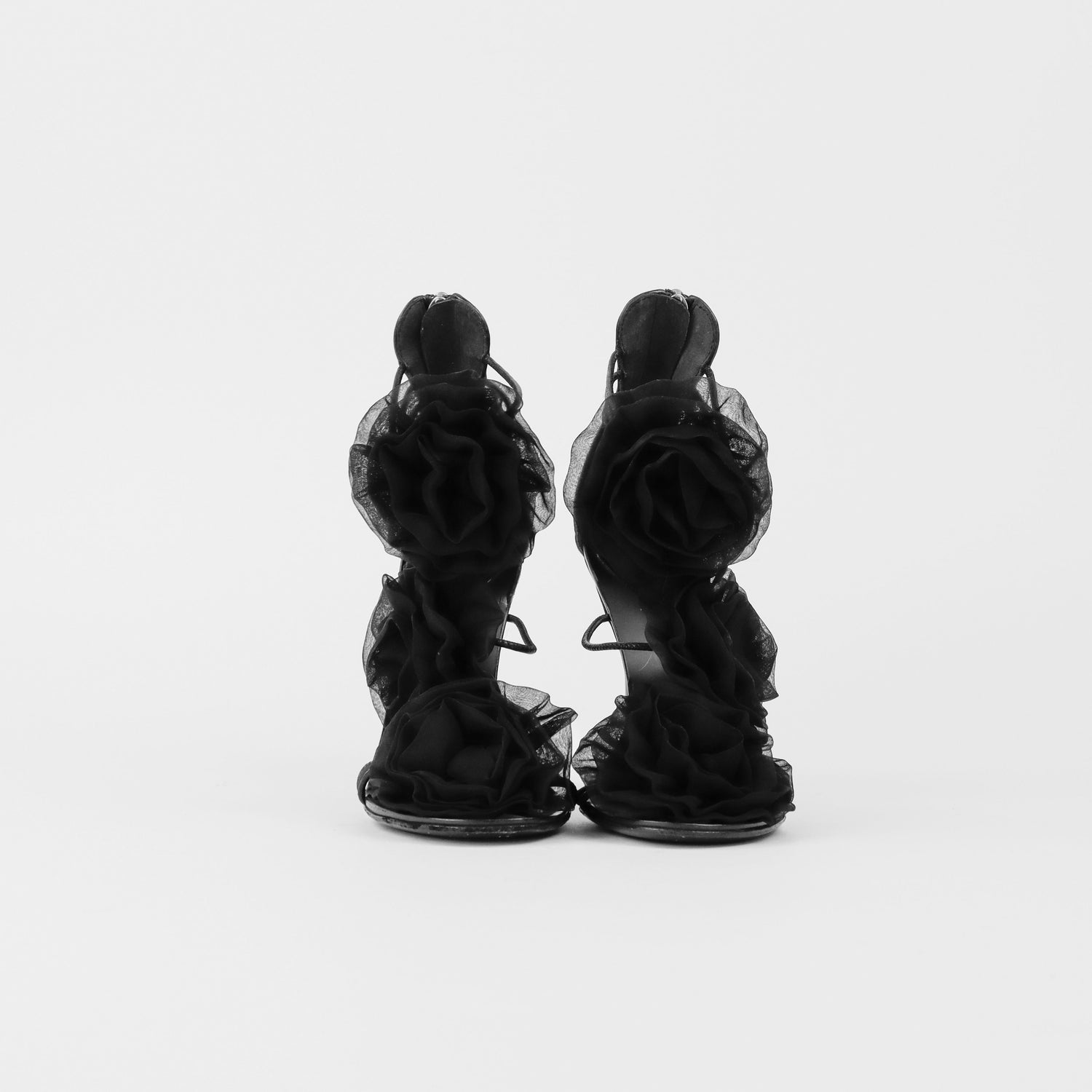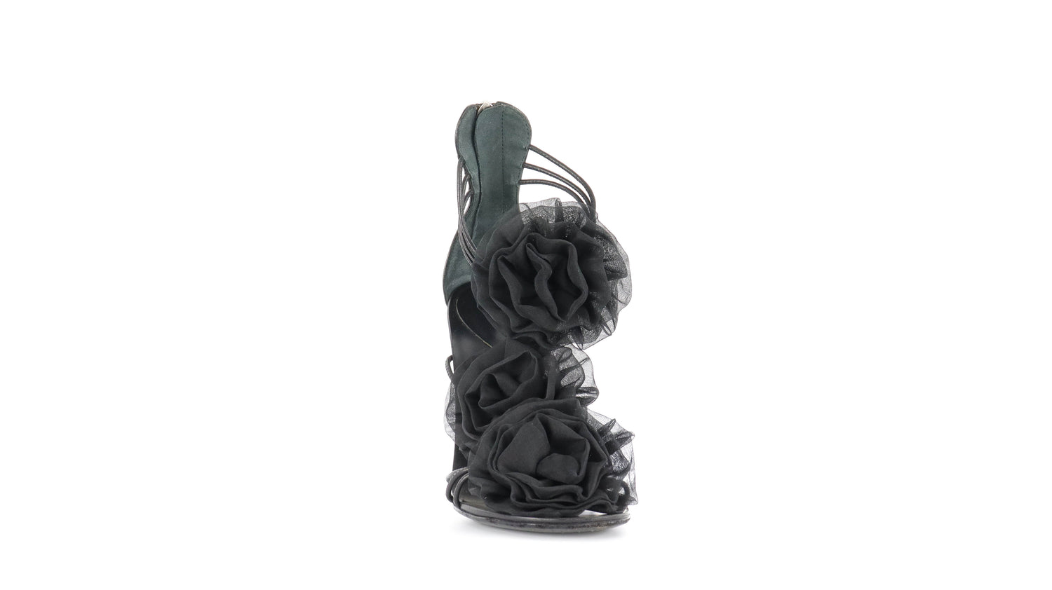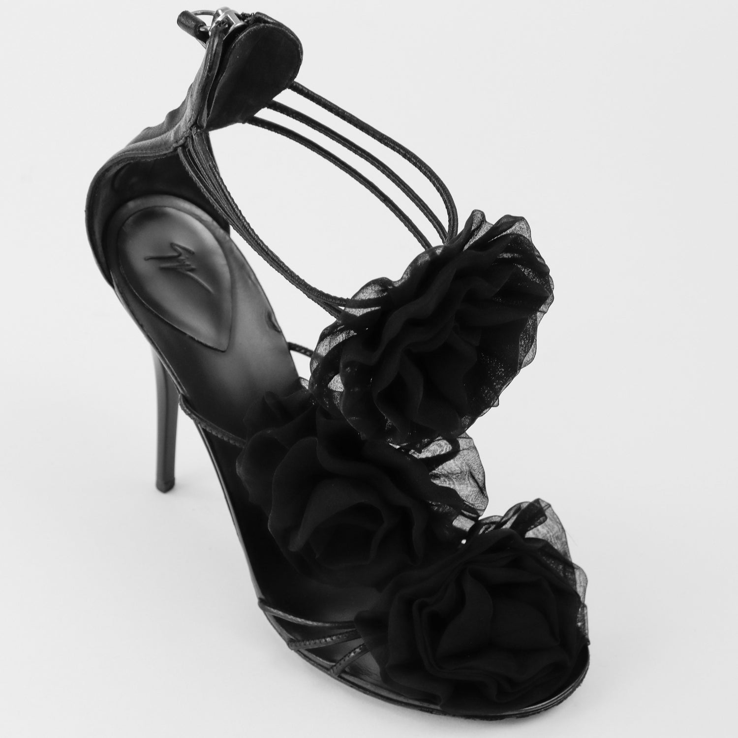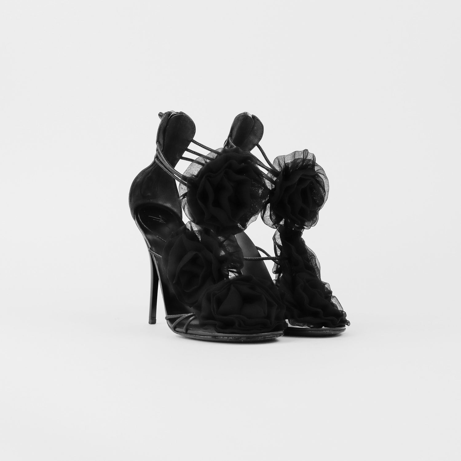 Sandalias de tacón marca Giuseppe Zanotti, confeccionadas en piel negra elegantemente adornadas con flores de tela en el mismo tono, ajustables con cierre de cremallera en la parte posterior.