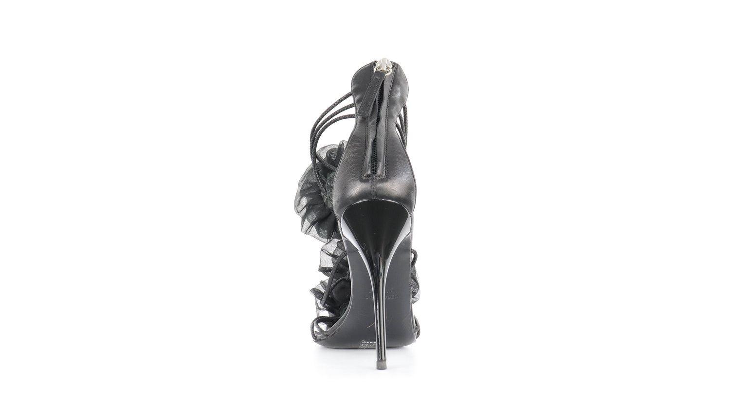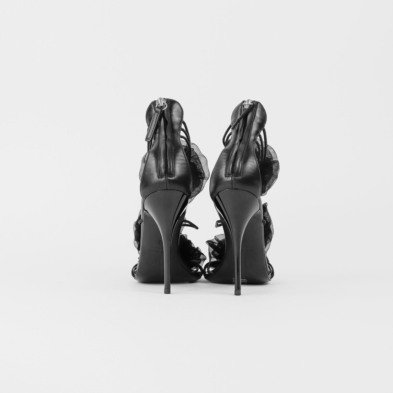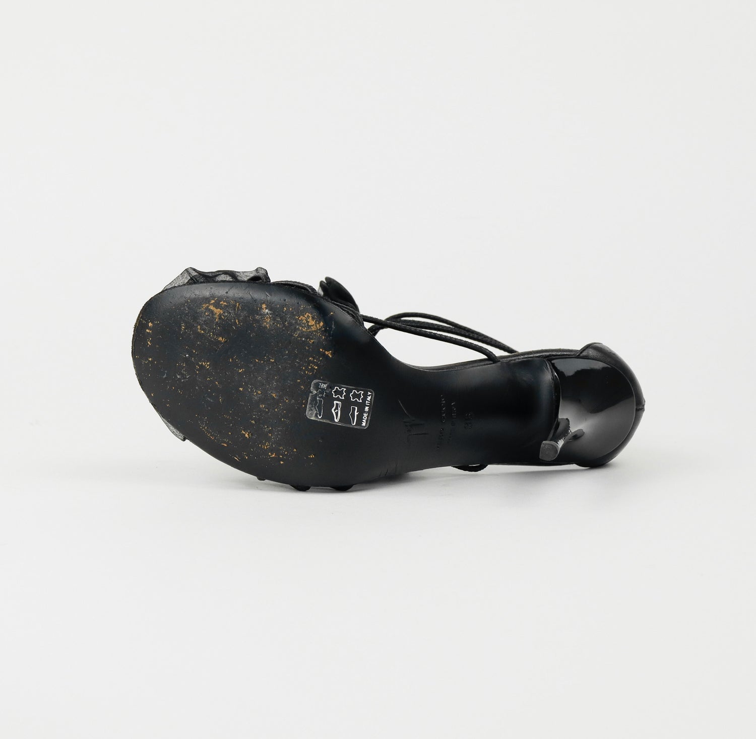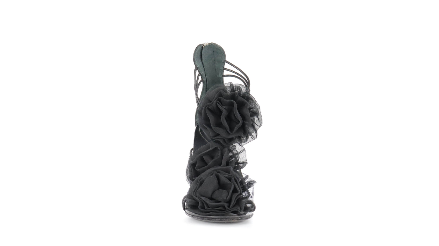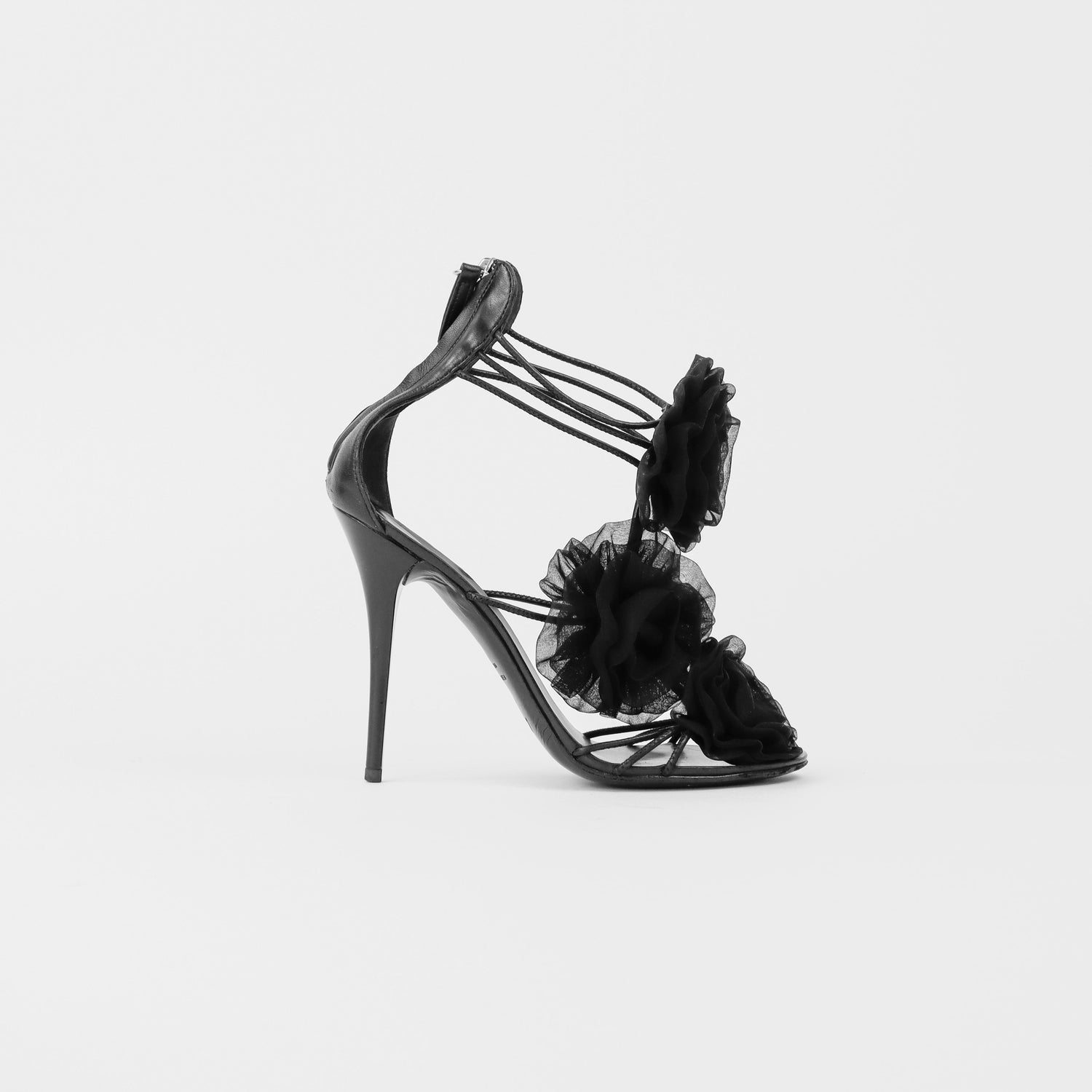 Sandalias de tacón marca Giuseppe Zanotti, confeccionadas en piel negra elegantemente adornadas con flores de tela en el mismo tono, ajustables con cierre de cremallera en la parte posterior.