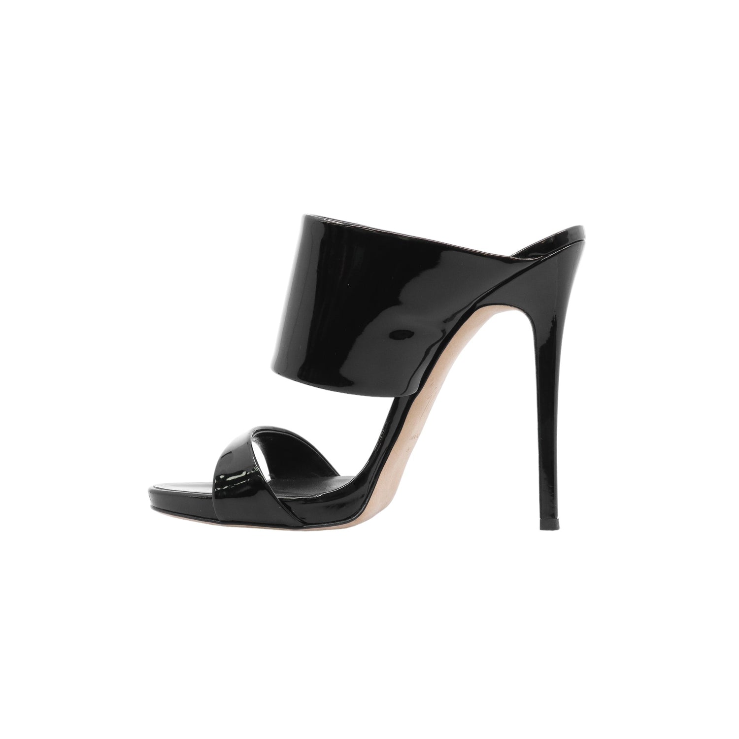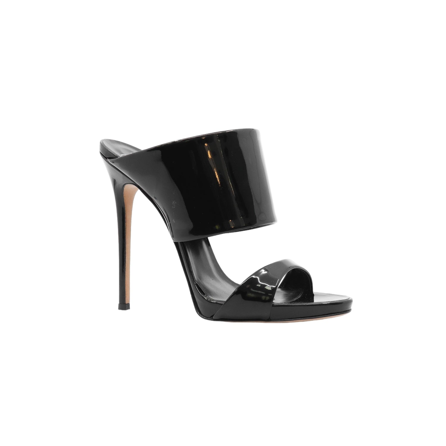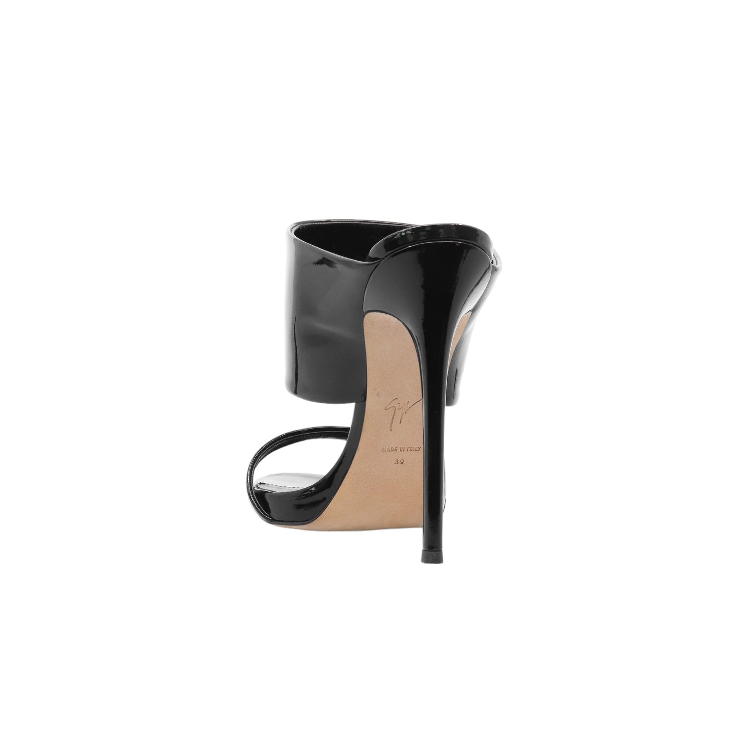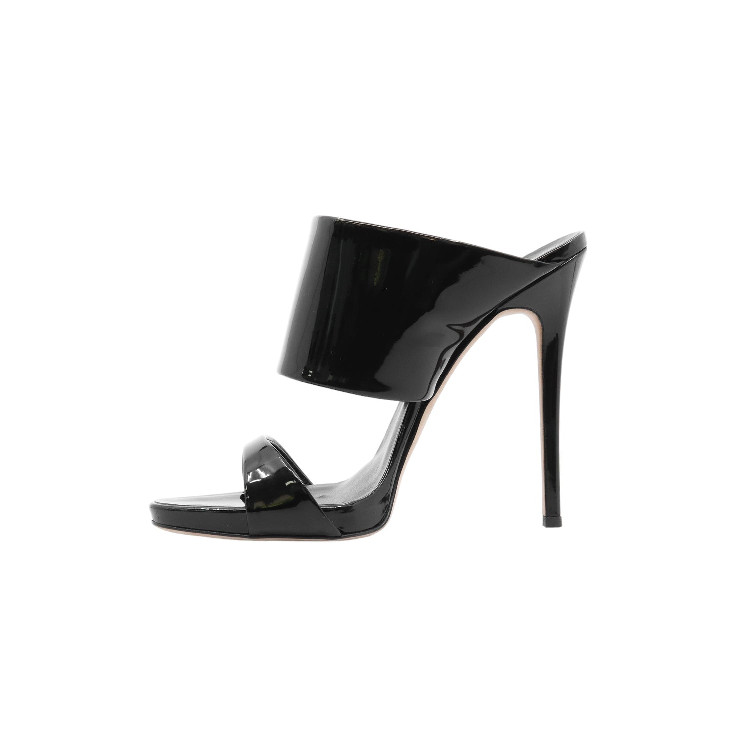 Sandalias con tacón de la marca Giuseppe Zanotti, modelo Andrea, confeccionados en charol color negro, con puntera abierta y cinta al empine, prácticamente nuevos. (Talla 39 Reducido, 5 MX)