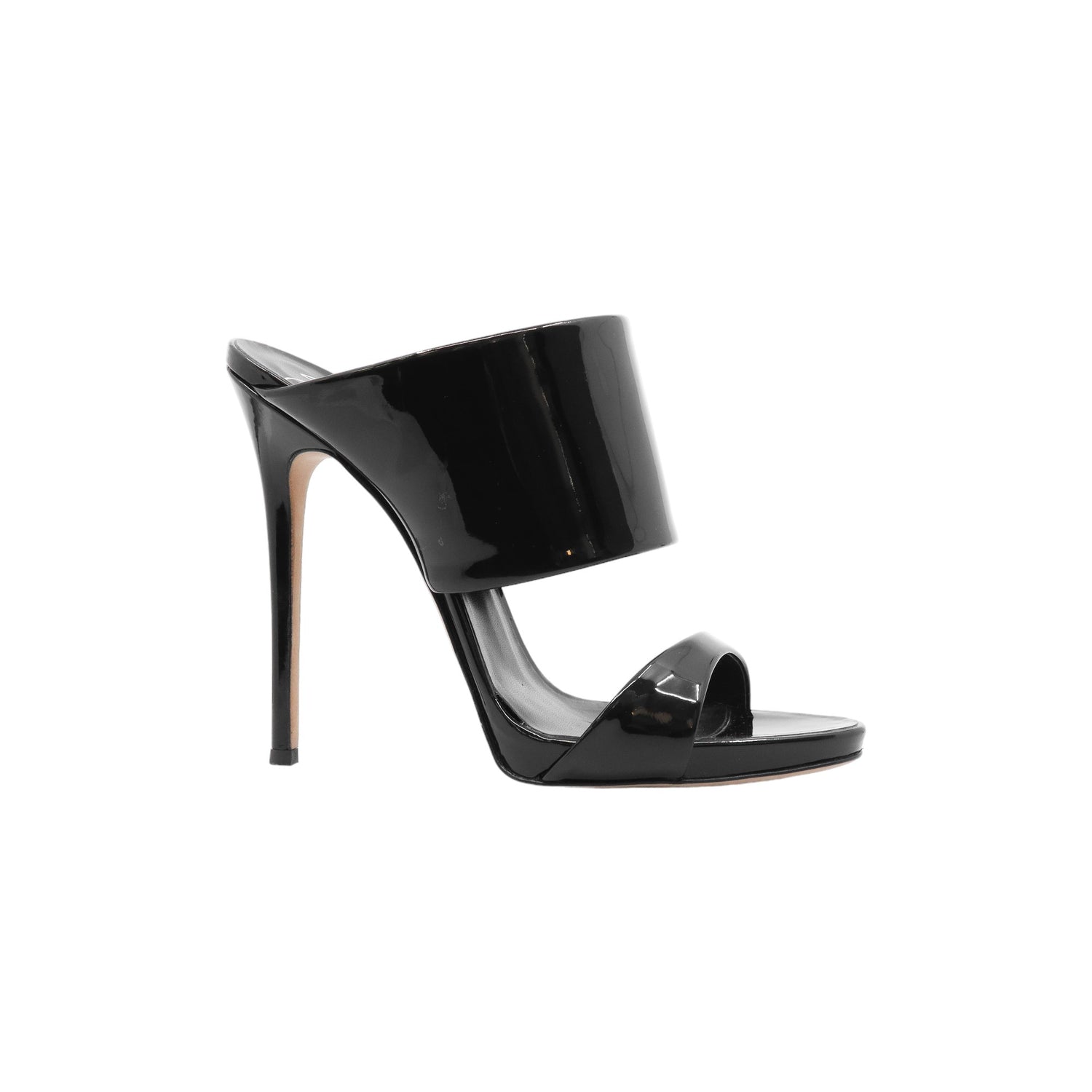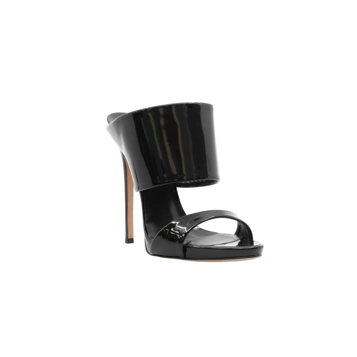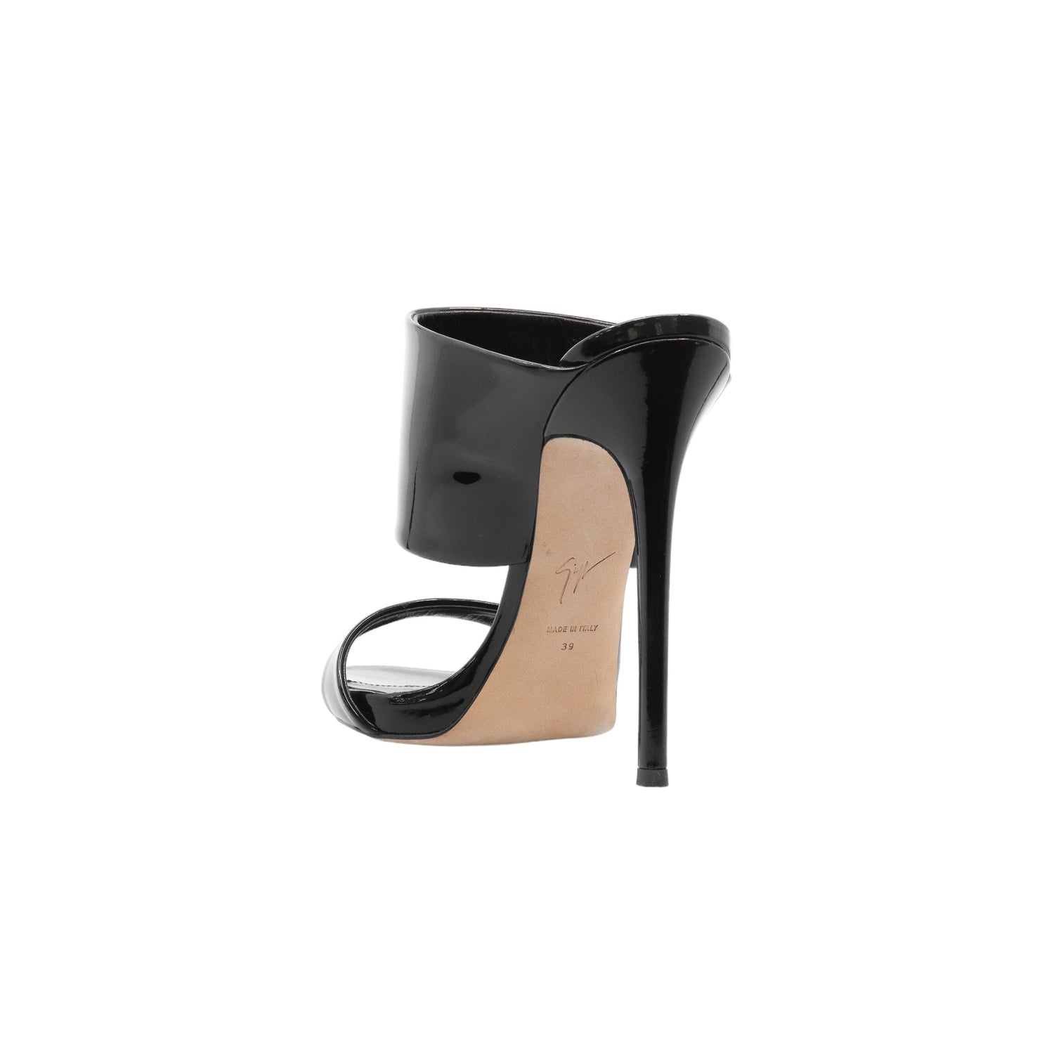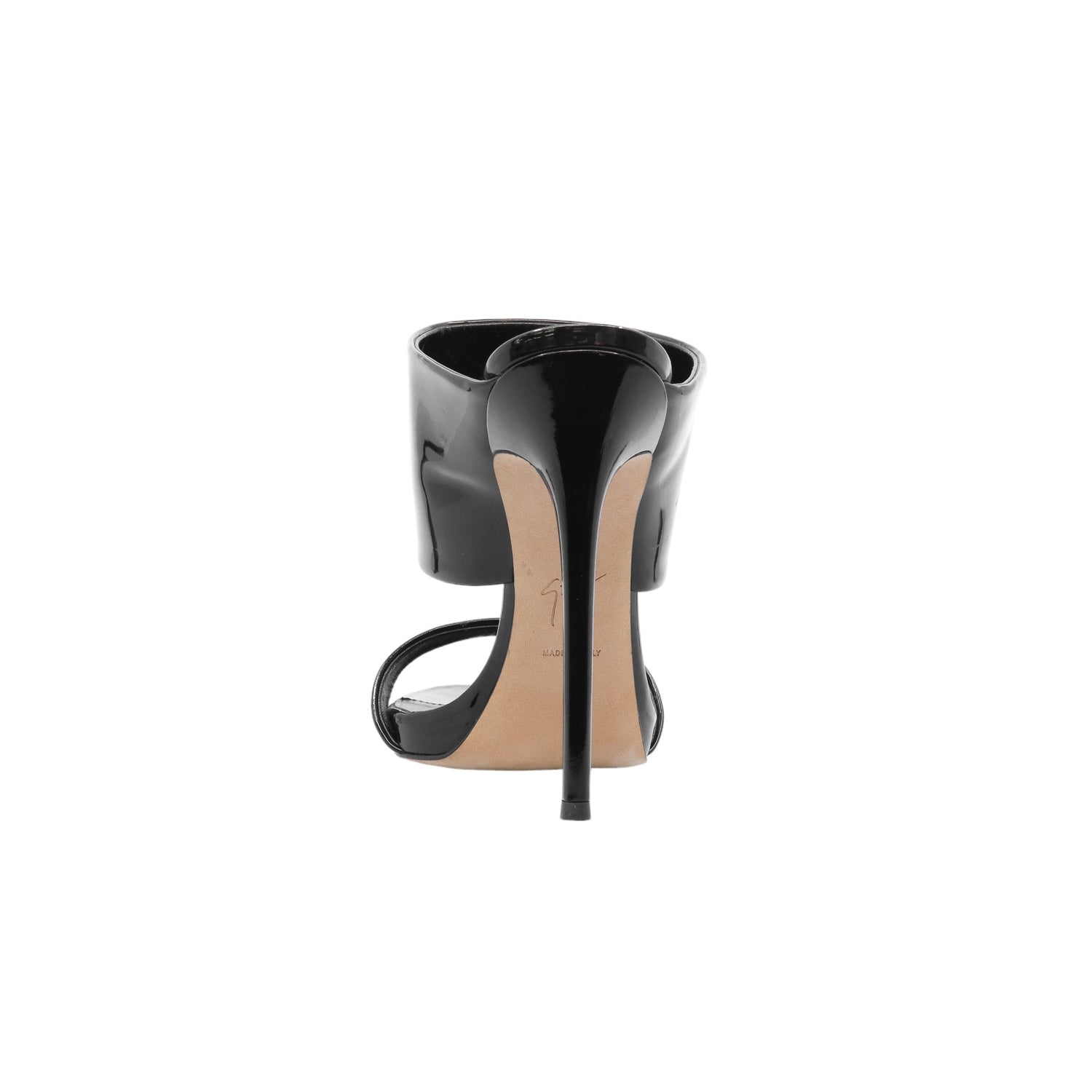 Sandalias con tacón de la marca Giuseppe Zanotti, modelo Andrea, confeccionados en charol color negro, con puntera abierta y cinta al empine, prácticamente nuevos. (Talla 39 Reducido, 5 MX)