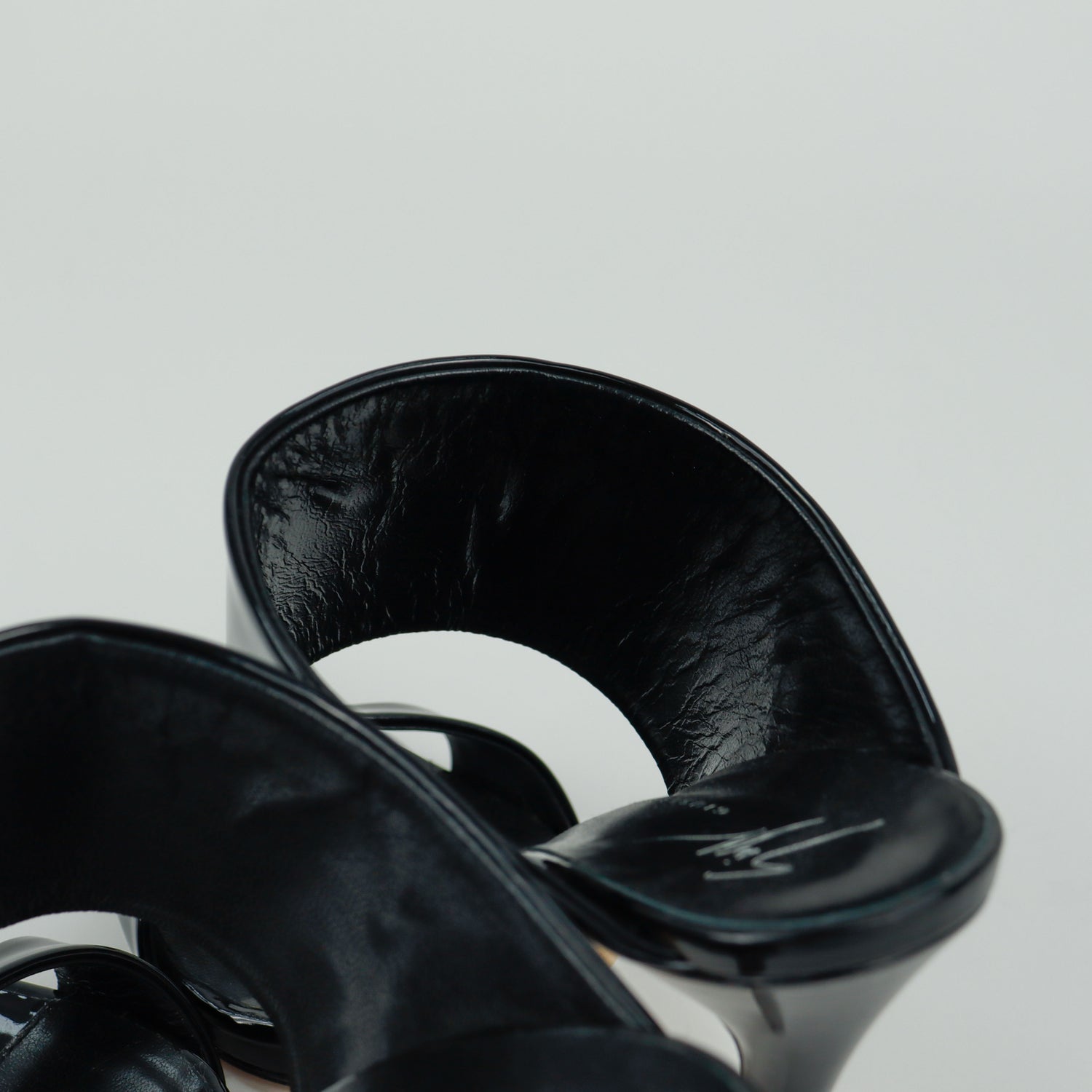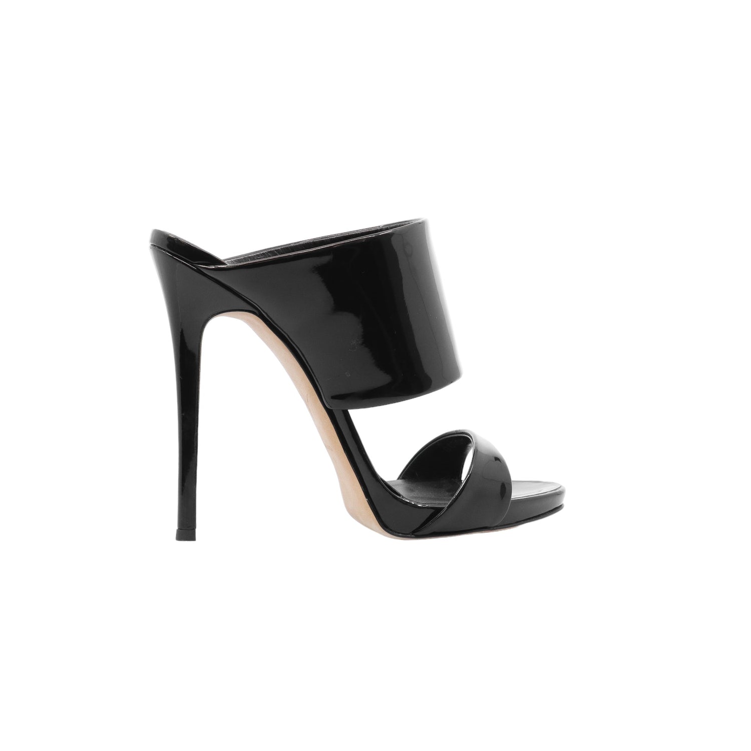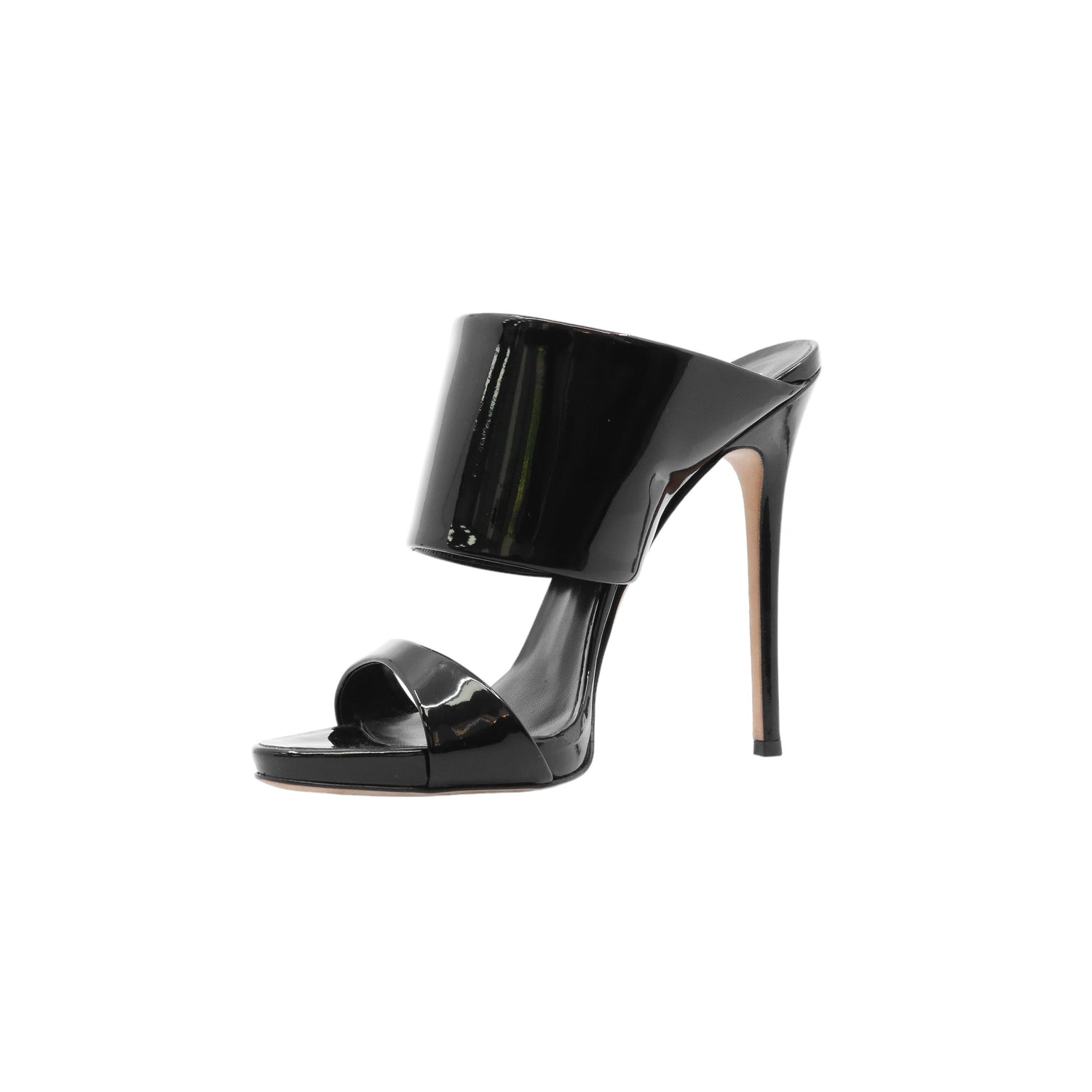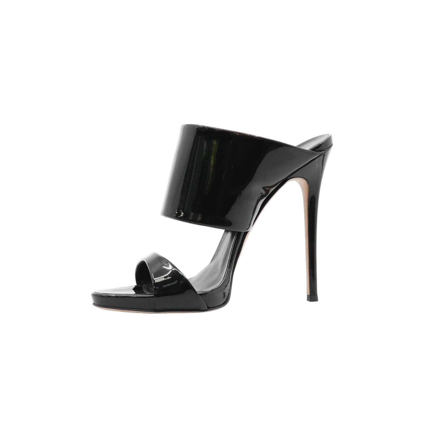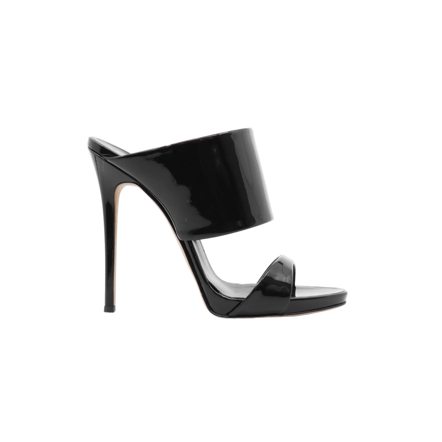 Sandalias con tacón de la marca Giuseppe Zanotti, modelo Andrea, confeccionados en charol color negro, con puntera abierta y cinta al empine, prácticamente nuevos. (Talla 39 Reducido, 5 MX)