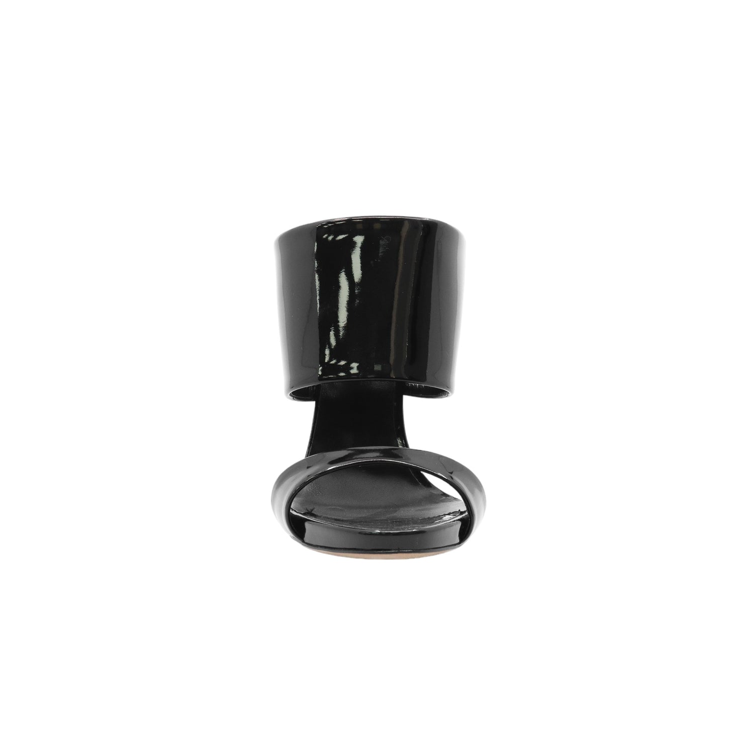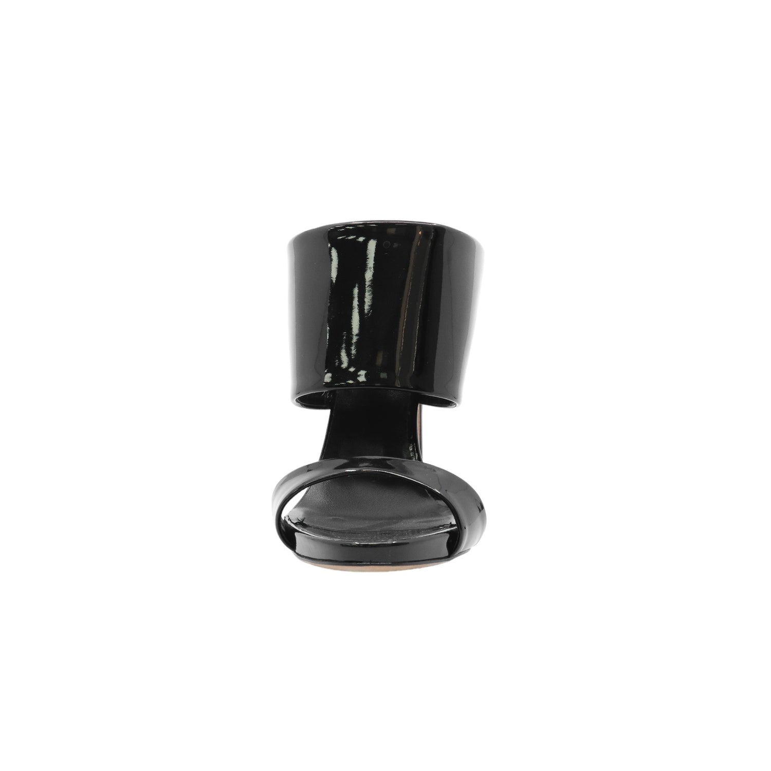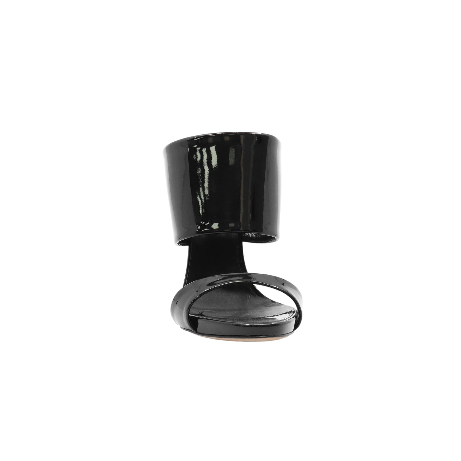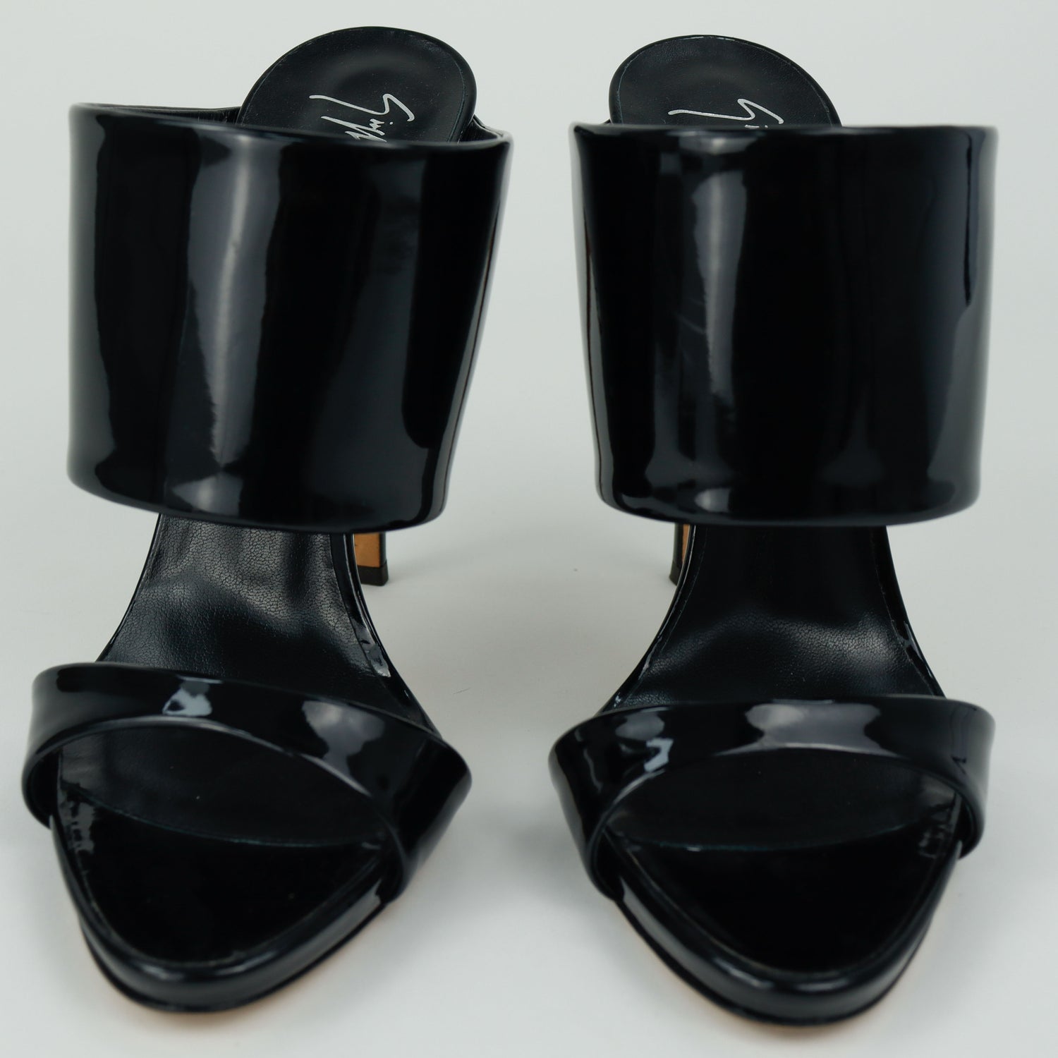 Sandalias con tacón de la marca Giuseppe Zanotti, modelo Andrea, confeccionados en charol color negro, con puntera abierta y cinta al empine, prácticamente nuevos. (Talla 39 Reducido, 5 MX)