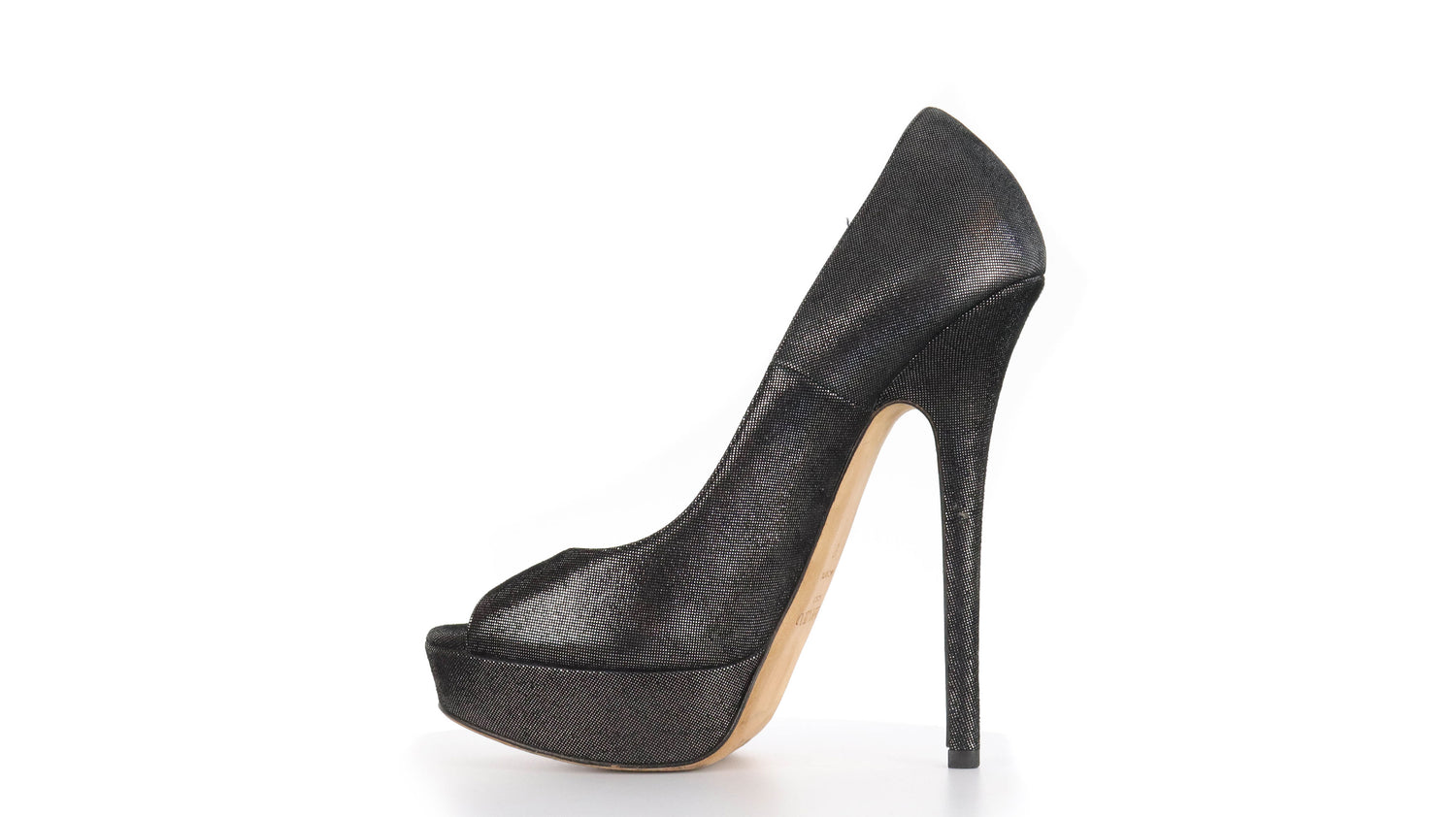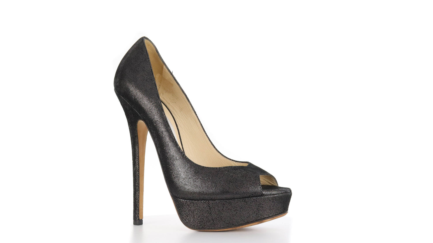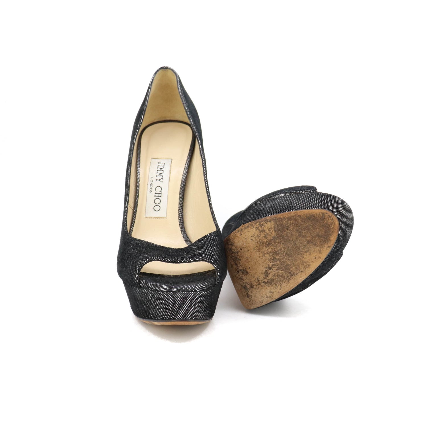 Tacones Jimmy Choo, elaborados en tela color negro y efecto metálico.
