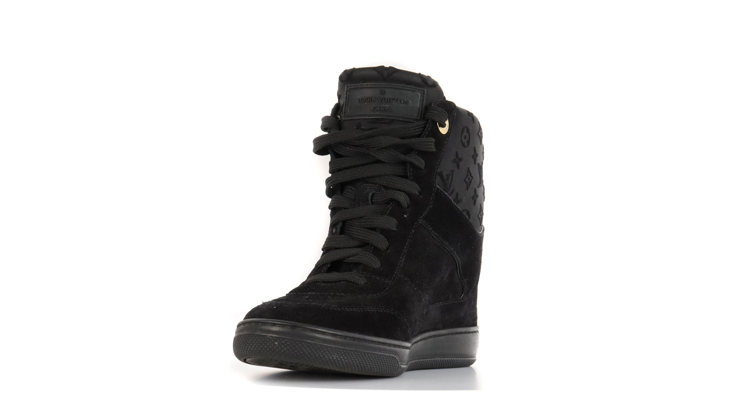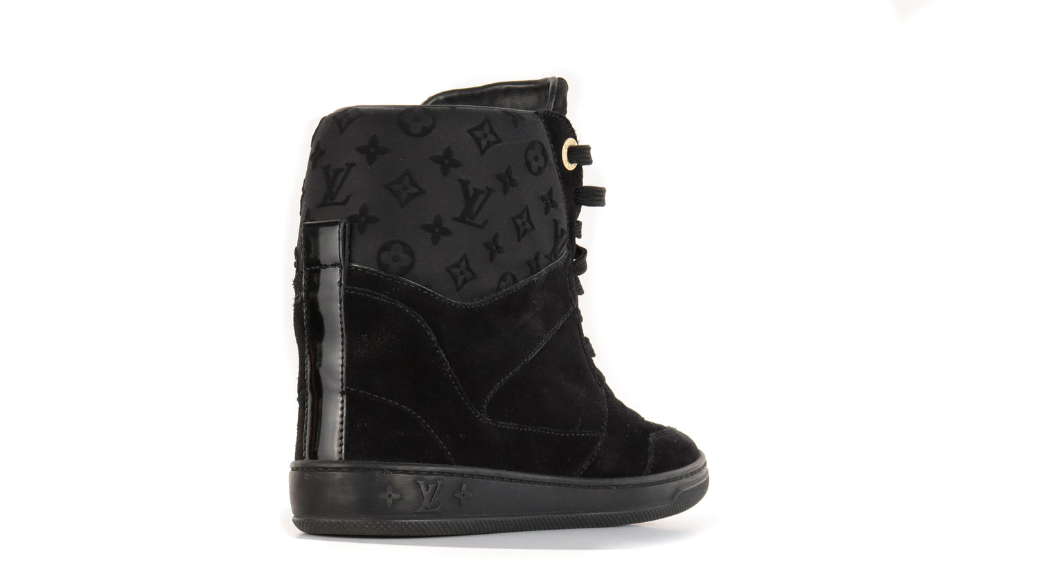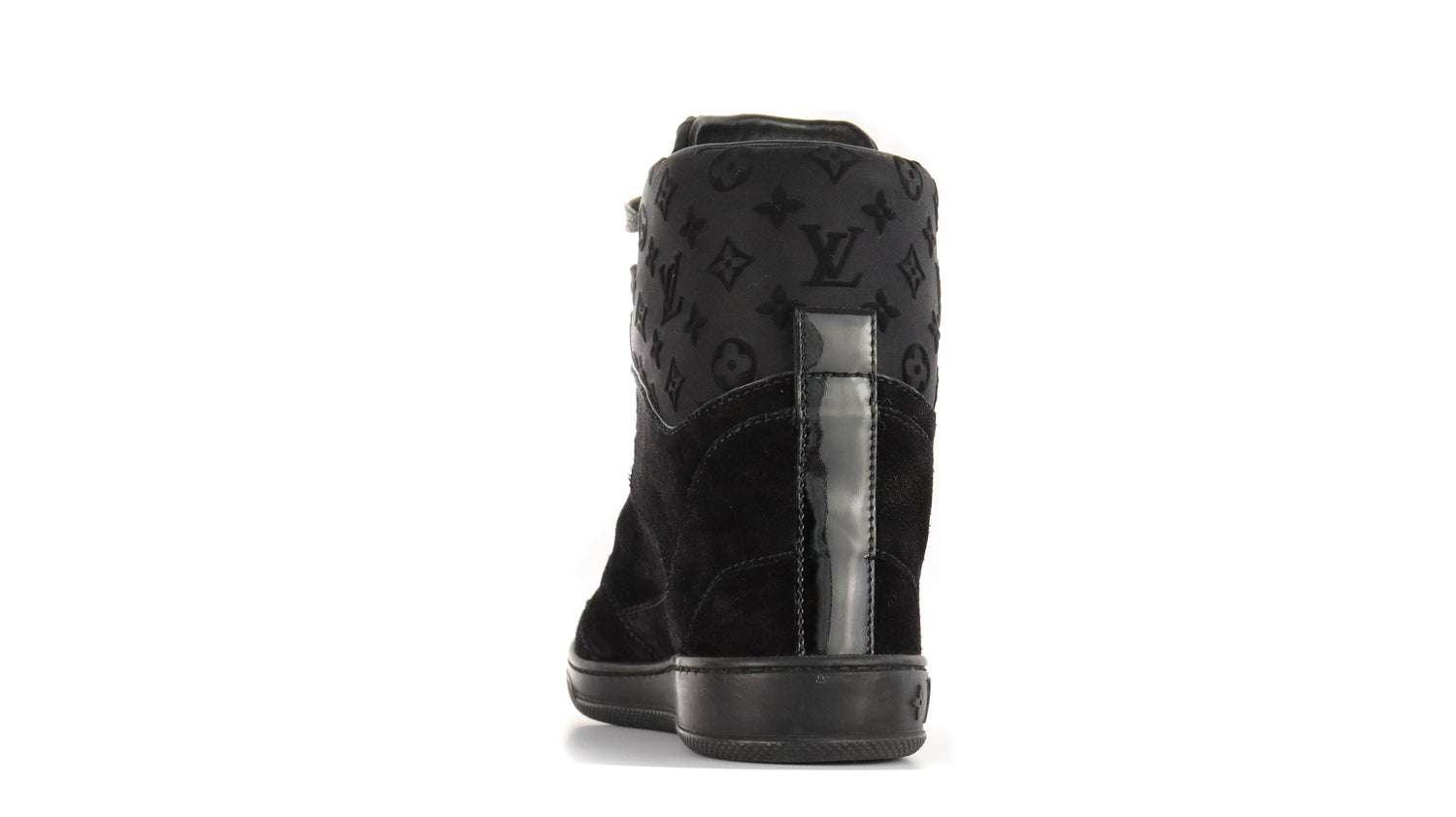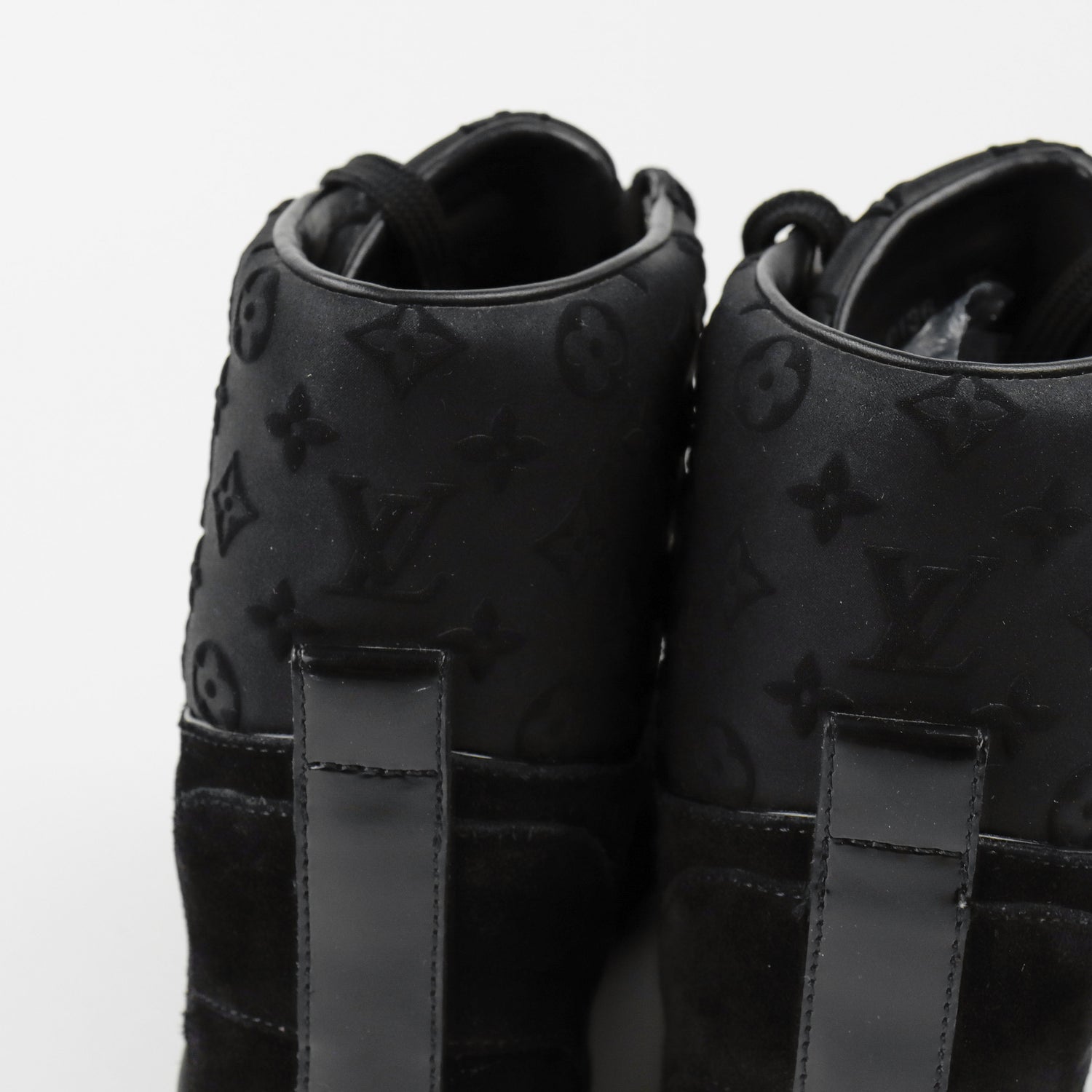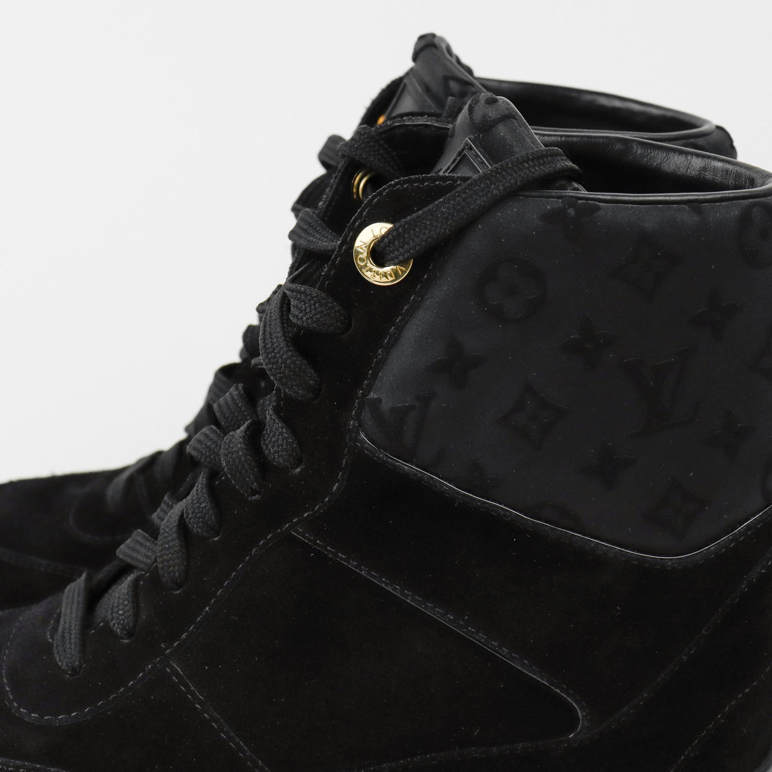Sneakers para dama Louis Vuitton, elaborados en gamuza negra y tela Monogram en el mismo tono, puntera redonda cerrada, detalle de charol en la parte trasera y ajustable a base de agujetas, detalles en metal dorado con la marca grabada.