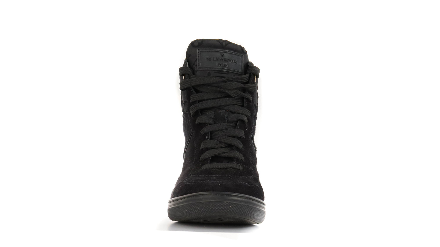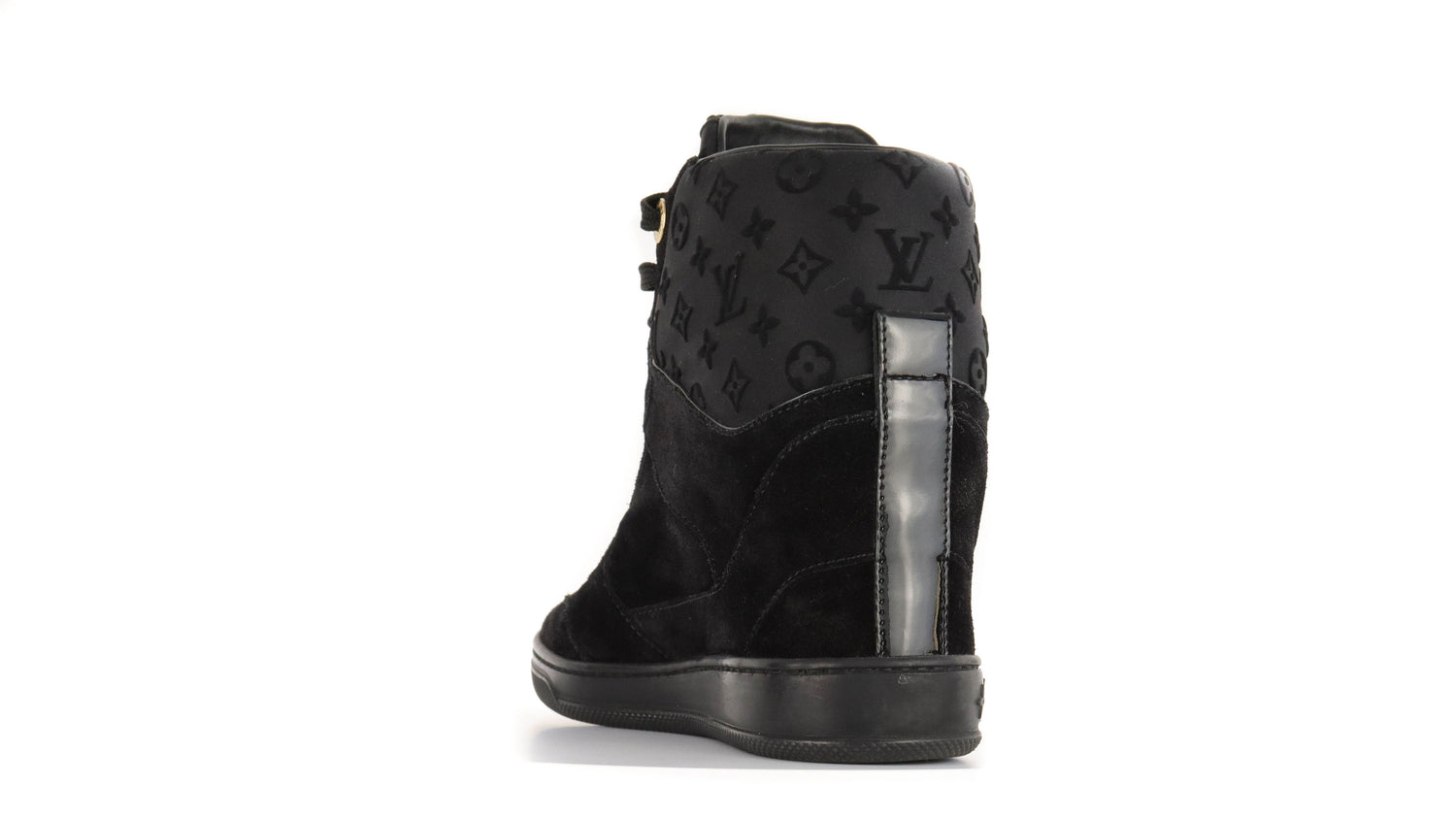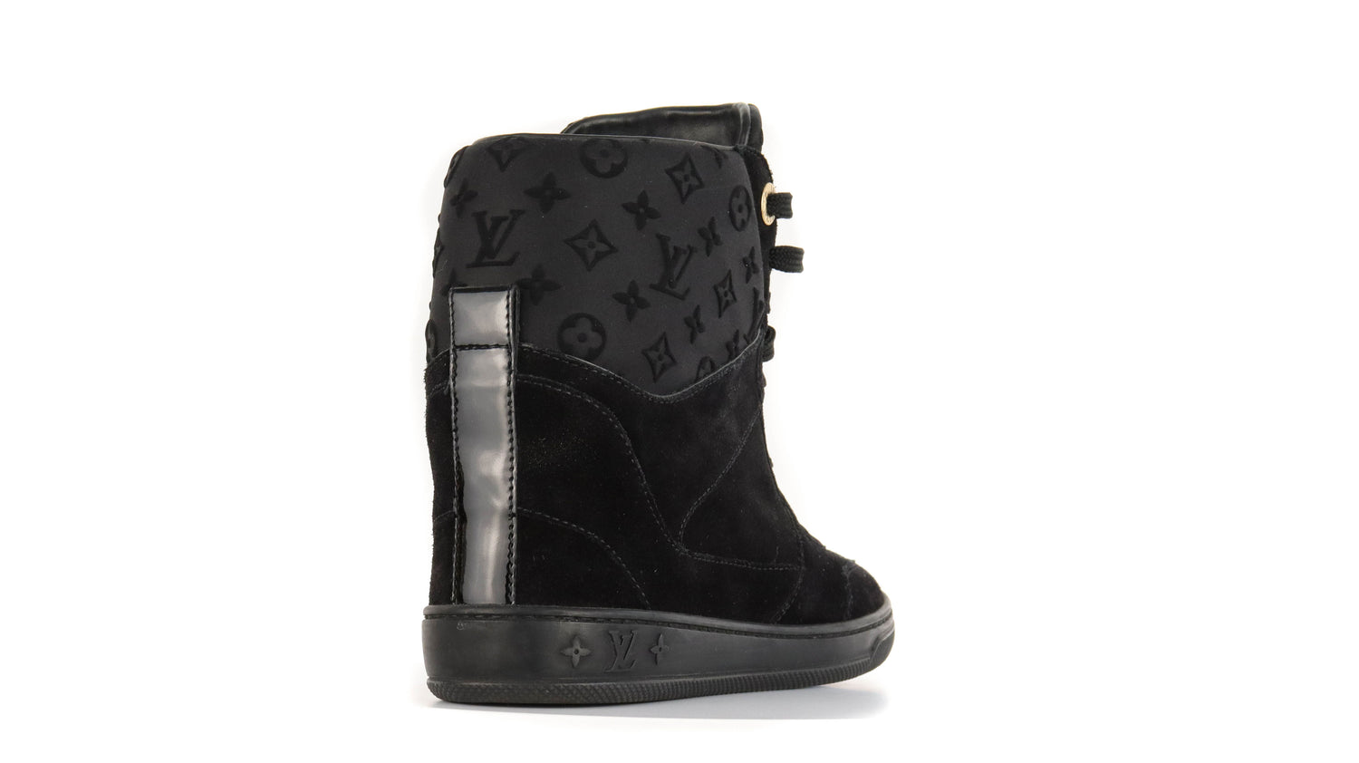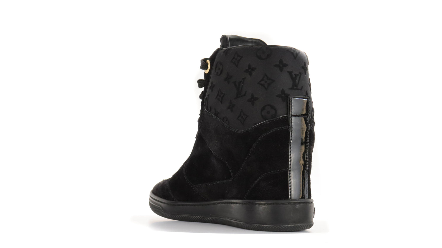 Sneakers para dama Louis Vuitton, elaborados en gamuza negra y tela Monogram en el mismo tono, puntera redonda cerrada, detalle de charol en la parte trasera y ajustable a base de agujetas, detalles en metal dorado con la marca grabada.