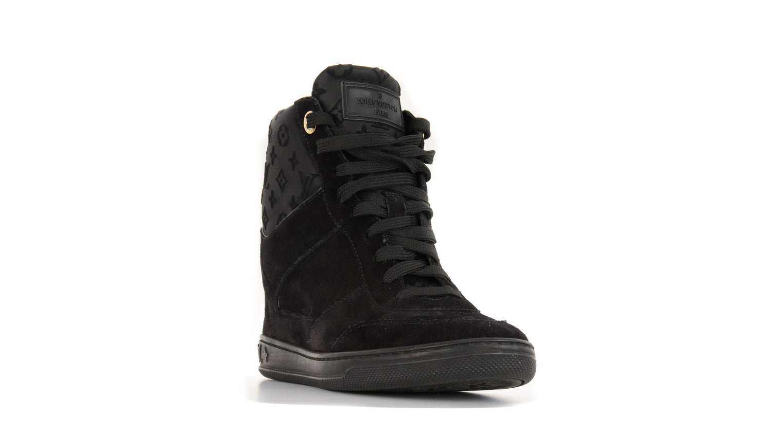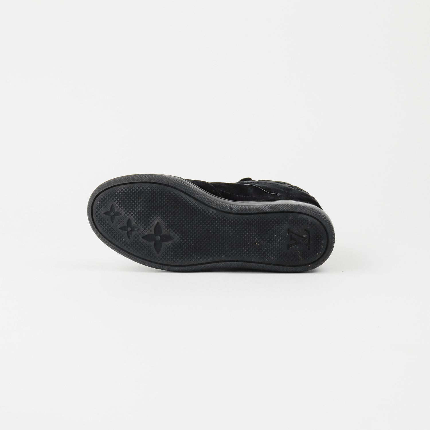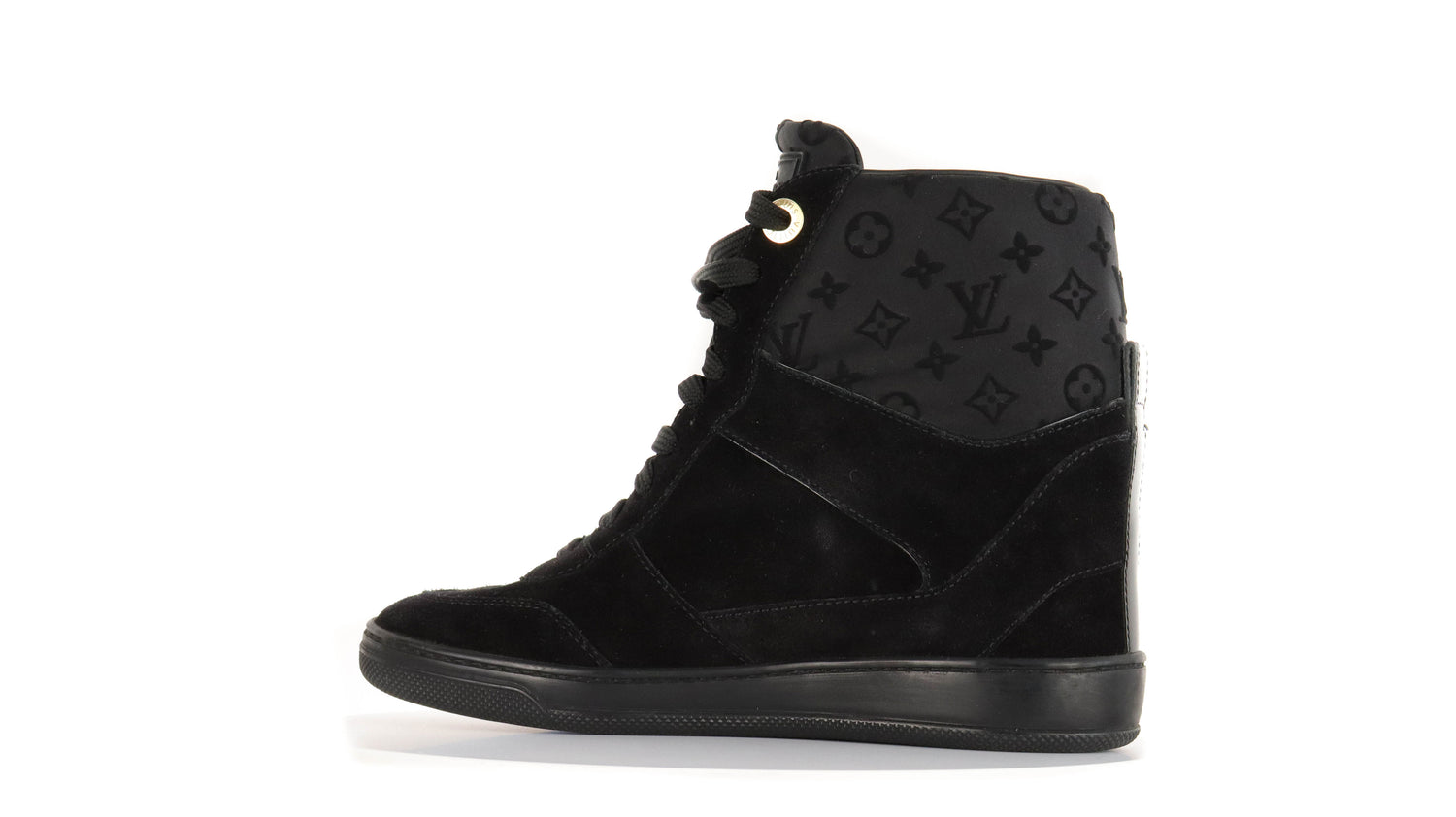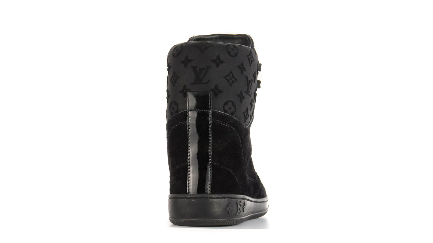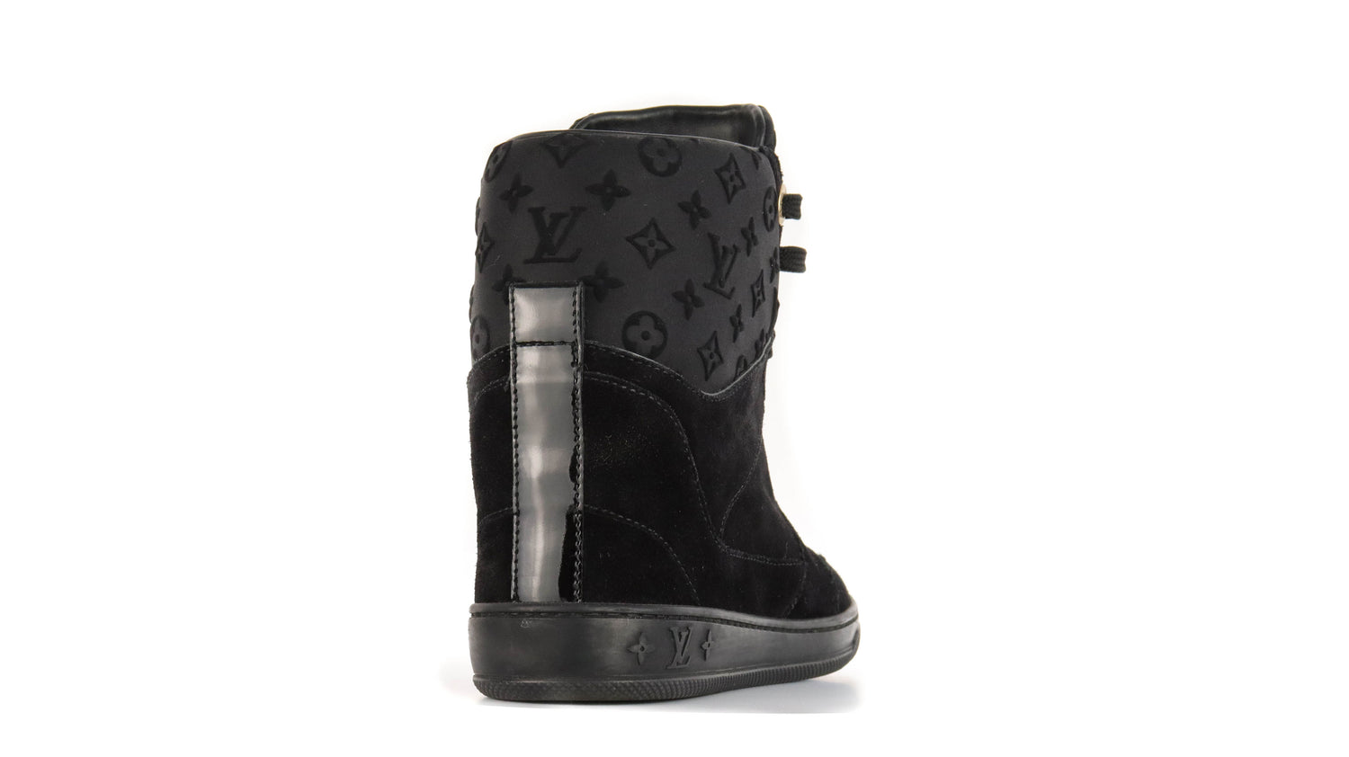 Sneakers para dama Louis Vuitton, elaborados en gamuza negra y tela Monogram en el mismo tono, puntera redonda cerrada, detalle de charol en la parte trasera y ajustable a base de agujetas, detalles en metal dorado con la marca grabada.