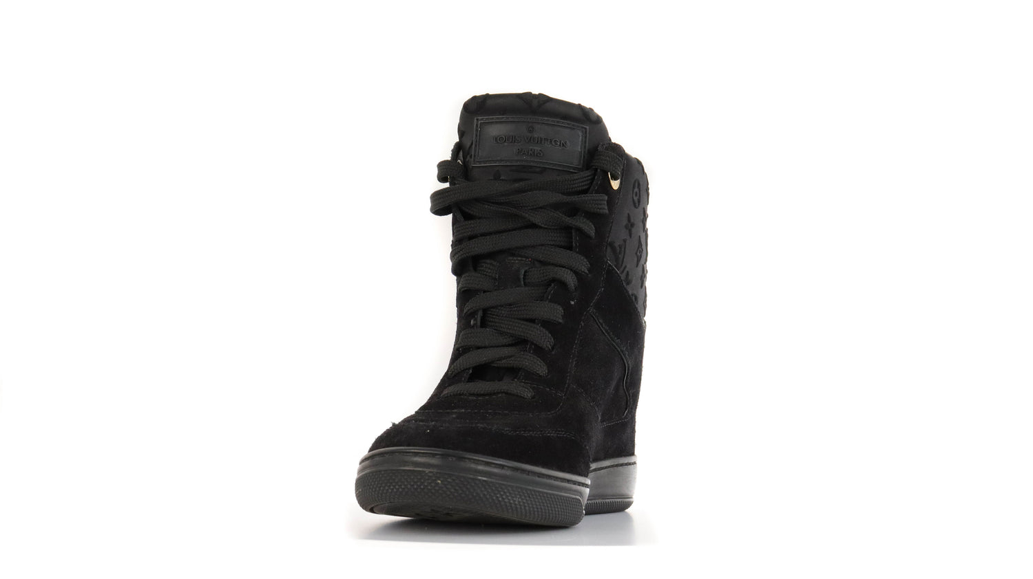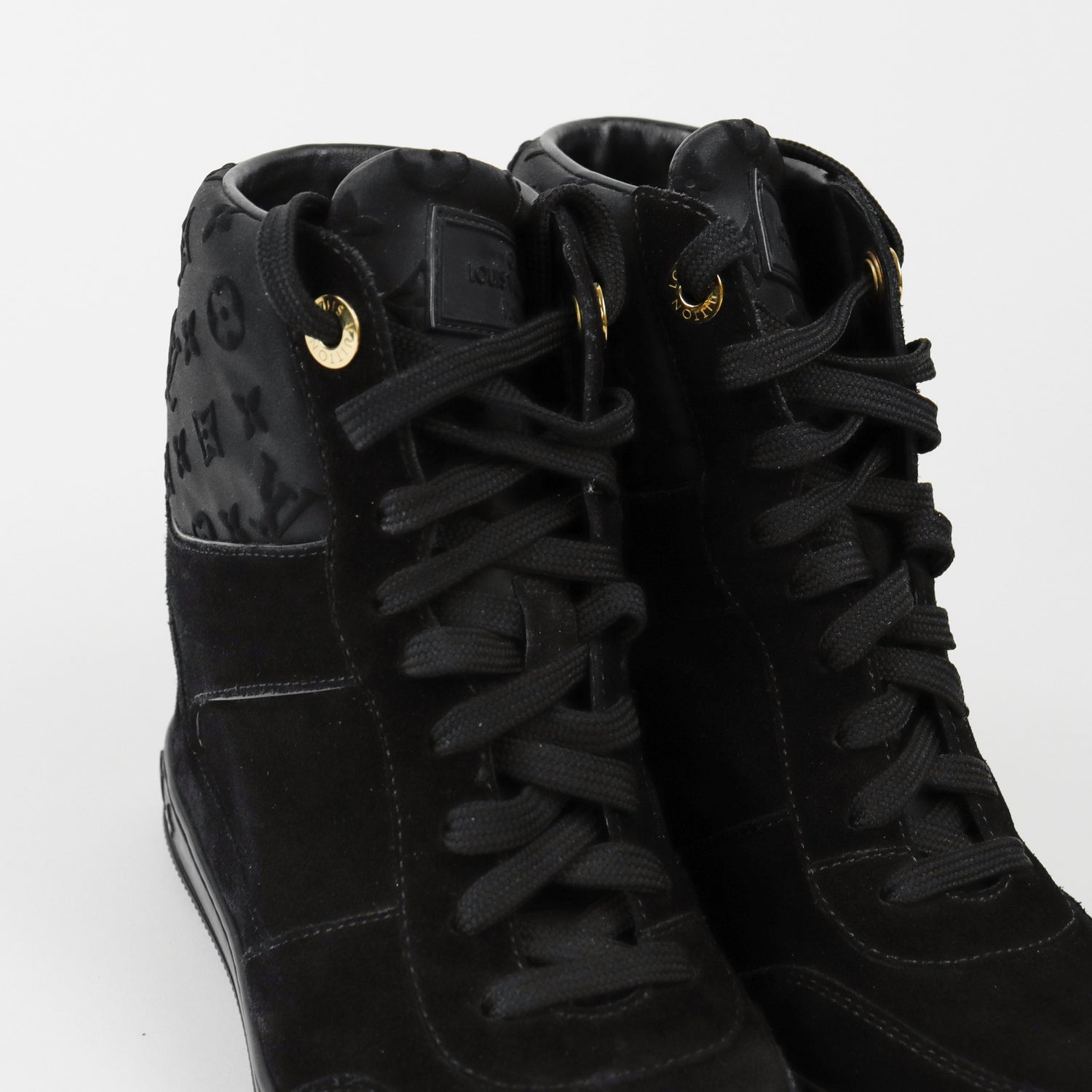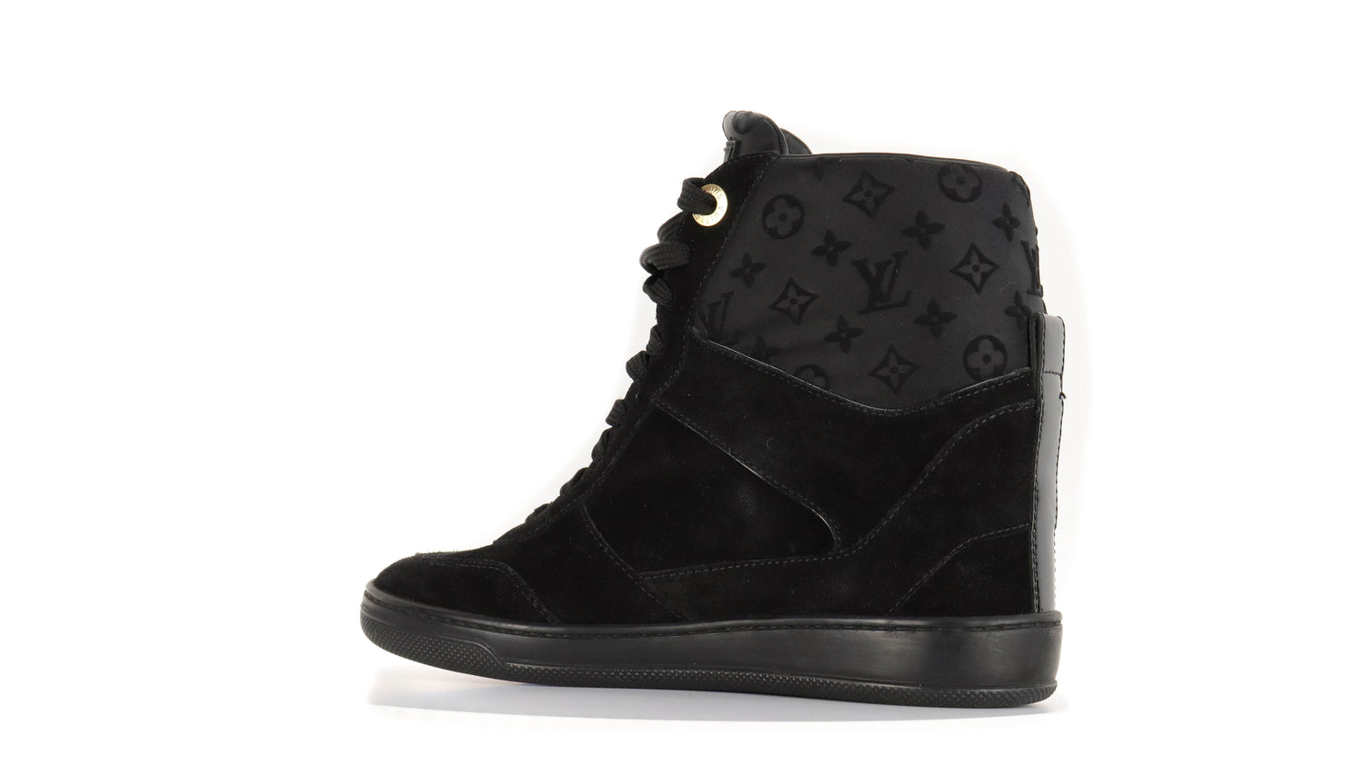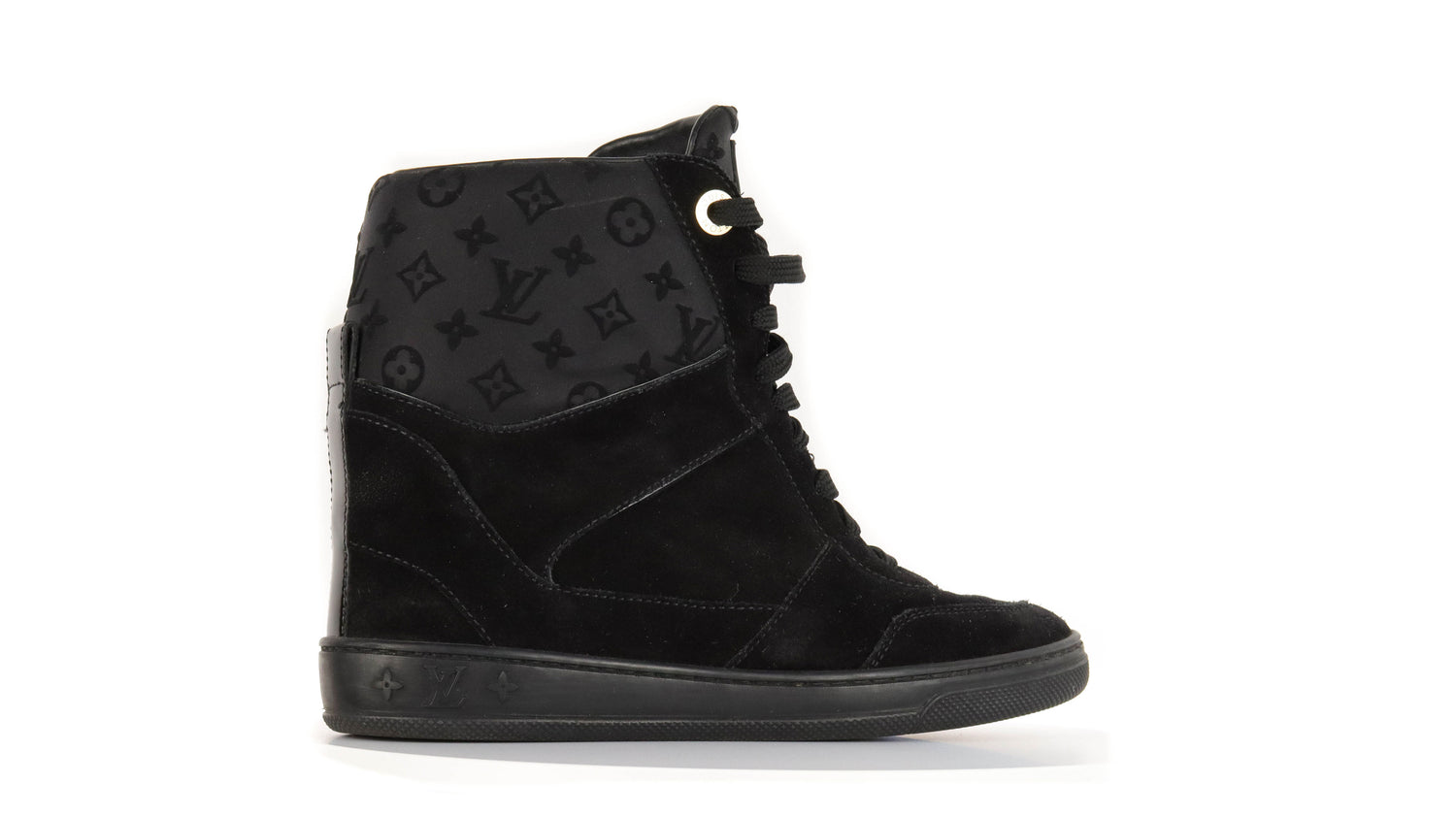 Sneakers para dama Louis Vuitton, elaborados en gamuza negra y tela Monogram en el mismo tono, puntera redonda cerrada, detalle de charol en la parte trasera y ajustable a base de agujetas, detalles en metal dorado con la marca grabada.