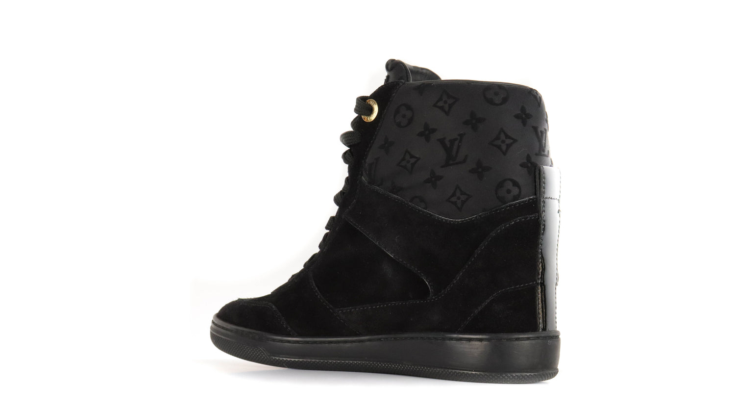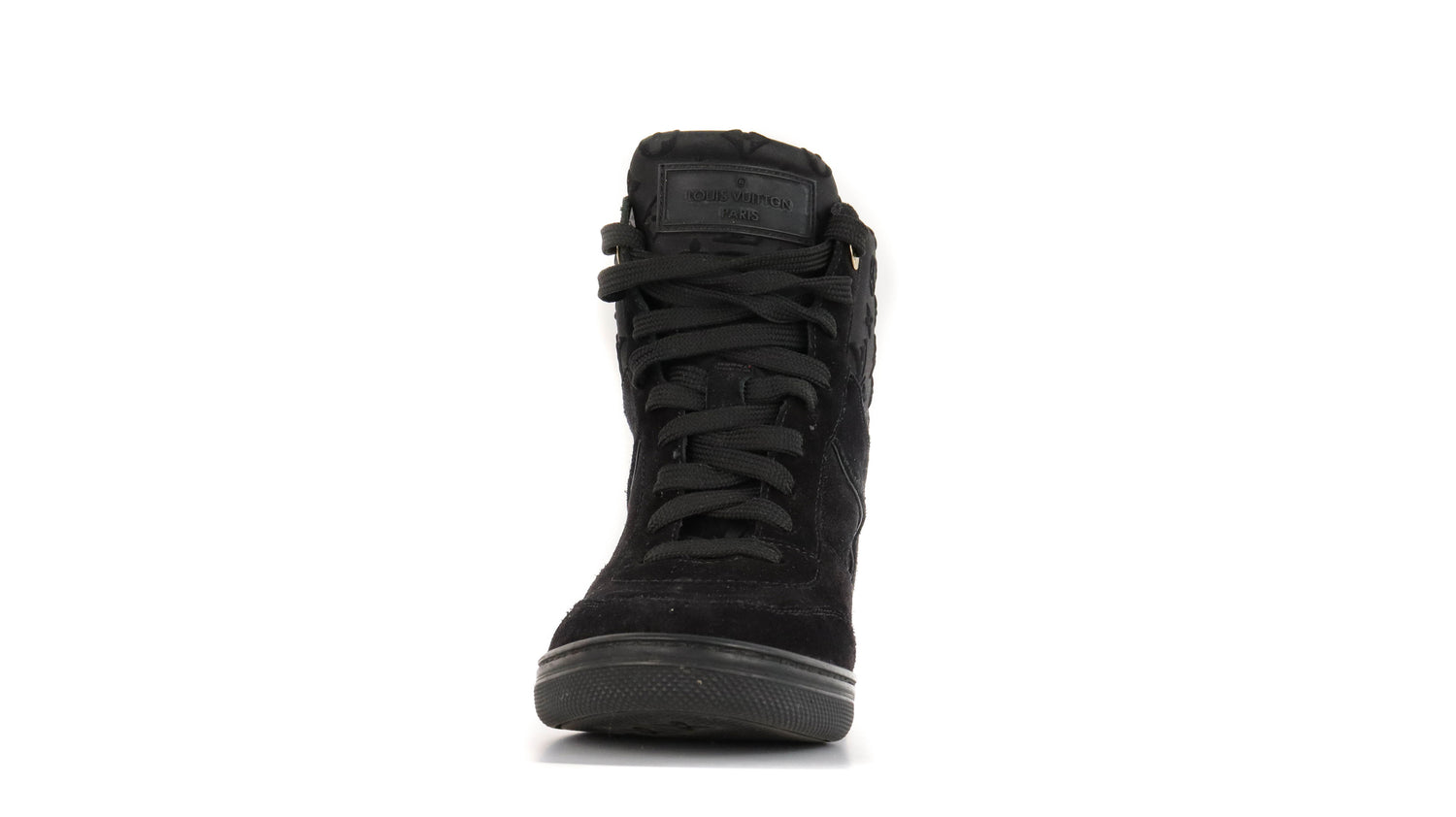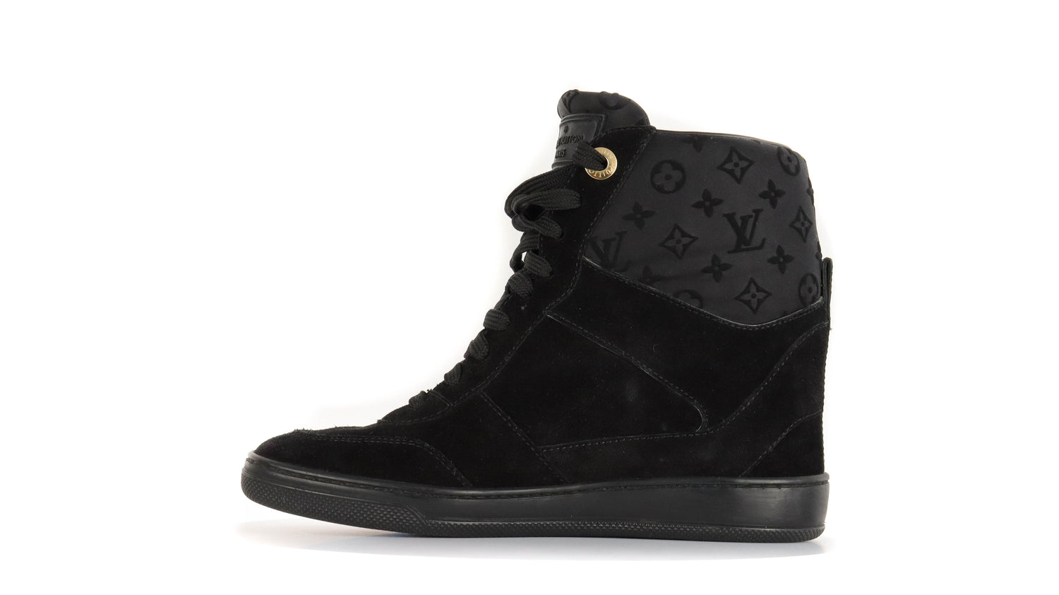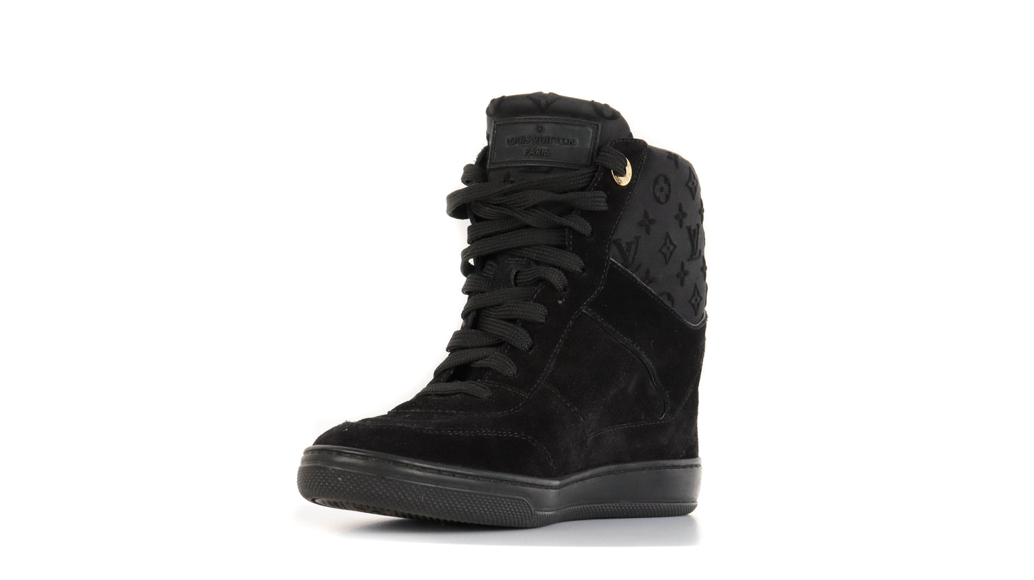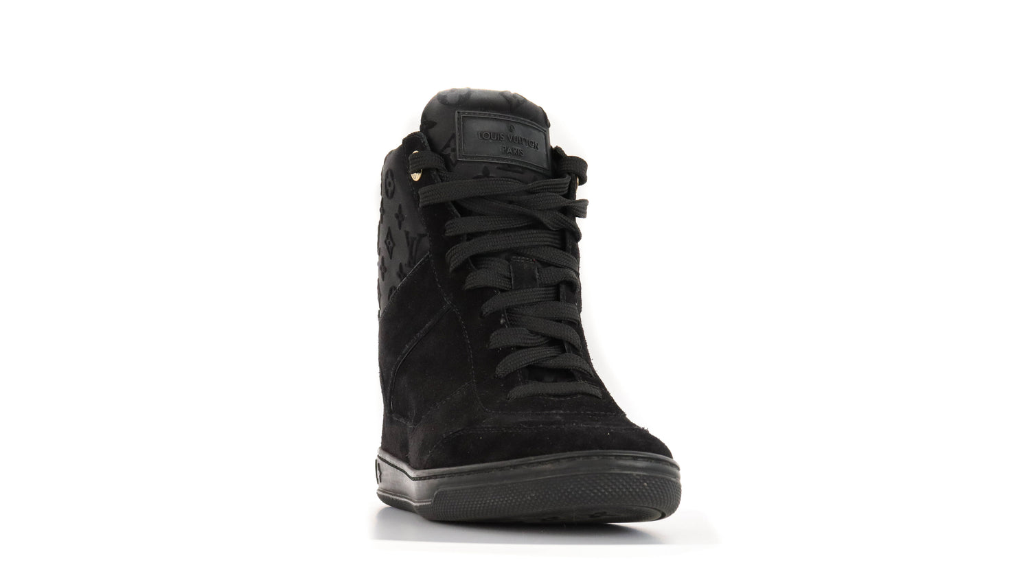 Sneakers para dama Louis Vuitton, elaborados en gamuza negra y tela Monogram en el mismo tono, puntera redonda cerrada, detalle de charol en la parte trasera y ajustable a base de agujetas, detalles en metal dorado con la marca grabada.