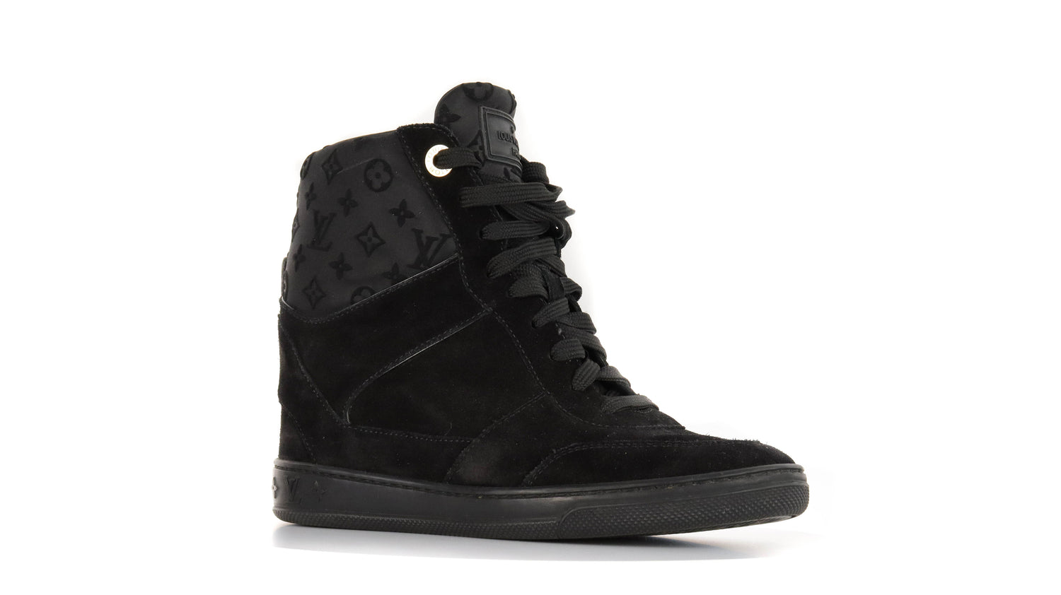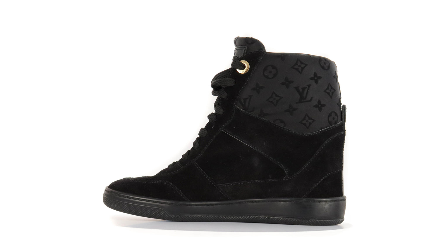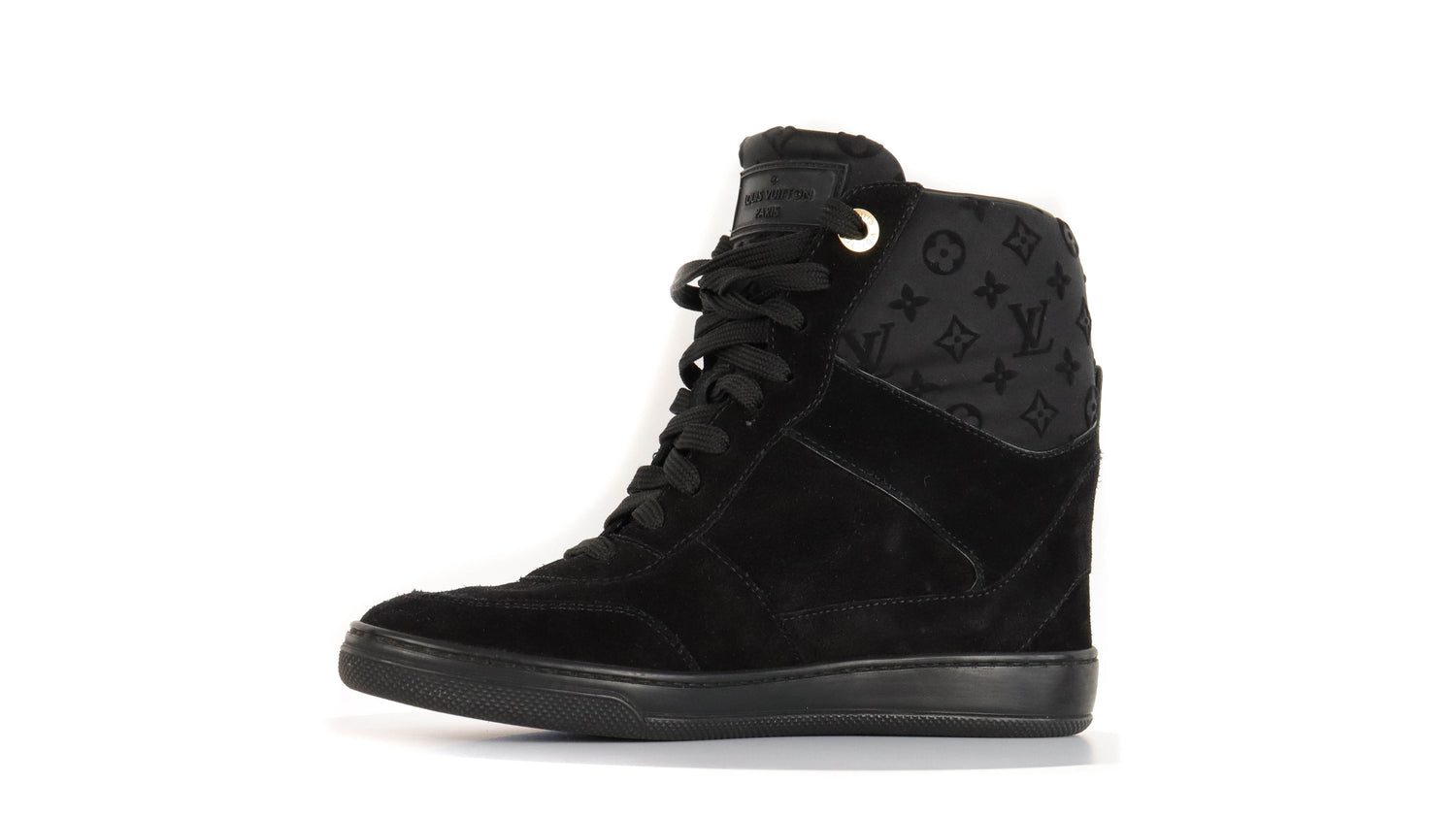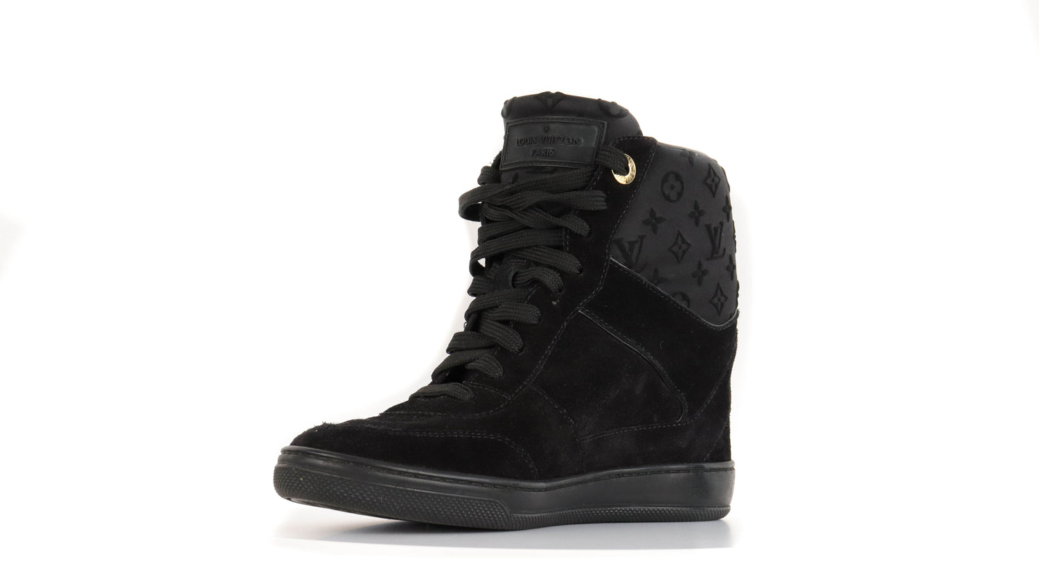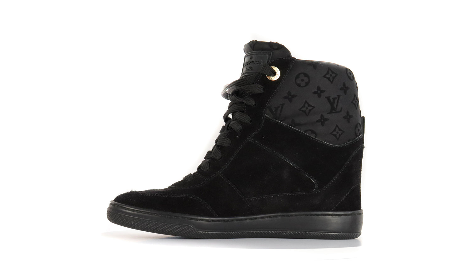 Sneakers para dama Louis Vuitton, elaborados en gamuza negra y tela Monogram en el mismo tono, puntera redonda cerrada, detalle de charol en la parte trasera y ajustable a base de agujetas, detalles en metal dorado con la marca grabada.