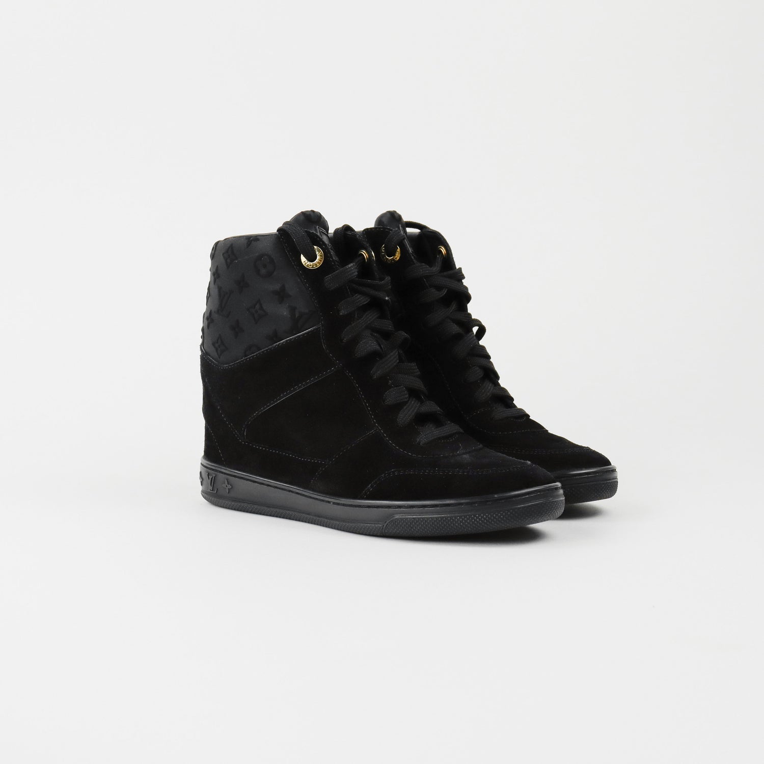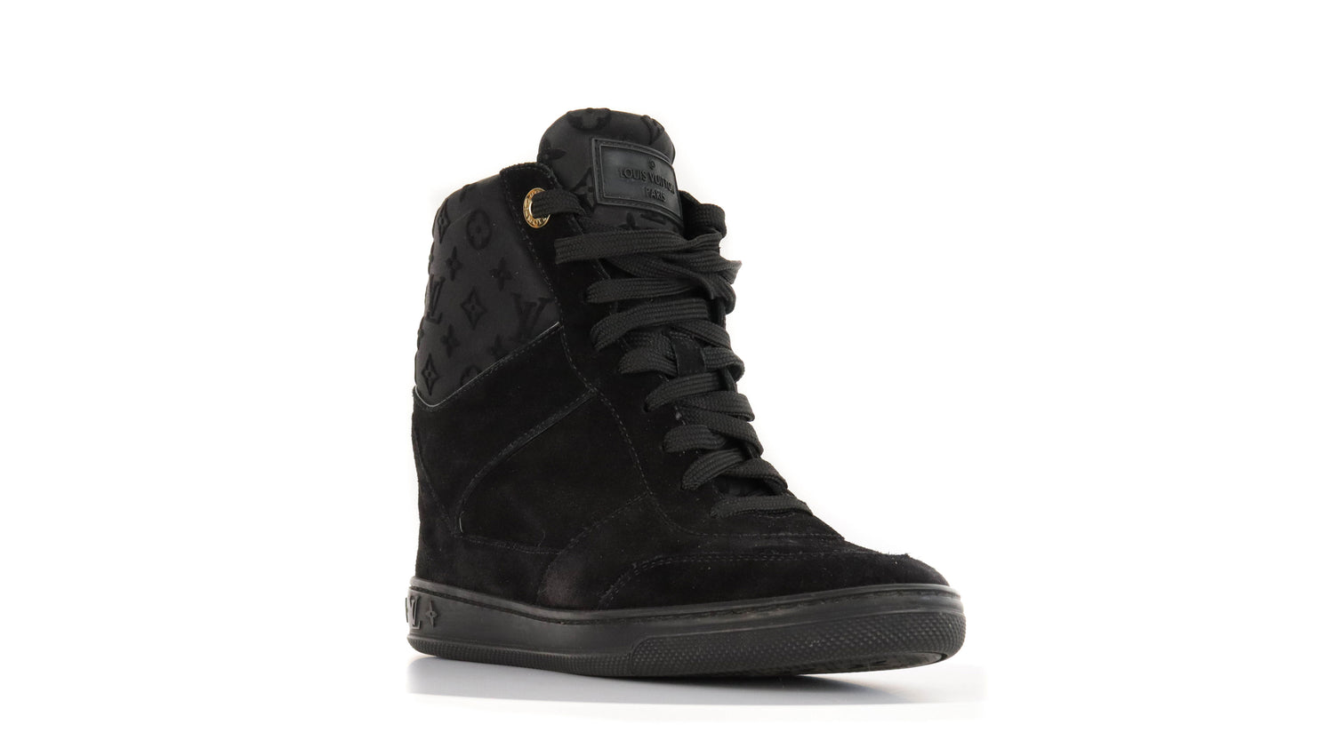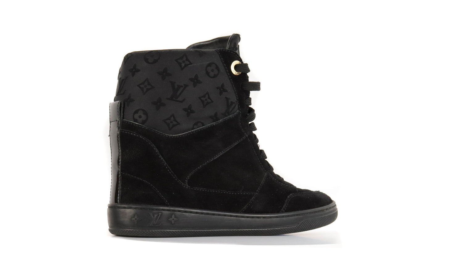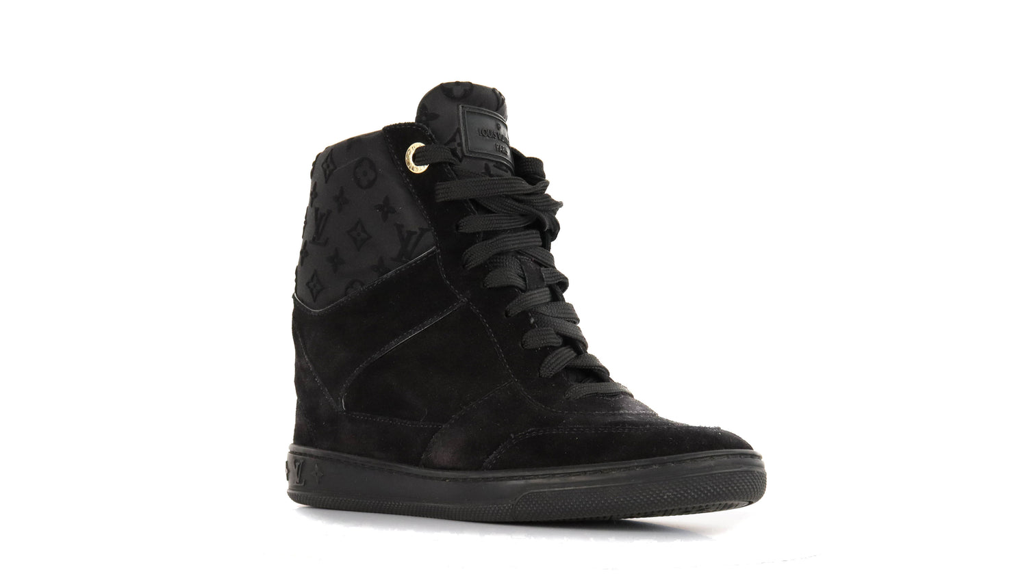 Sneakers para dama Louis Vuitton, elaborados en gamuza negra y tela Monogram en el mismo tono, puntera redonda cerrada, detalle de charol en la parte trasera y ajustable a base de agujetas, detalles en metal dorado con la marca grabada.