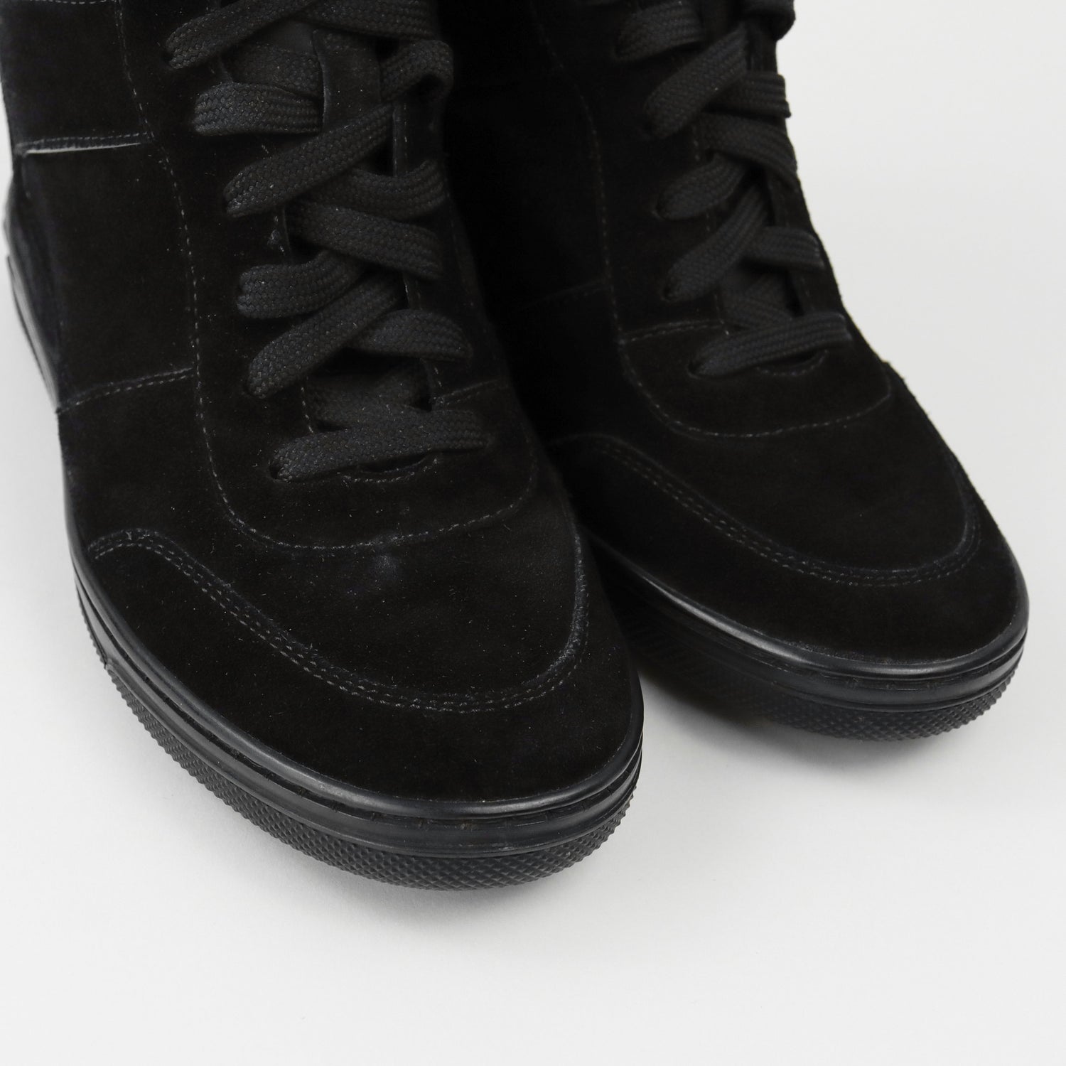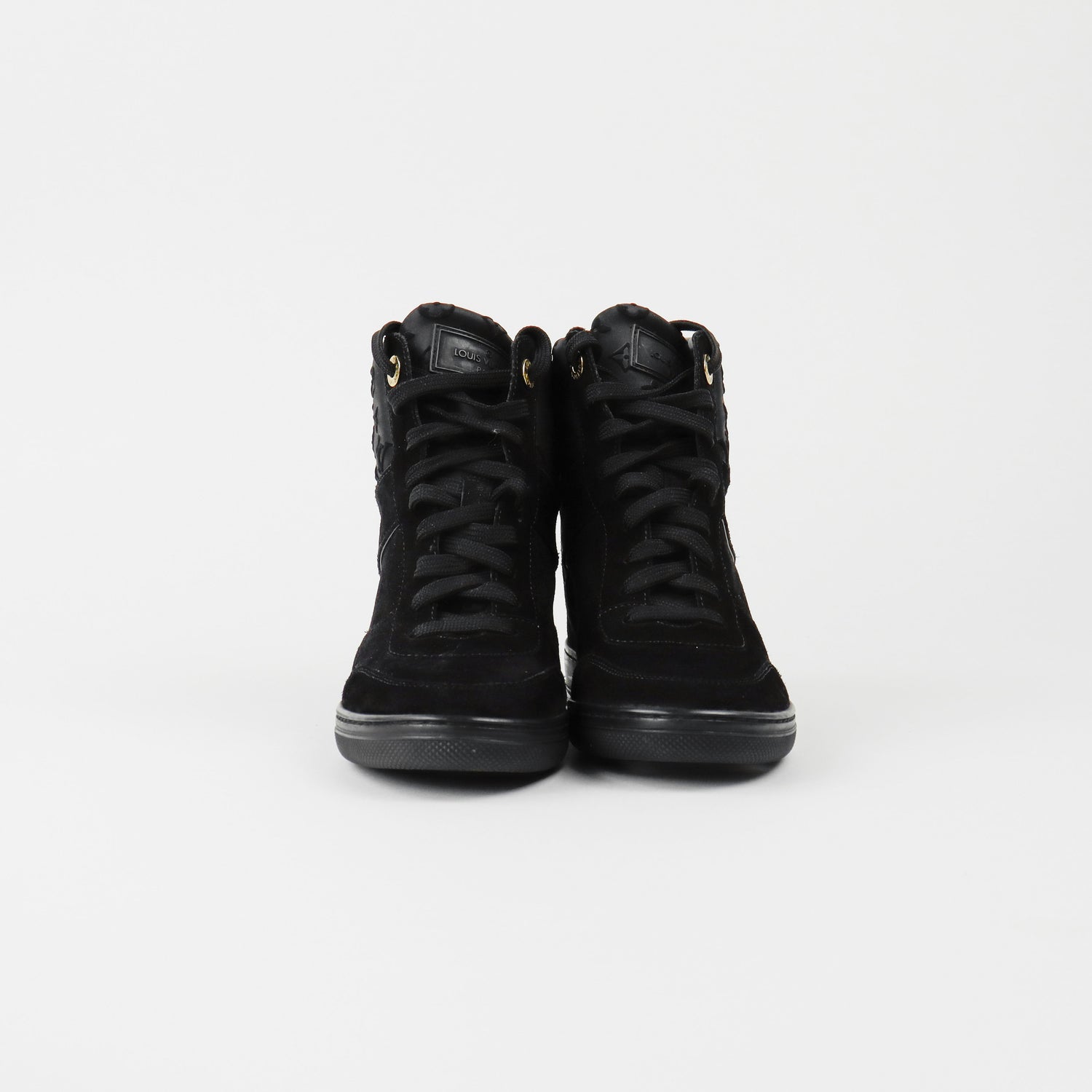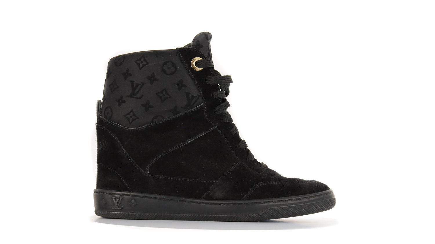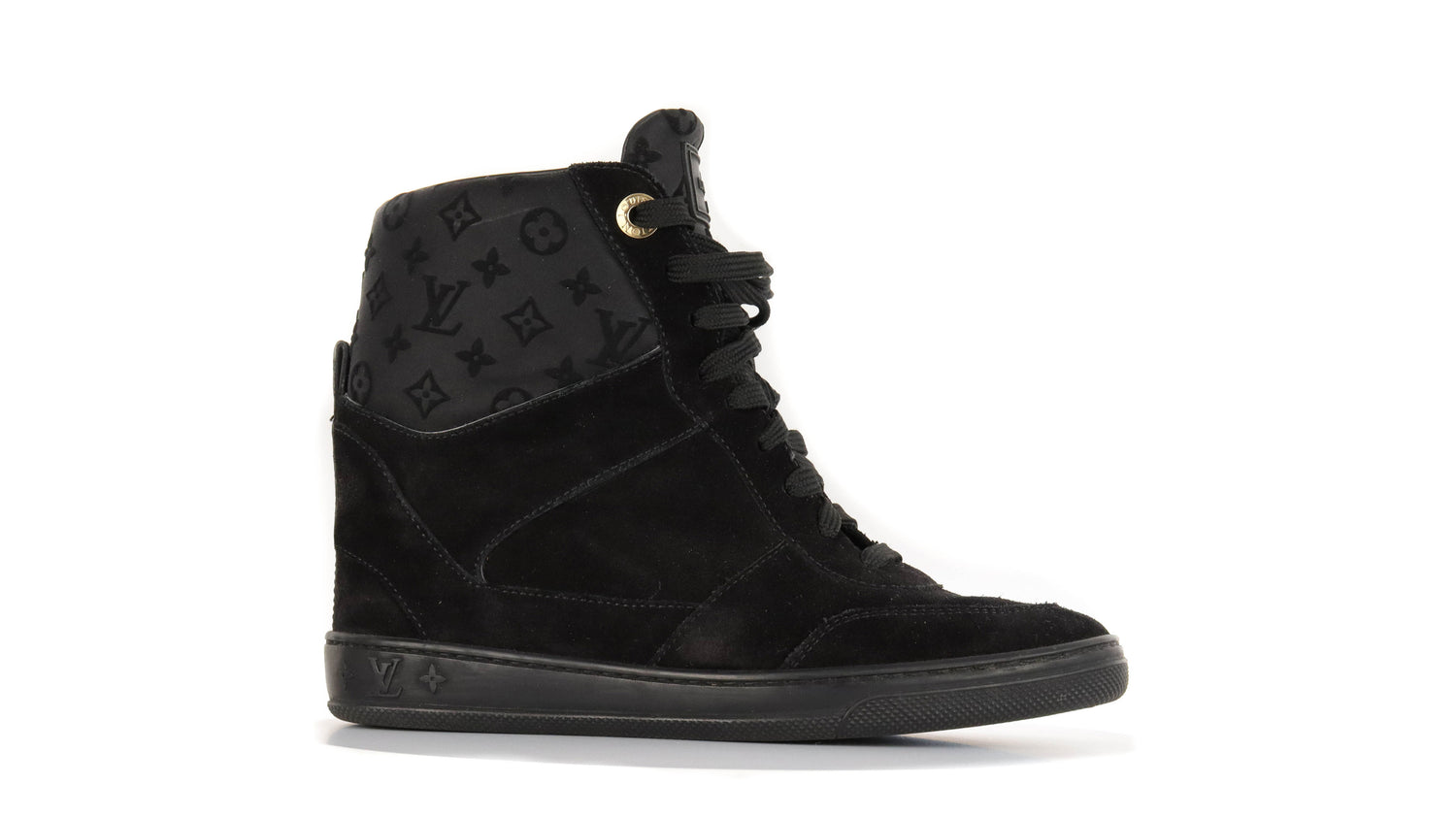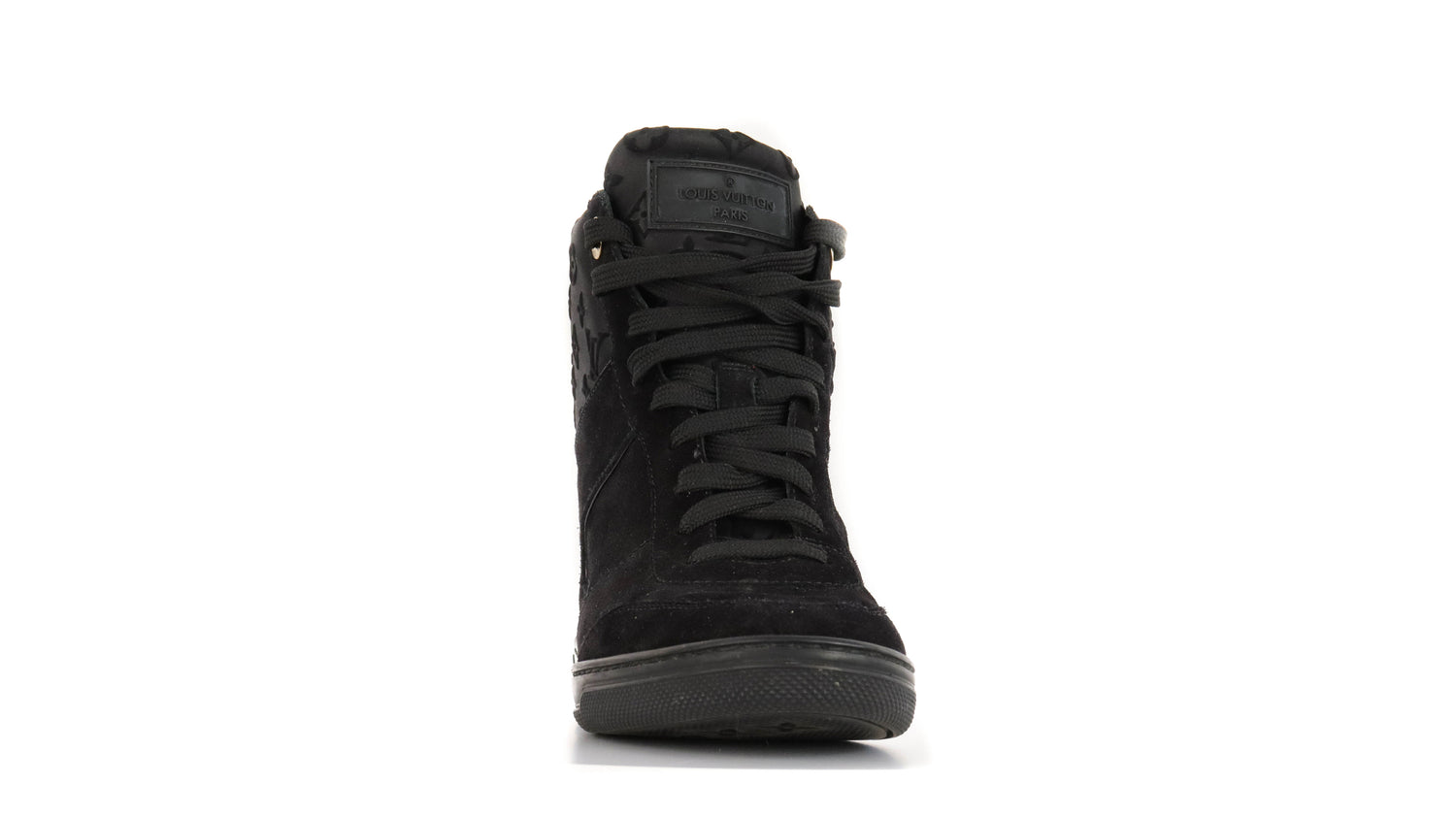 Sneakers para dama Louis Vuitton, elaborados en gamuza negra y tela Monogram en el mismo tono, puntera redonda cerrada, detalle de charol en la parte trasera y ajustable a base de agujetas, detalles en metal dorado con la marca grabada.