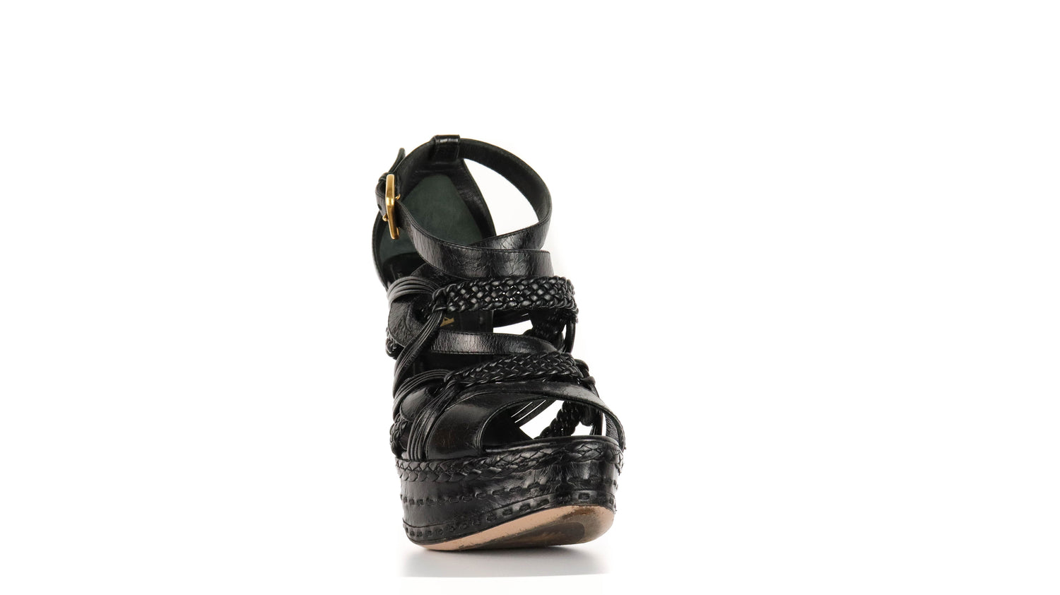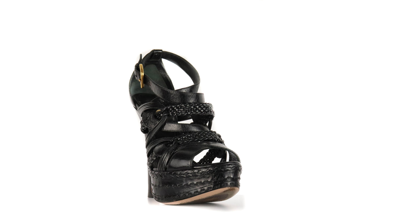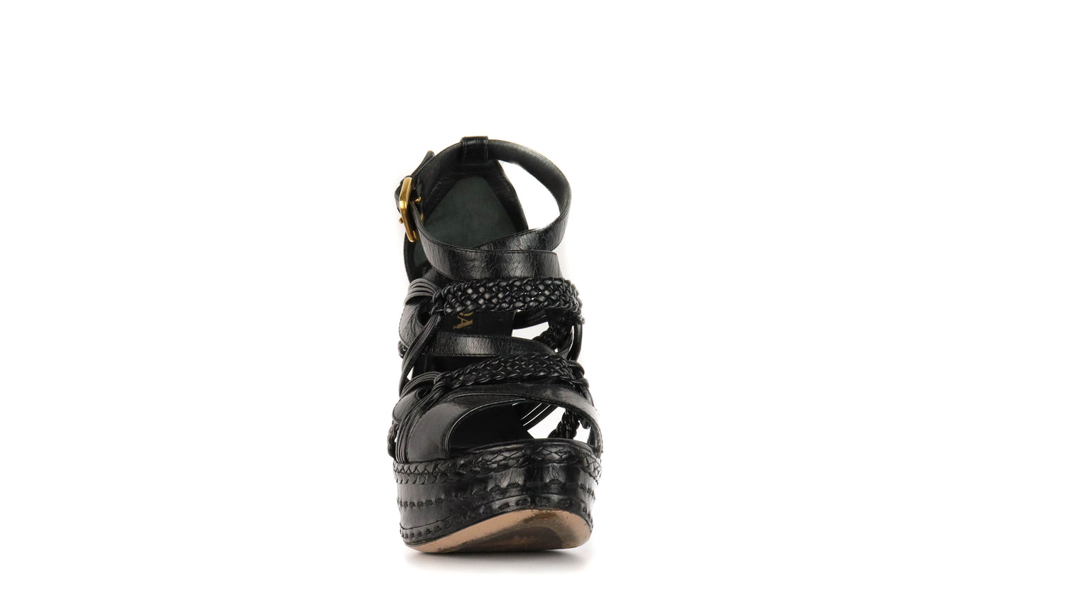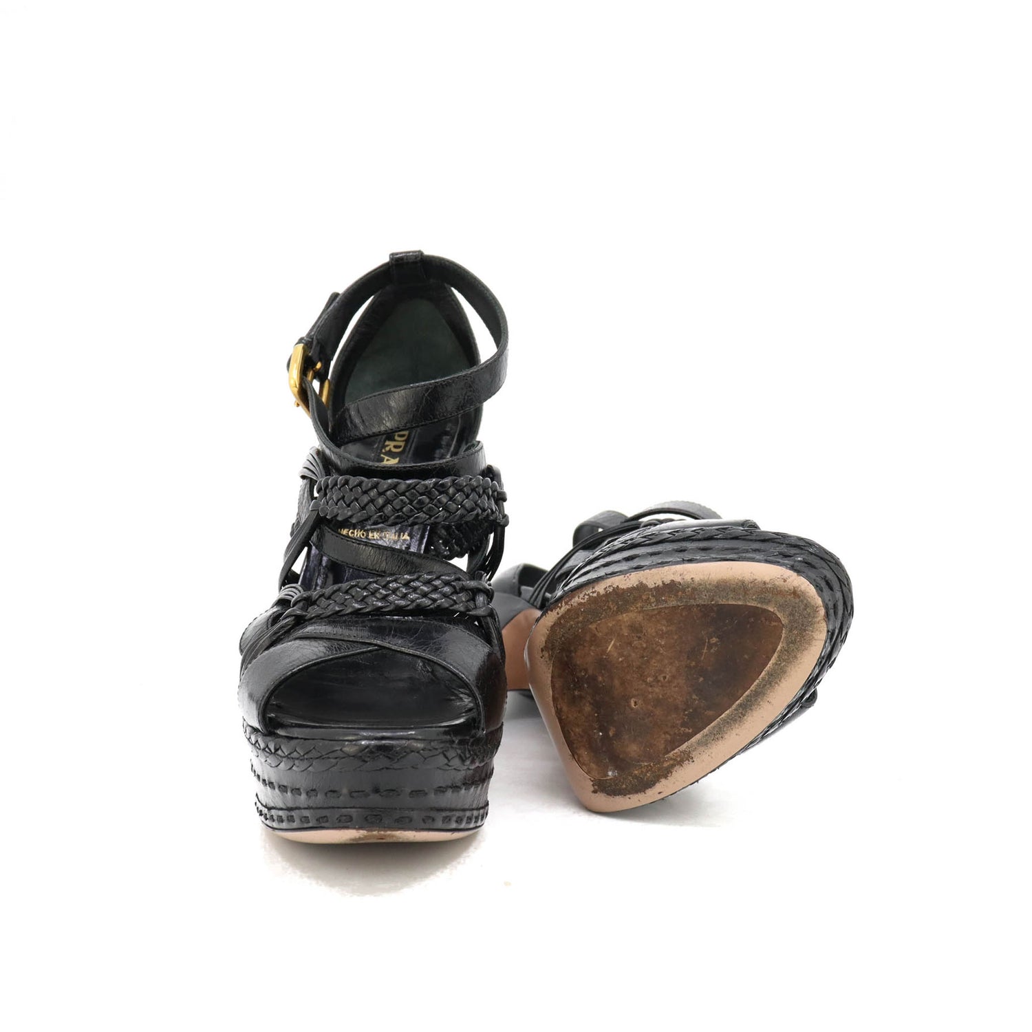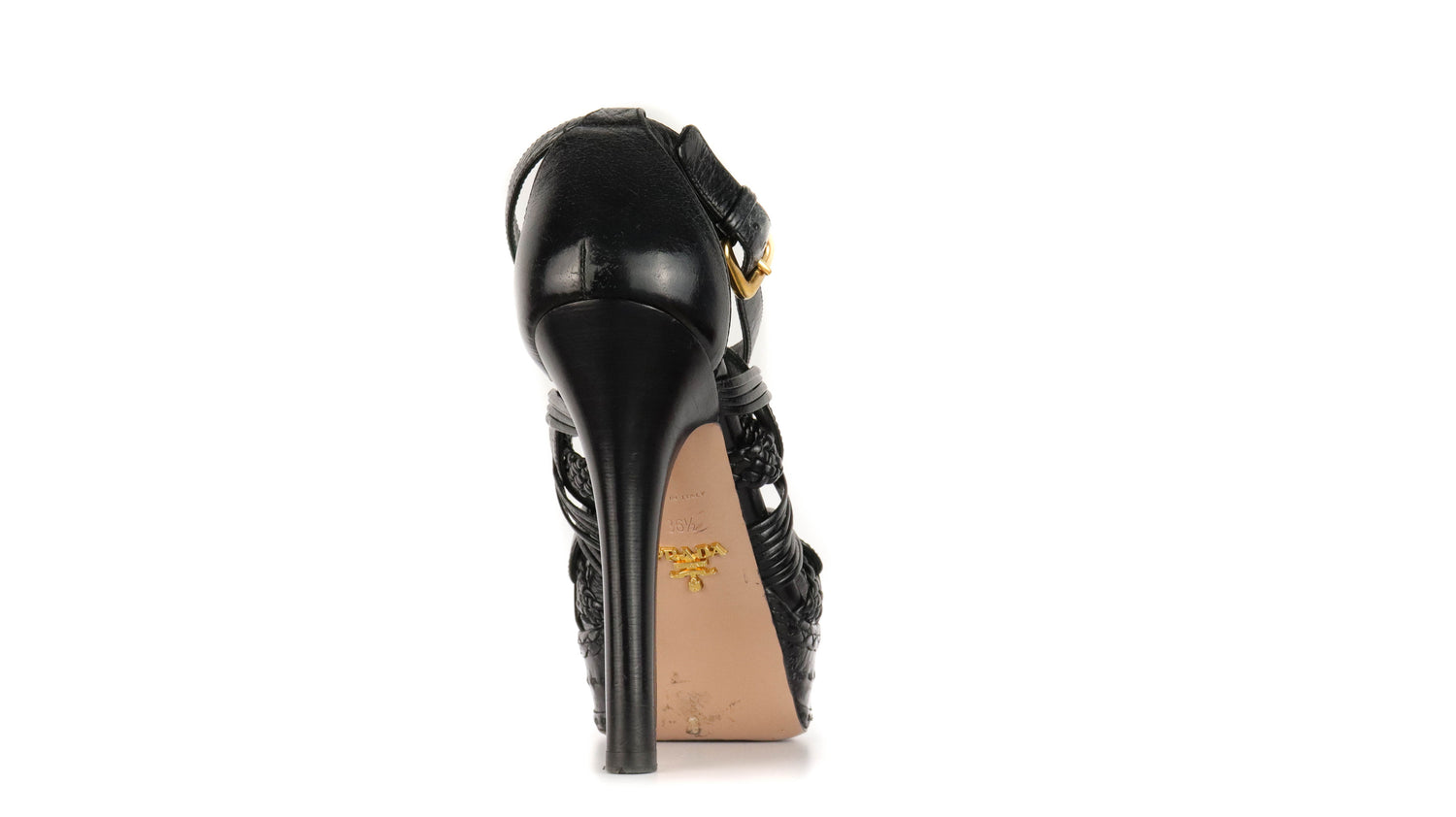 Tacones Prada, elaborados en piel color negro con puntera abierta redonda, detalles de bandas trenzadas y lisas en el empeine, con correa ajustable lateral y hebilla color dorada, tacón stiletto alto de 13 cm.