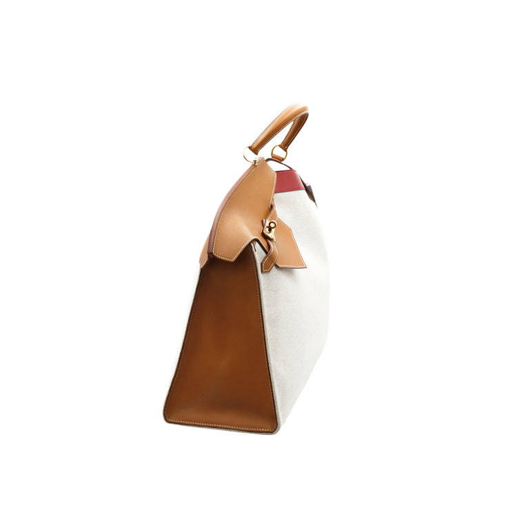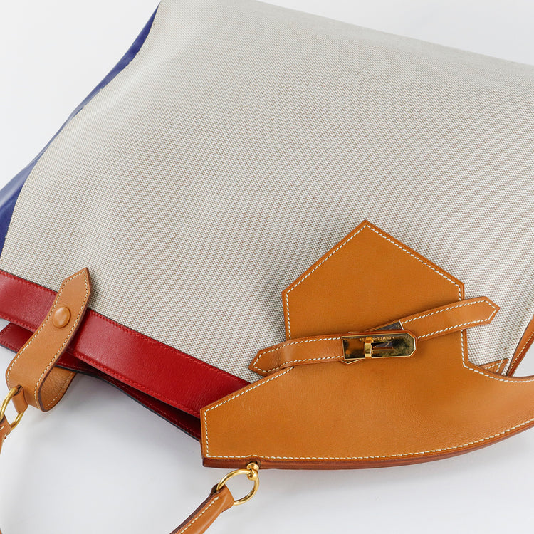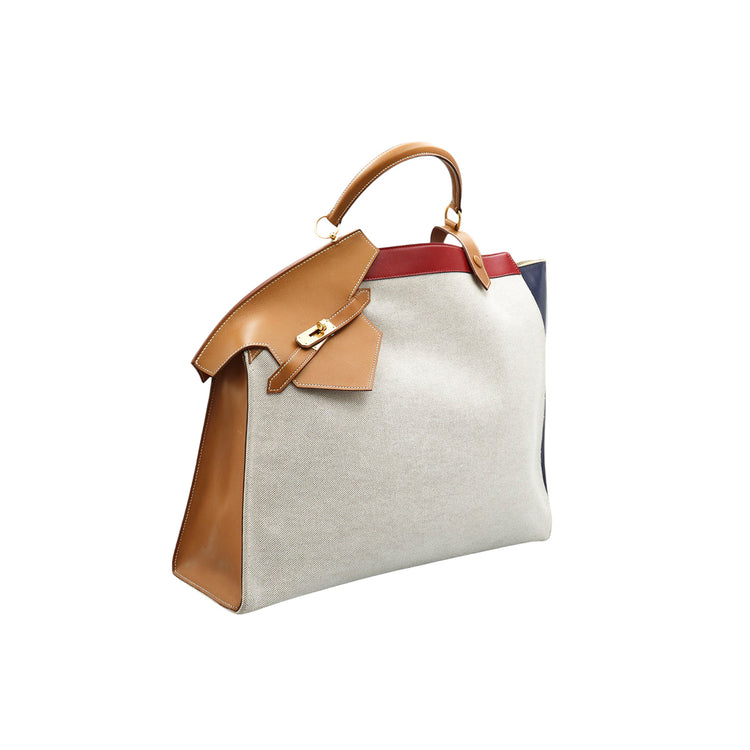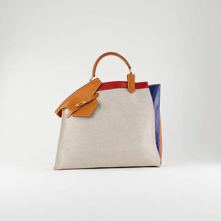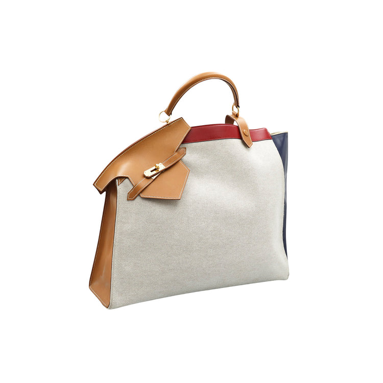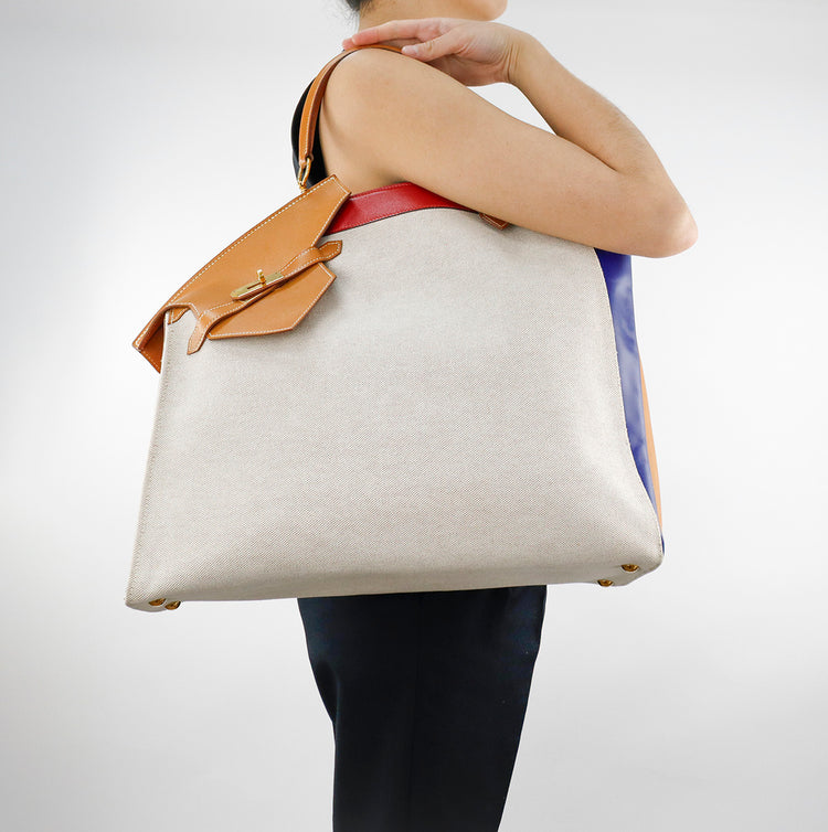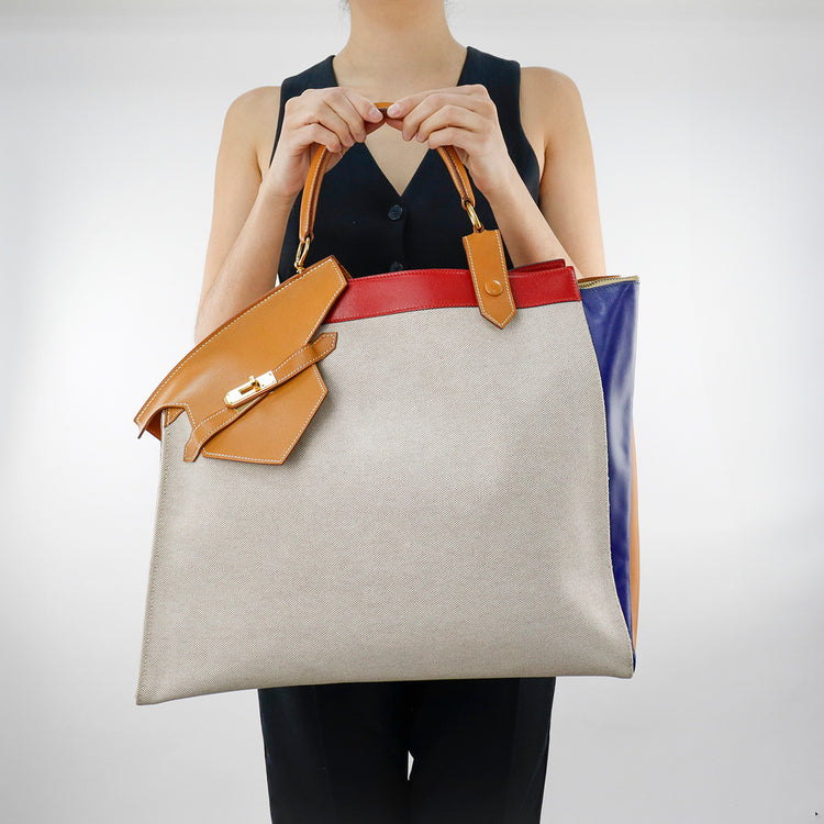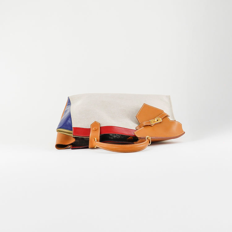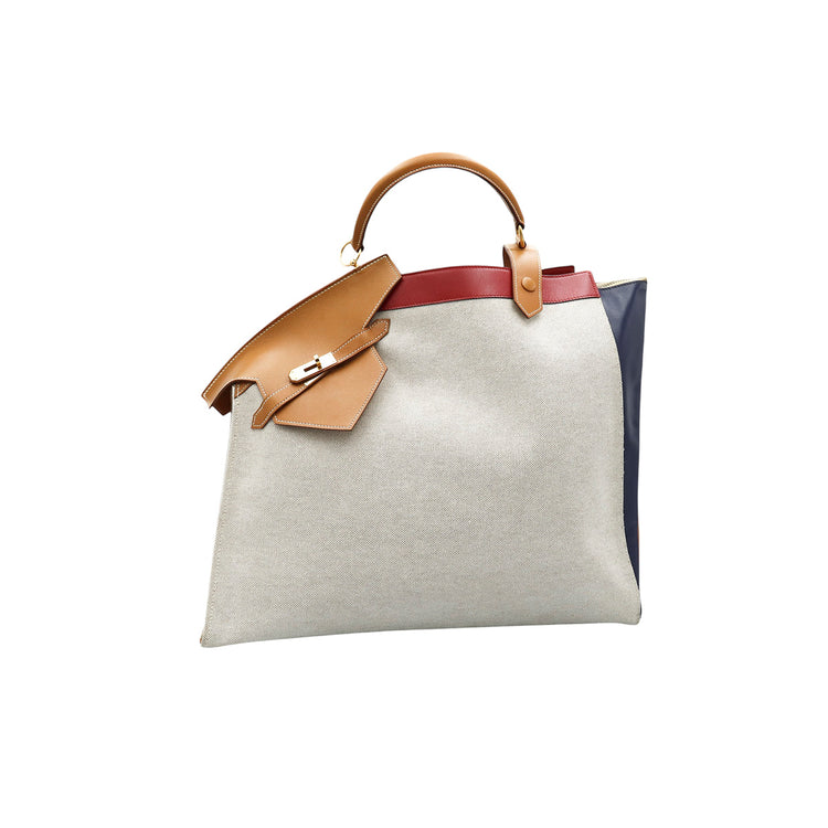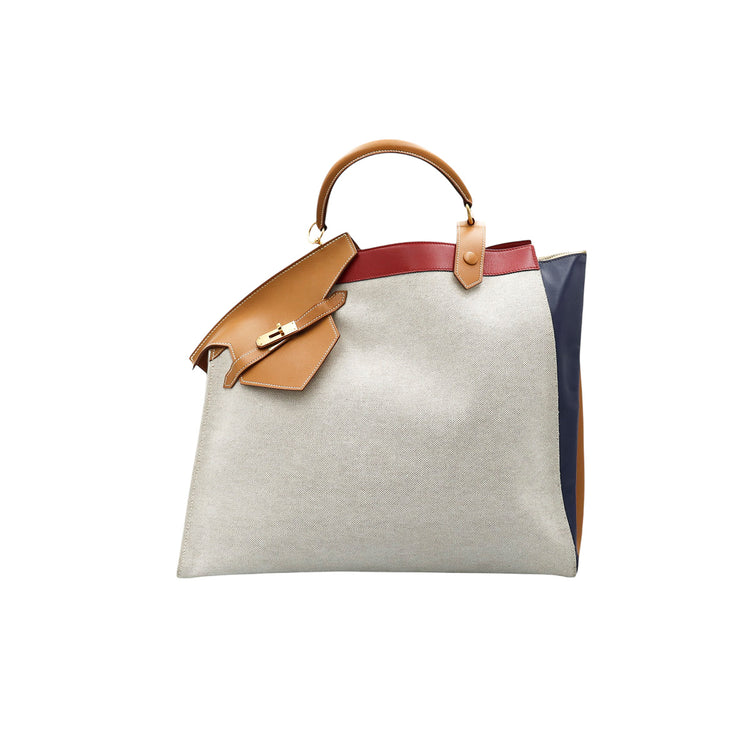 Bolsa de mano marca Hermès, de la colección Sac Himalaya Symbiose 43, confeccionado en lona textil, color arena con detalles en piel color camello e interiores multicolor, herrajes y cremallera en color dorado, solapas con pequeños detalles de uso.