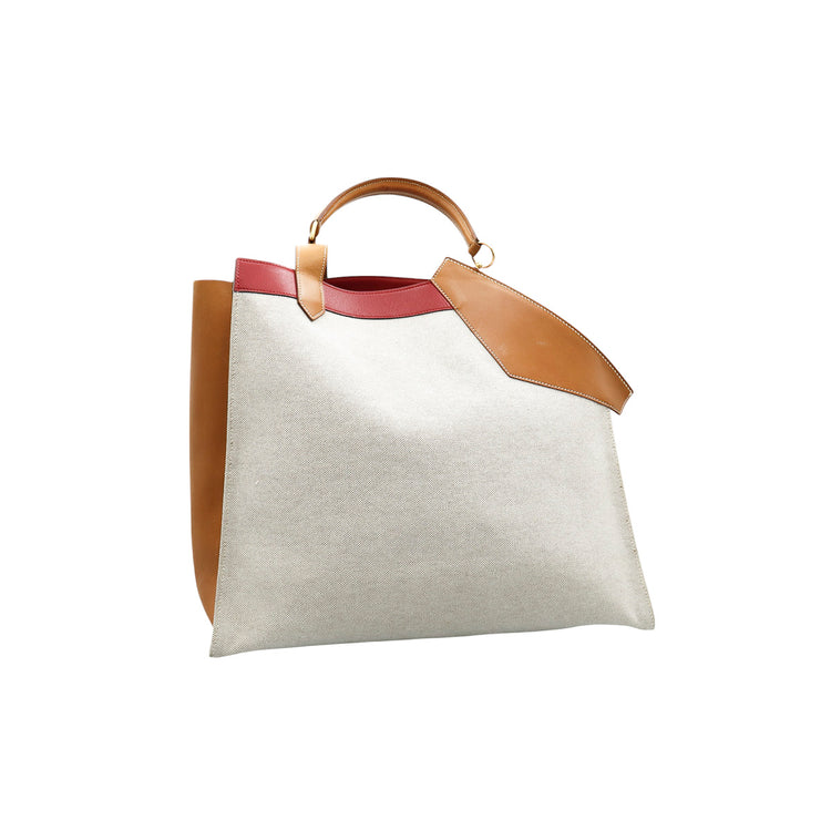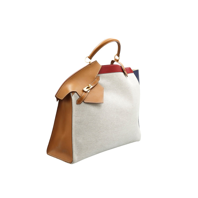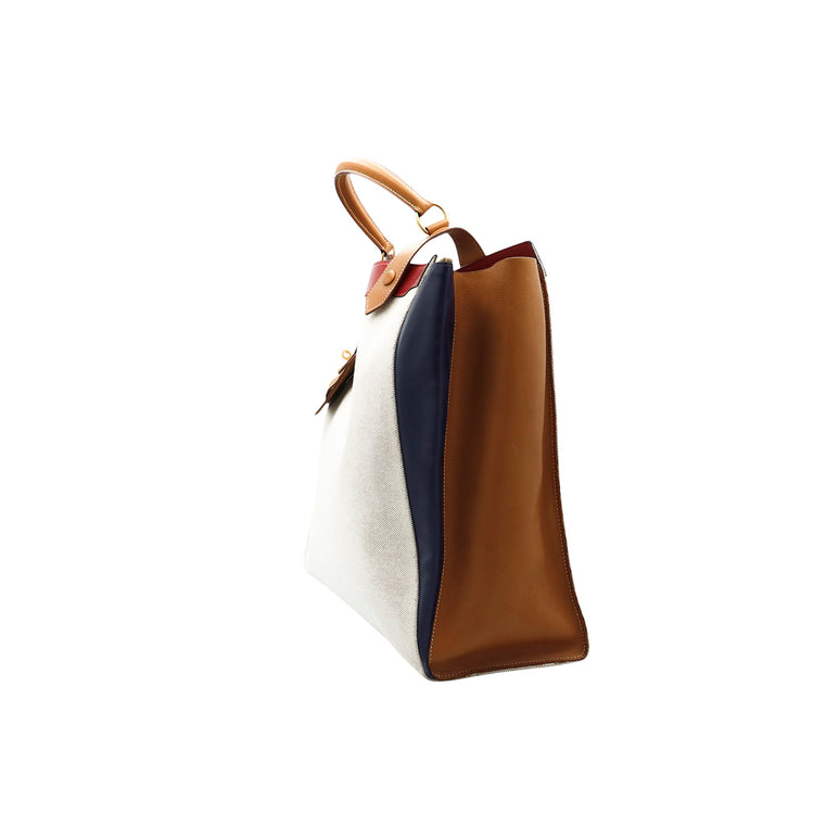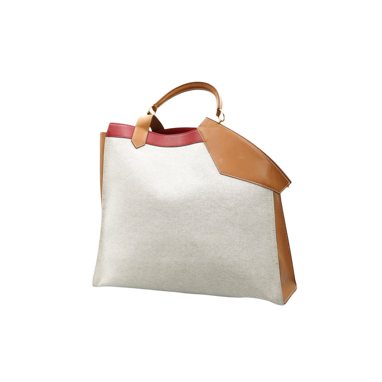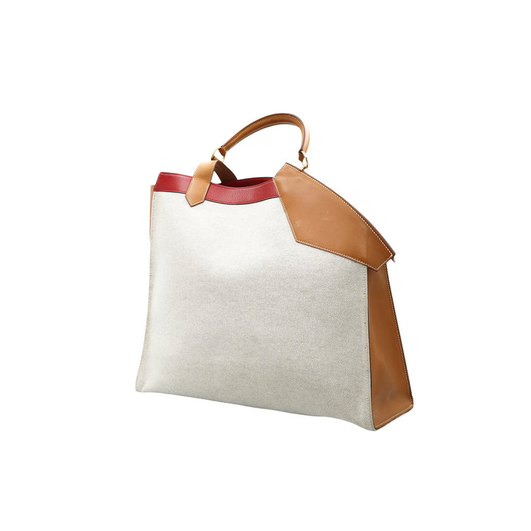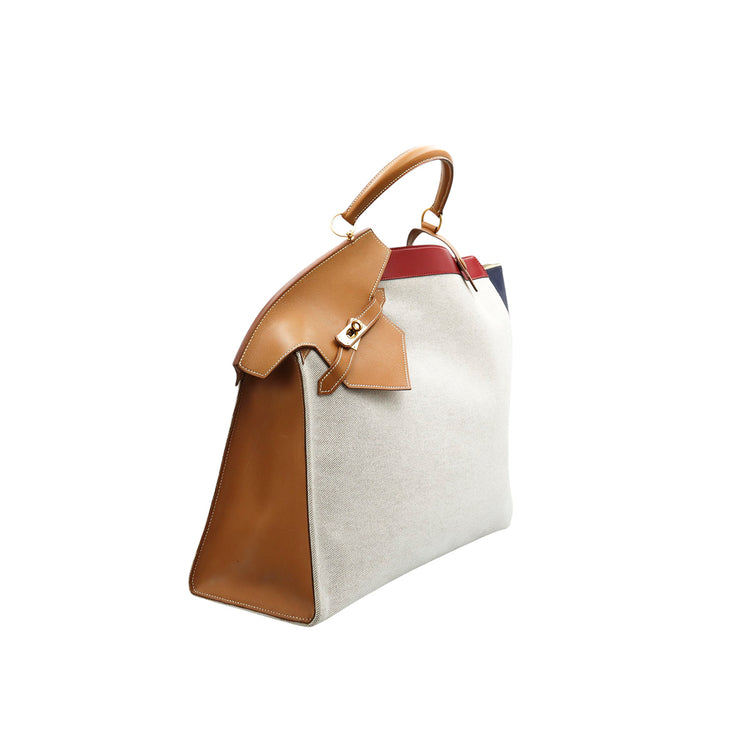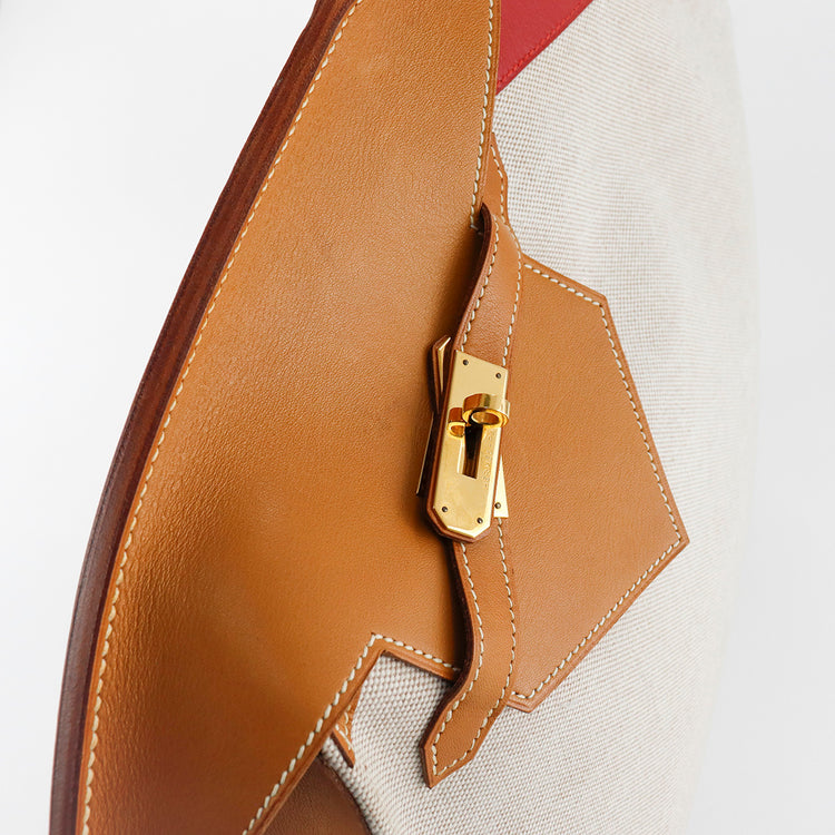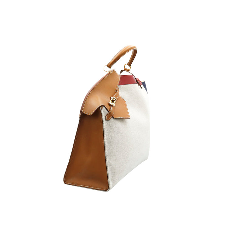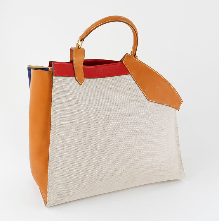 Bolsa de mano marca Hermès, de la colección Sac Himalaya Symbiose 43, confeccionado en lona textil, color arena con detalles en piel color camello e interiores multicolor, herrajes y cremallera en color dorado, solapas con pequeños detalles de uso.