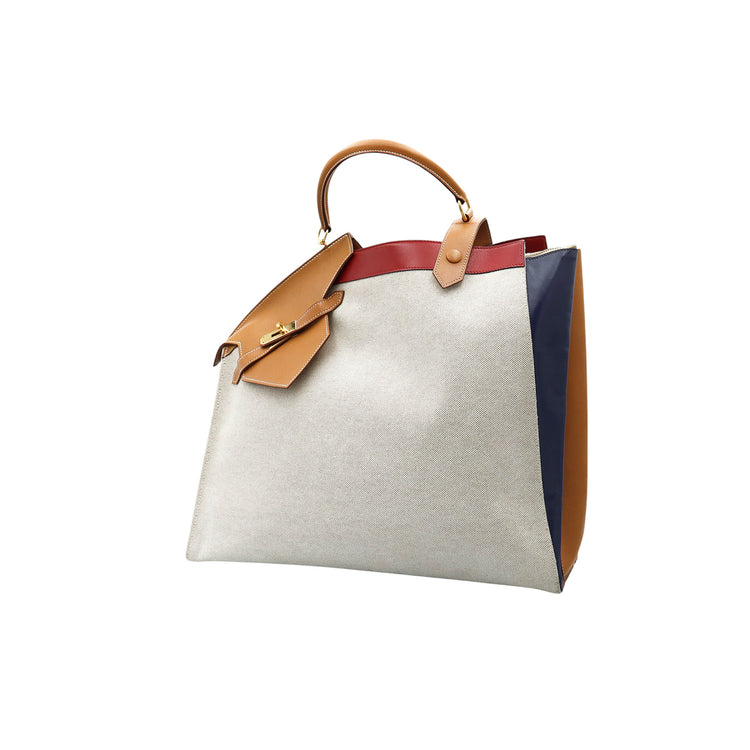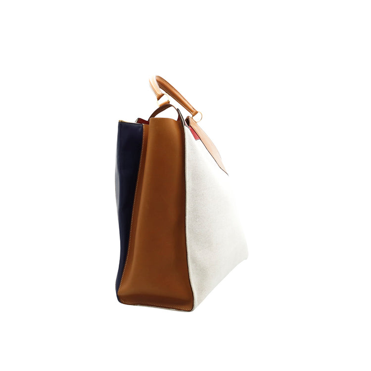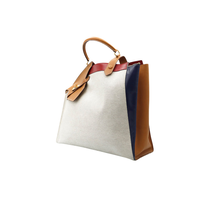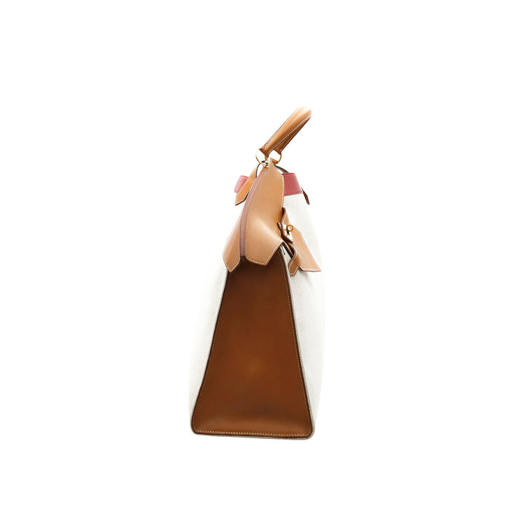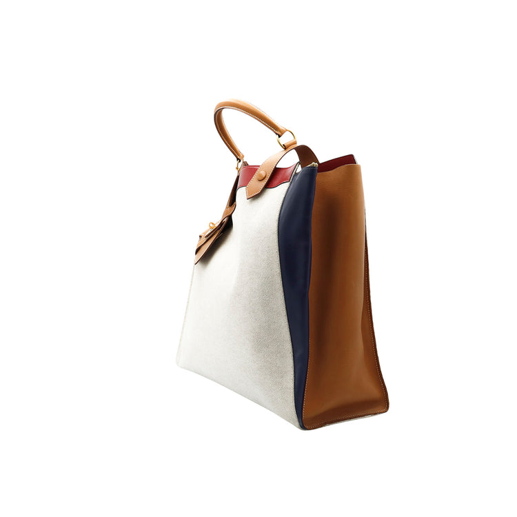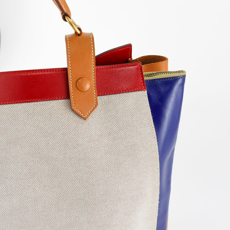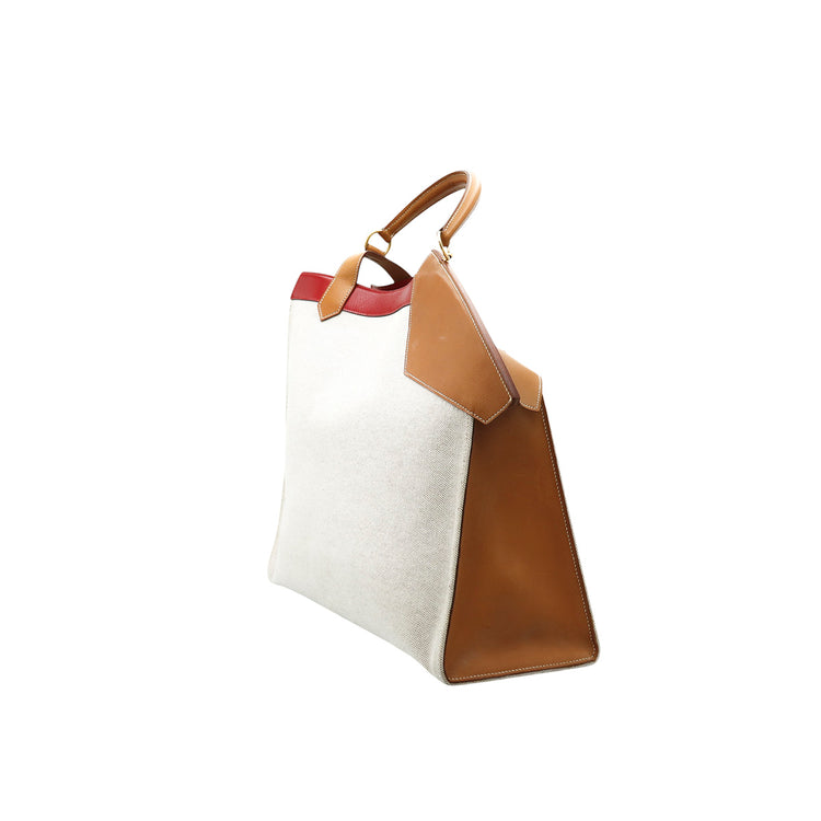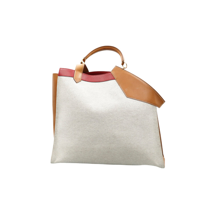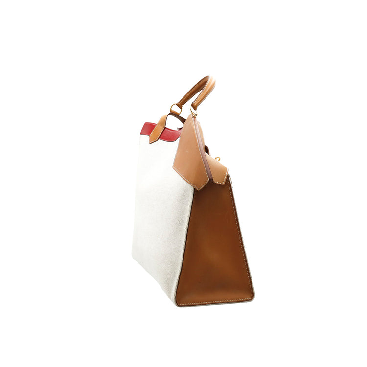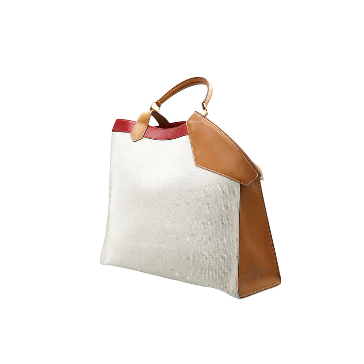 Bolsa de mano marca Hermès, de la colección Sac Himalaya Symbiose 43, confeccionado en lona textil, color arena con detalles en piel color camello e interiores multicolor, herrajes y cremallera en color dorado, solapas con pequeños detalles de uso.