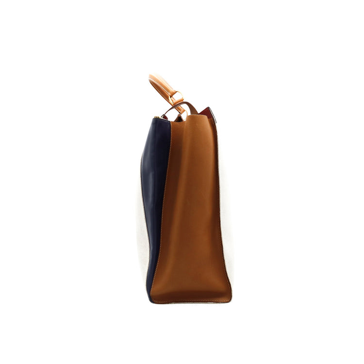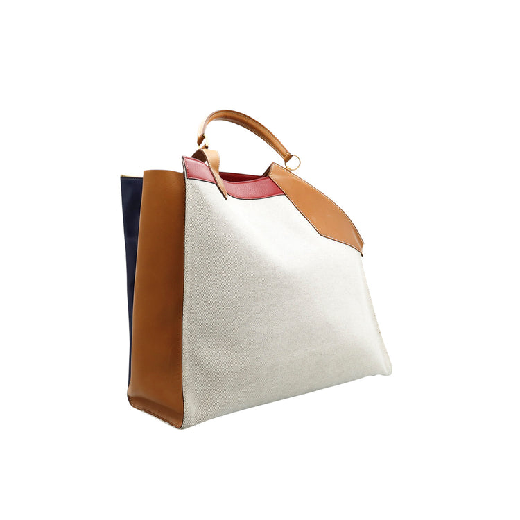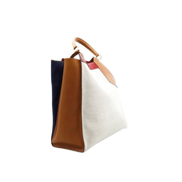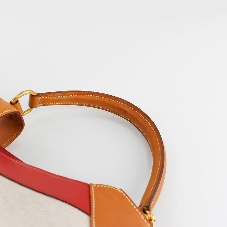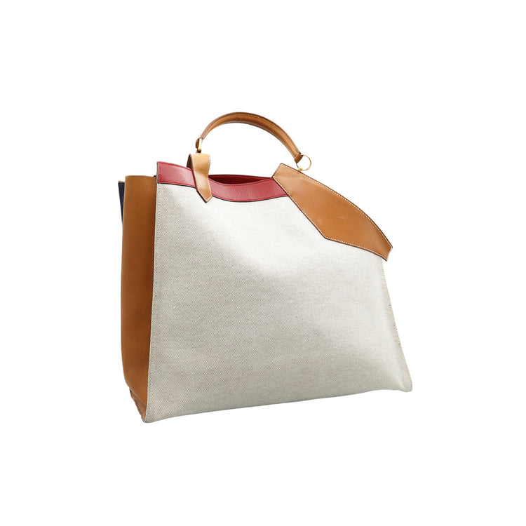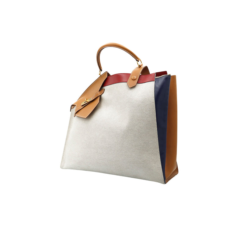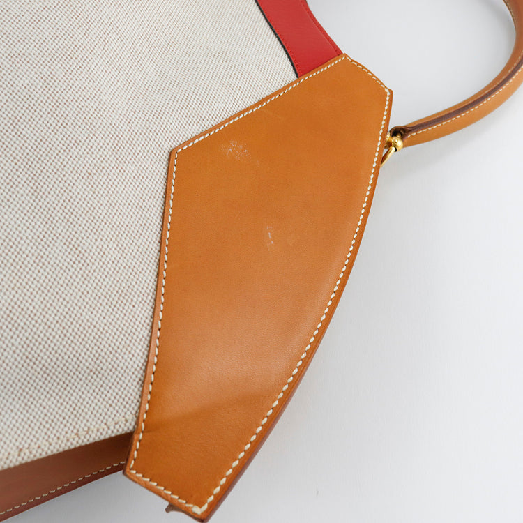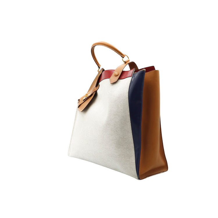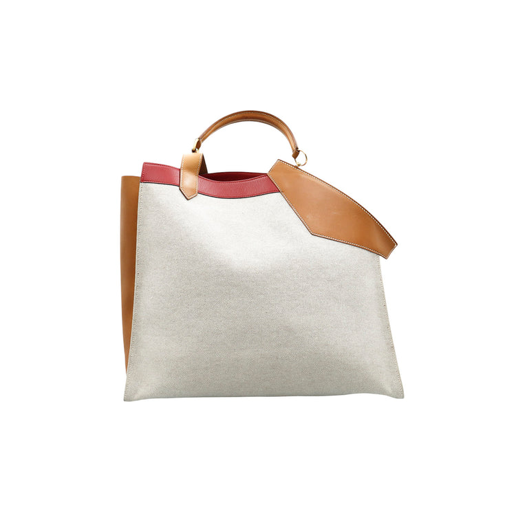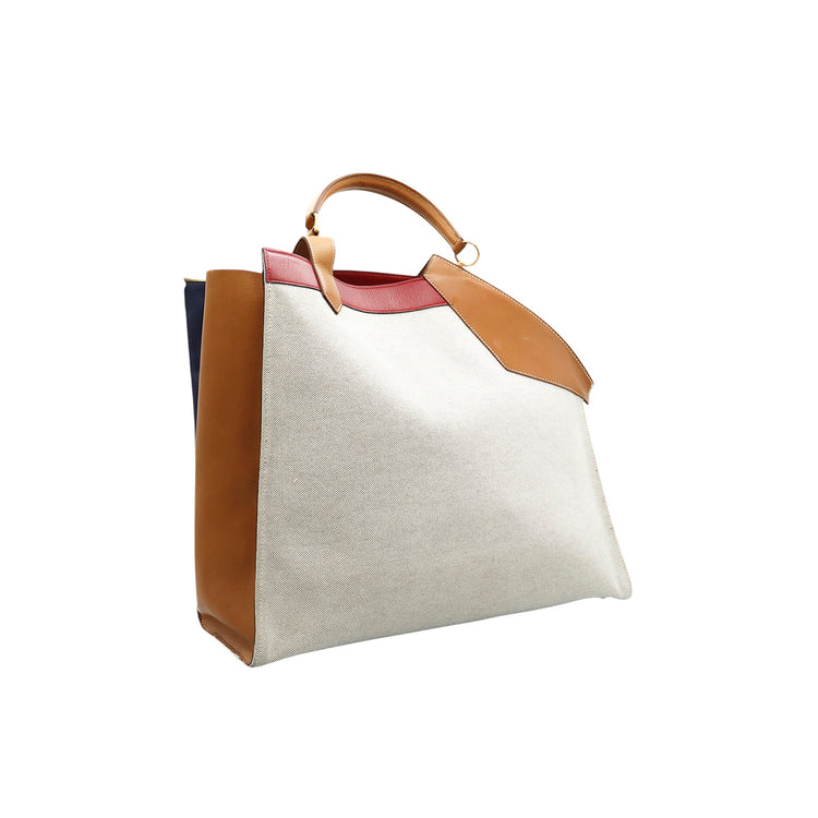 Bolsa de mano marca Hermès, de la colección Sac Himalaya Symbiose 43, confeccionado en lona textil, color arena con detalles en piel color camello e interiores multicolor, herrajes y cremallera en color dorado, solapas con pequeños detalles de uso.