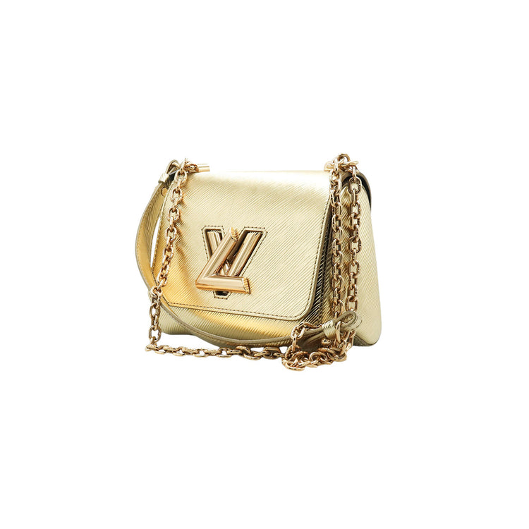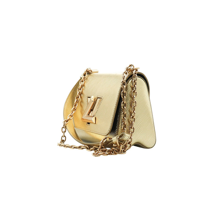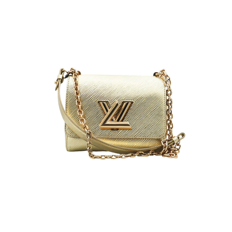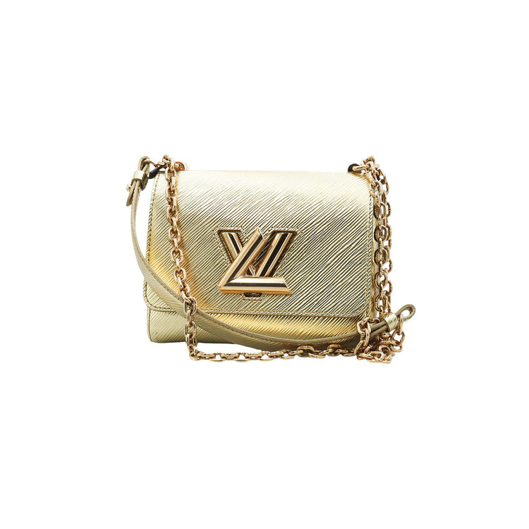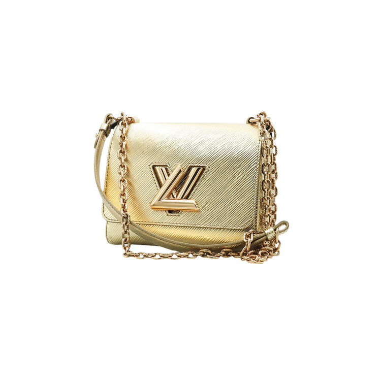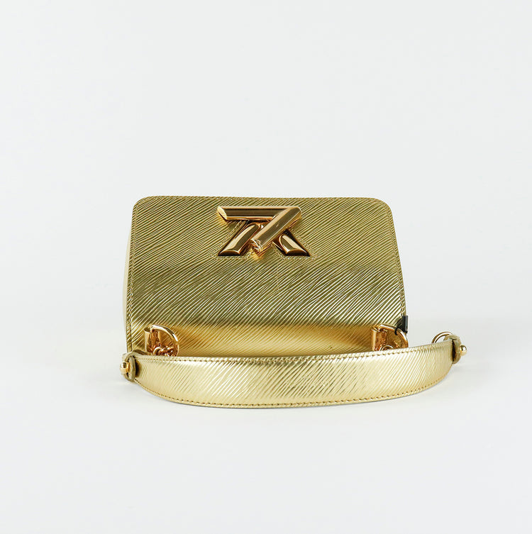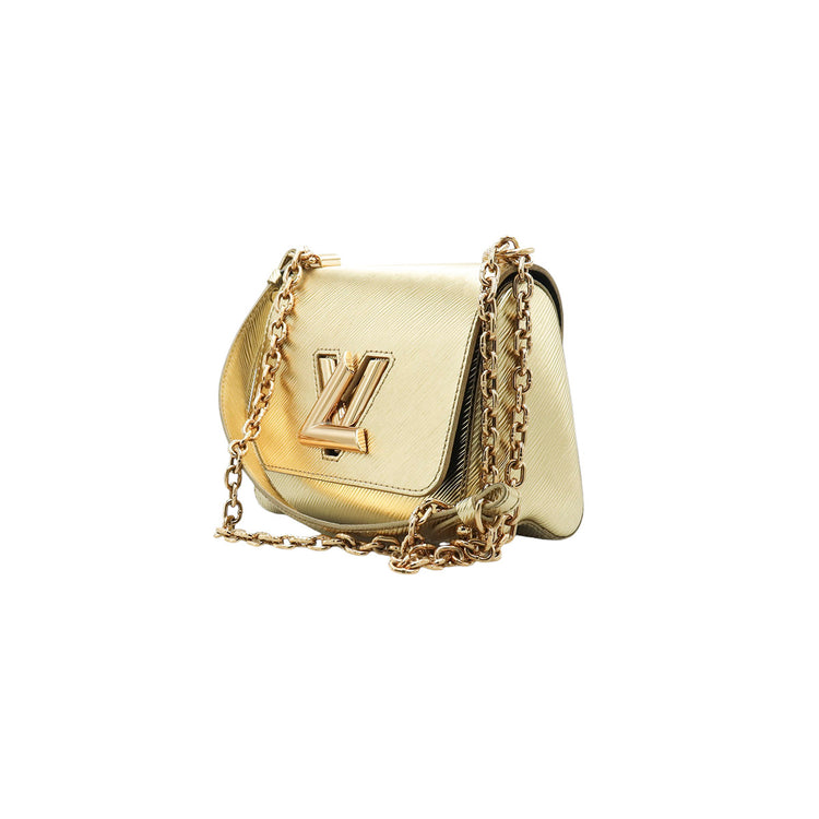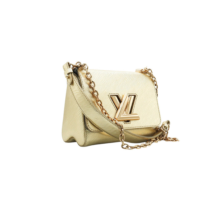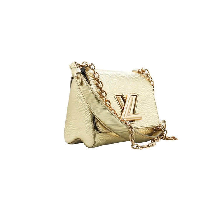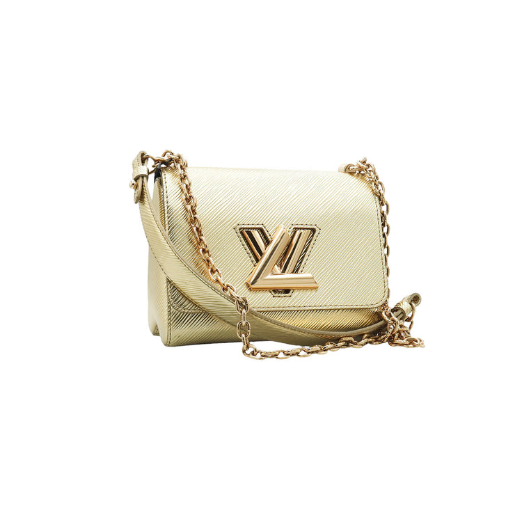 Bolso Louis Vuitton de la línea Twist PM, confeccionado en piel EPI color dorado, forro interno en alcántara color negro, con bandolera extraíble no ajustable, emblemático cierre LV twist al frente en la solapa, todos los herrajes en color dorado. ARTICULO DE SEGUNDA MANO EN MUY BUEN ESTADO. Cuenta con cubre polvo.