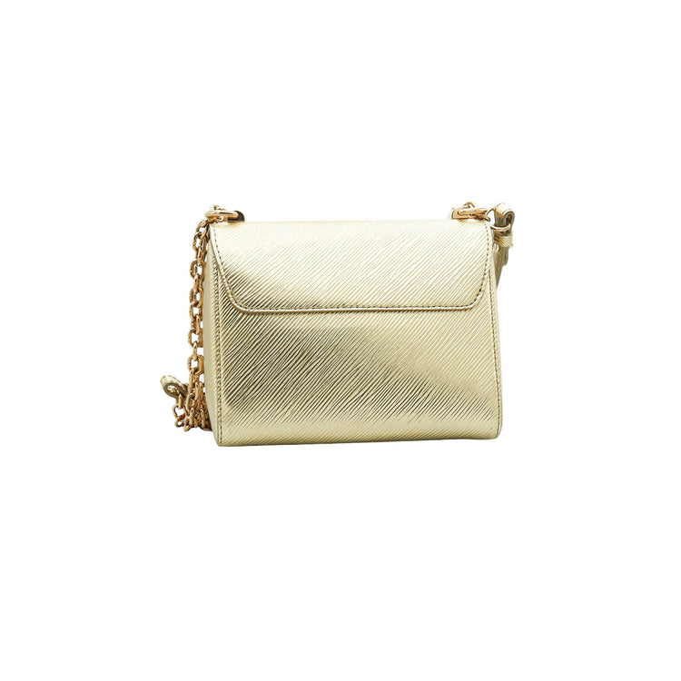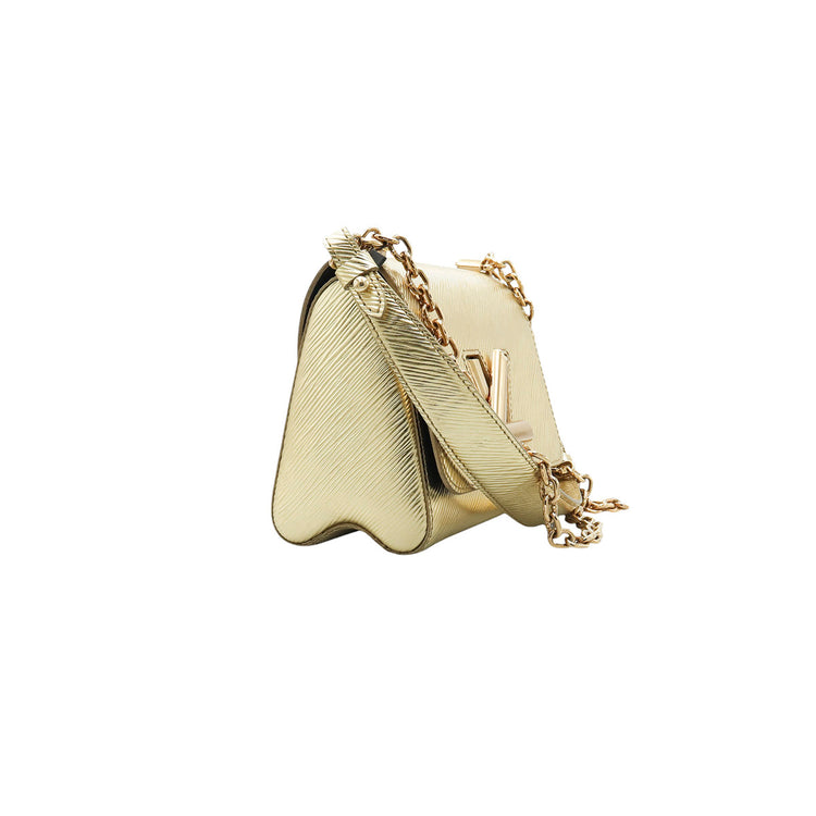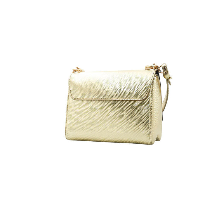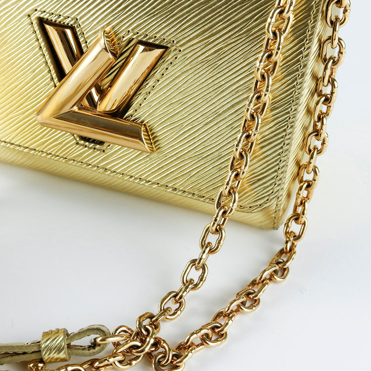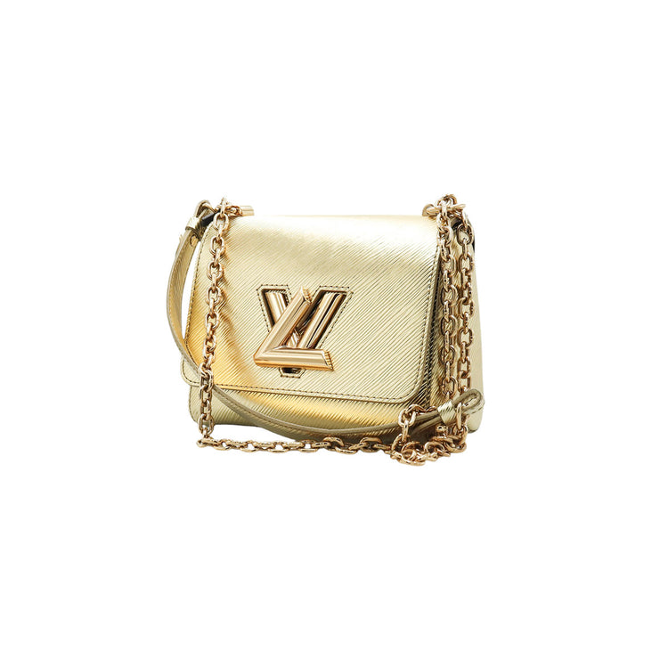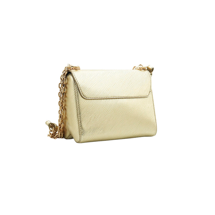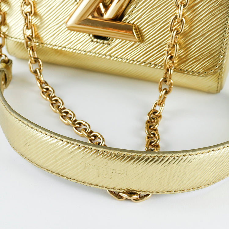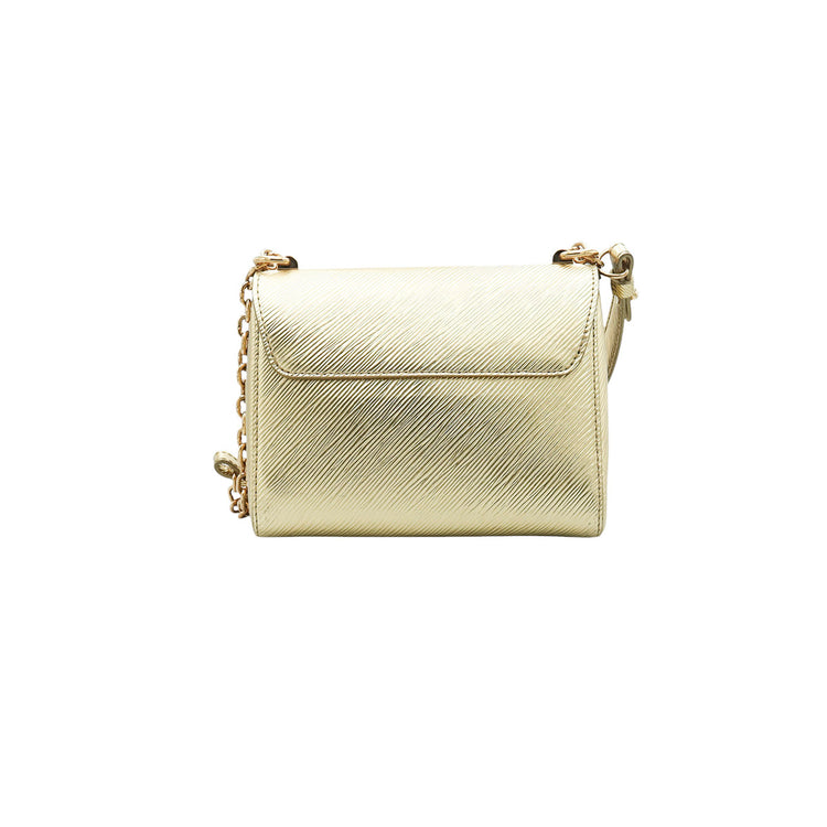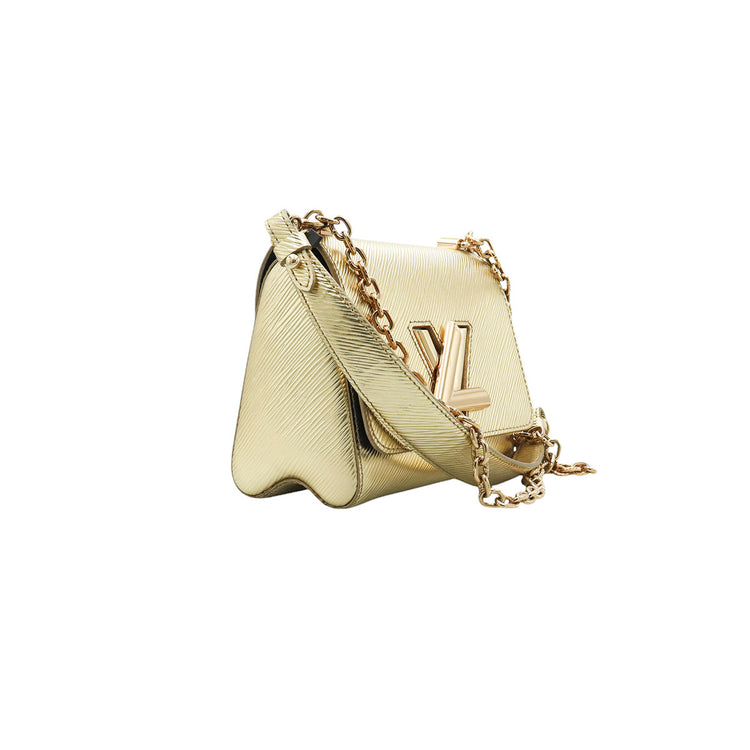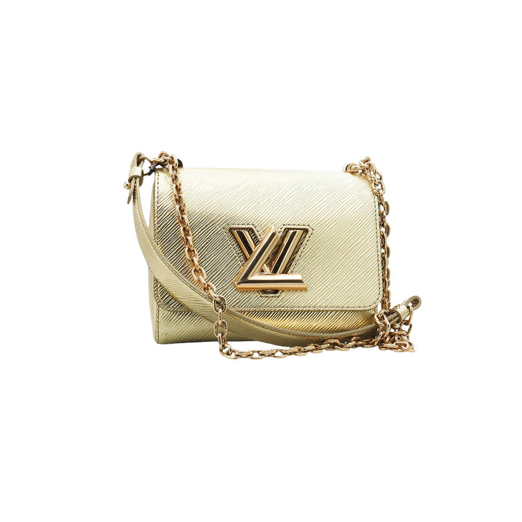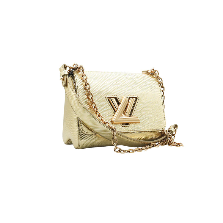Bolso Louis Vuitton de la línea Twist PM, confeccionado en piel EPI color dorado, forro interno en alcántara color negro, con bandolera extraíble no ajustable, emblemático cierre LV twist al frente en la solapa, todos los herrajes en color dorado. ARTICULO DE SEGUNDA MANO EN MUY BUEN ESTADO. Cuenta con cubre polvo.