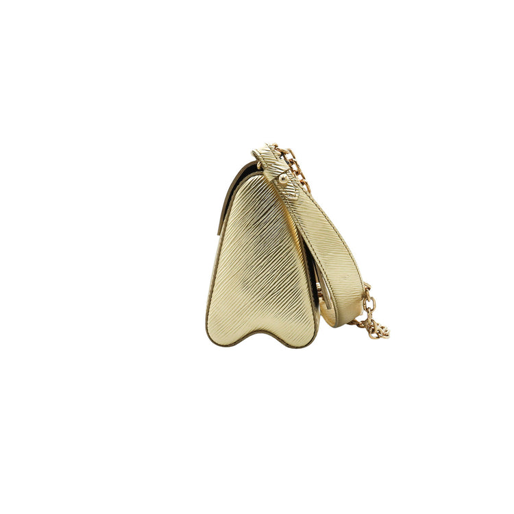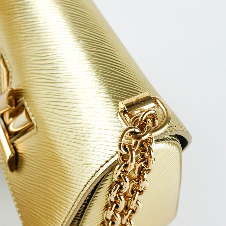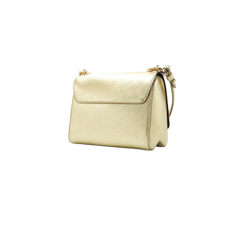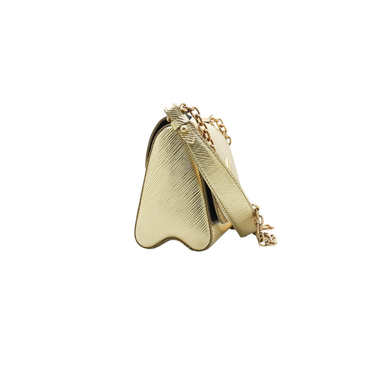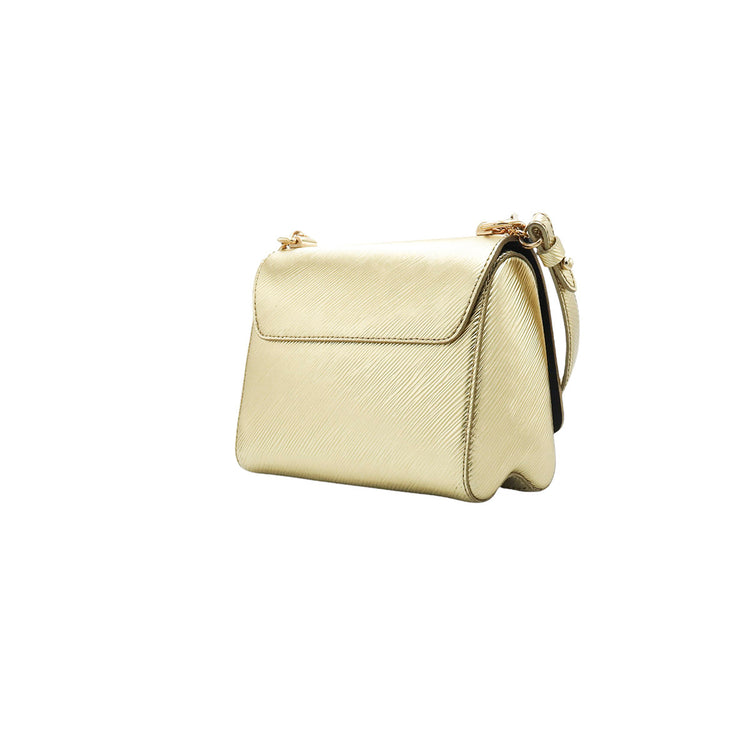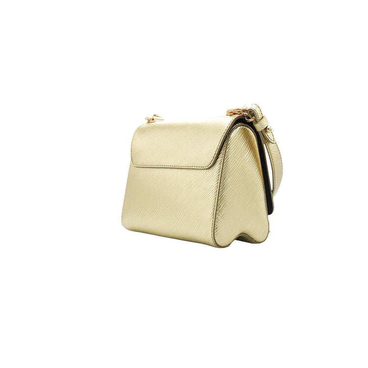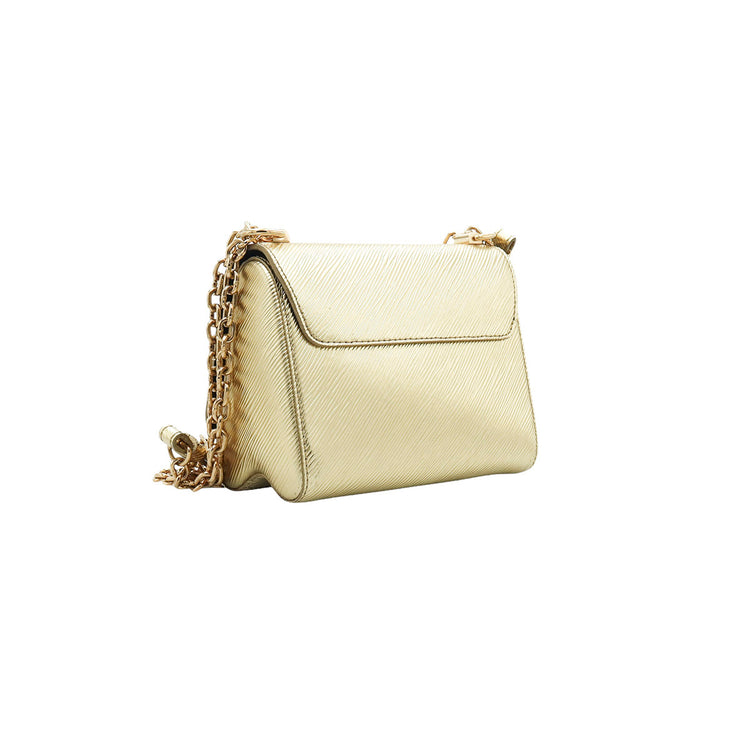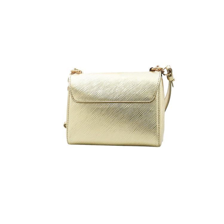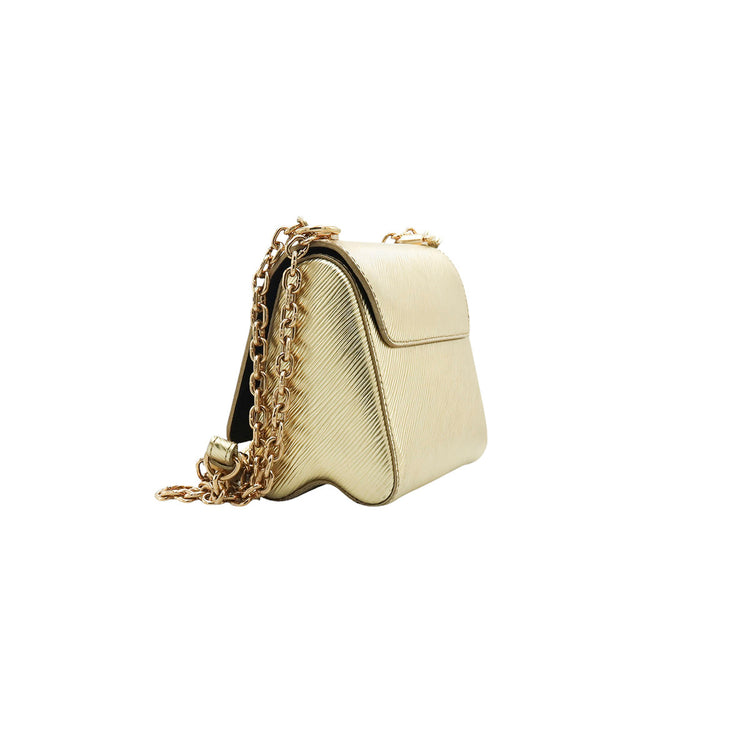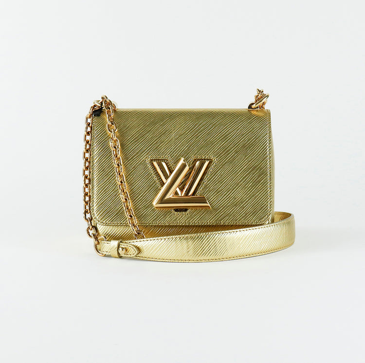 Bolso Louis Vuitton de la línea Twist PM, confeccionado en piel EPI color dorado, forro interno en alcántara color negro, con bandolera extraíble no ajustable, emblemático cierre LV twist al frente en la solapa, todos los herrajes en color dorado. ARTICULO DE SEGUNDA MANO EN MUY BUEN ESTADO. Cuenta con cubre polvo.