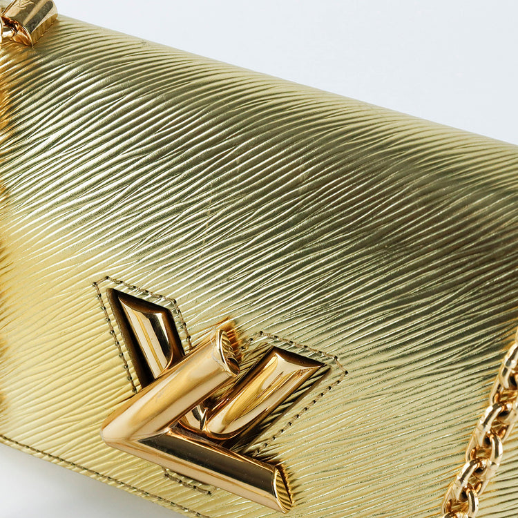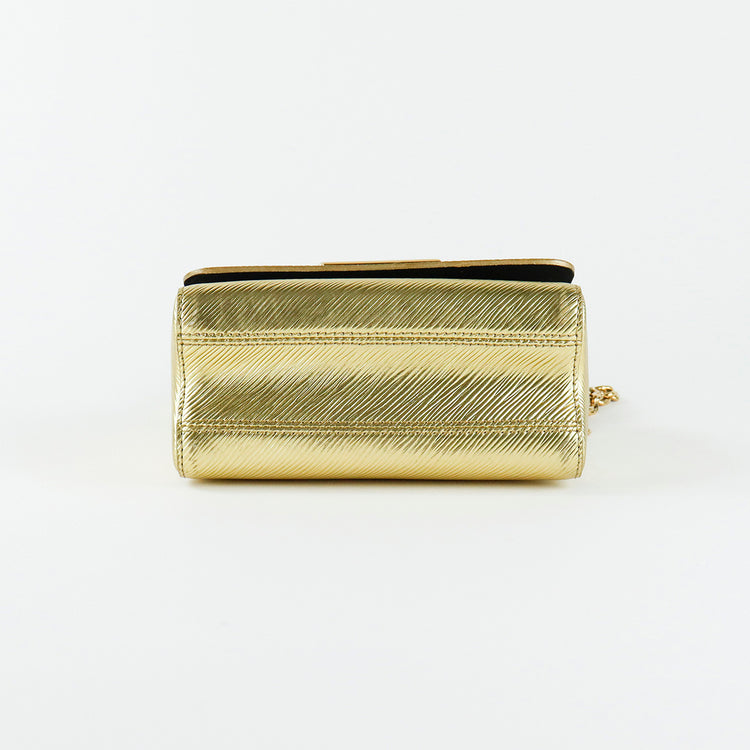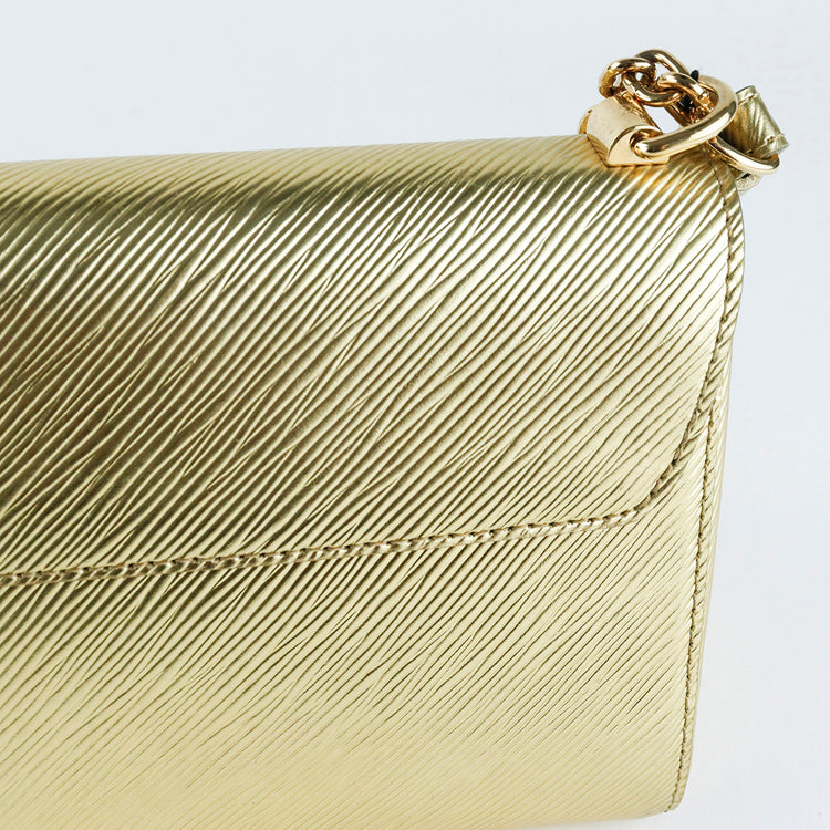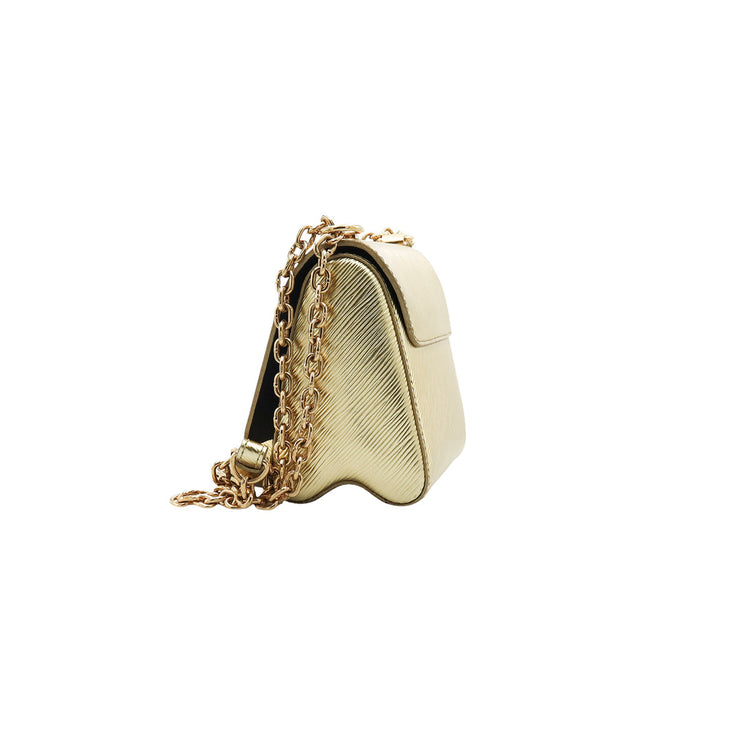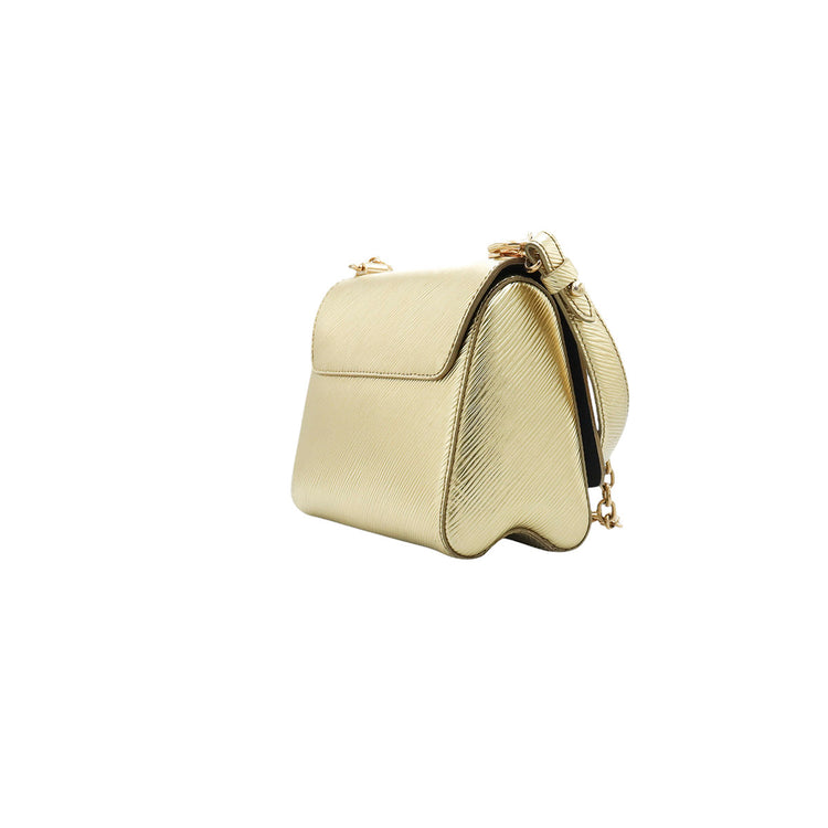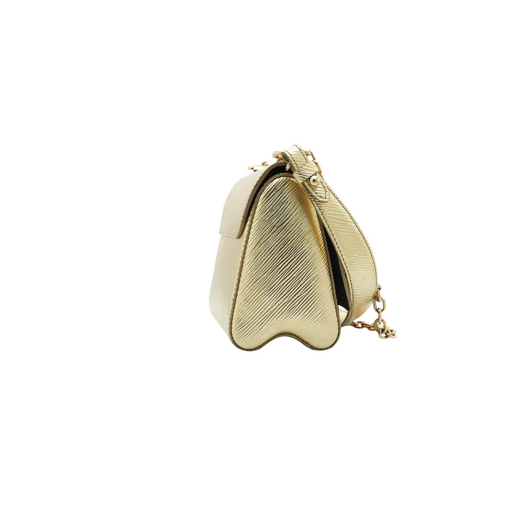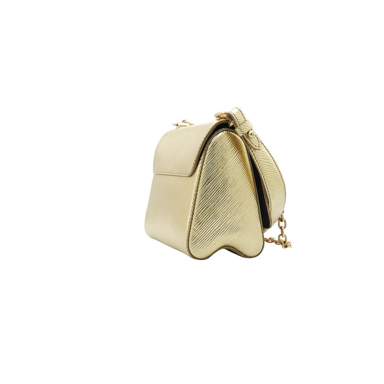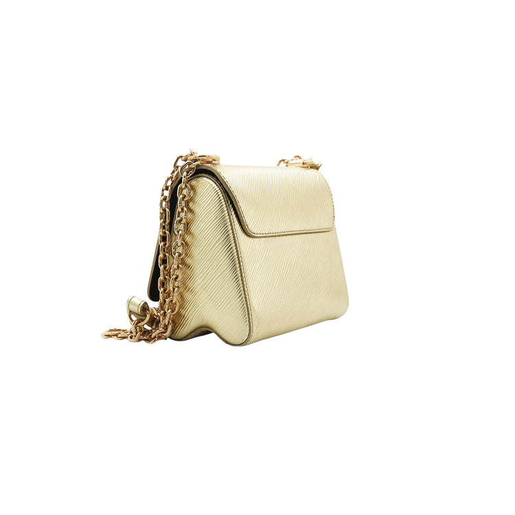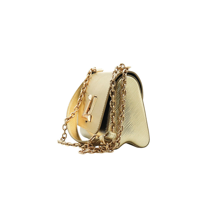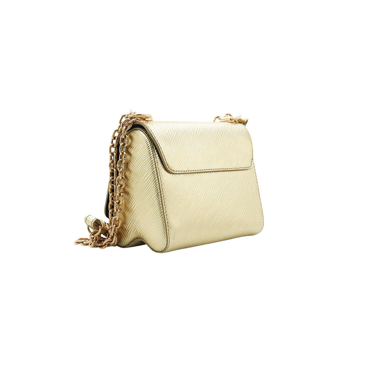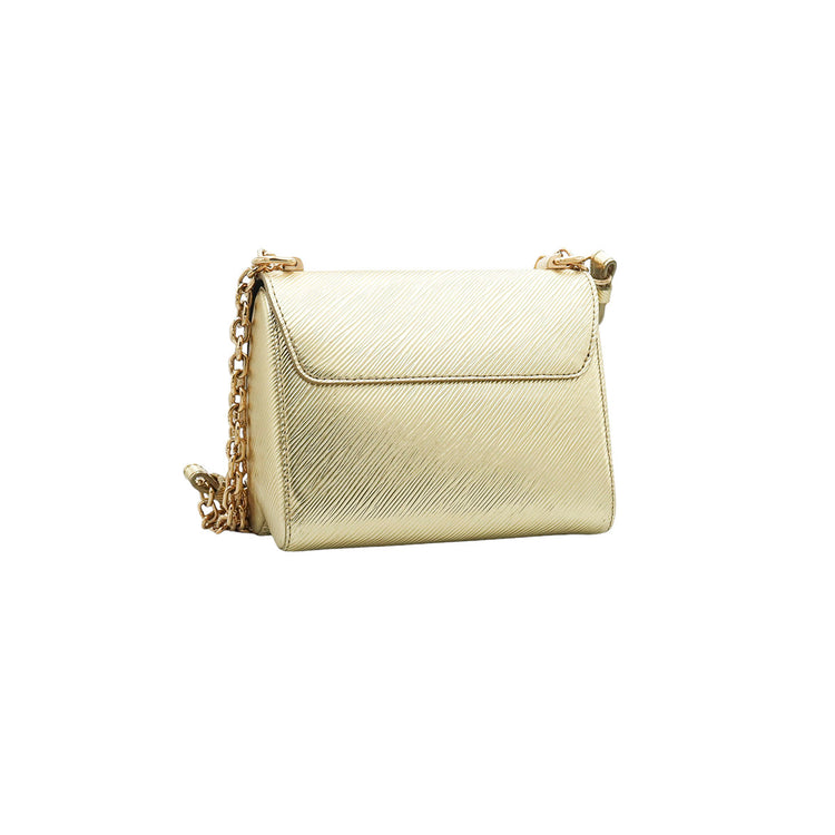 Bolso Louis Vuitton de la línea Twist PM, confeccionado en piel EPI color dorado, forro interno en alcántara color negro, con bandolera extraíble no ajustable, emblemático cierre LV twist al frente en la solapa, todos los herrajes en color dorado. ARTICULO DE SEGUNDA MANO EN MUY BUEN ESTADO. Cuenta con cubre polvo.