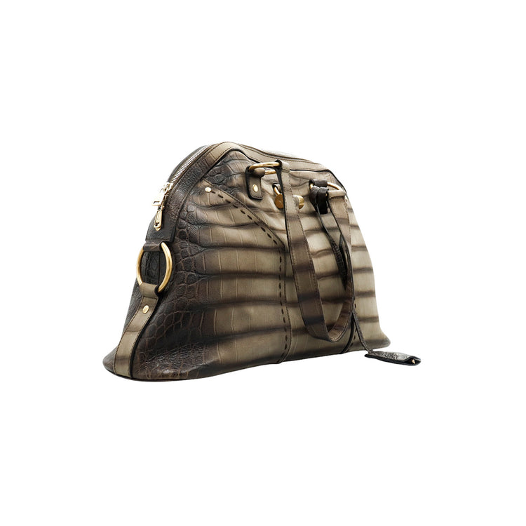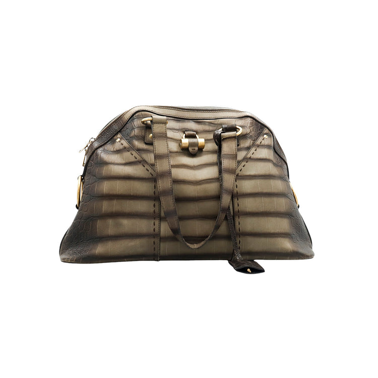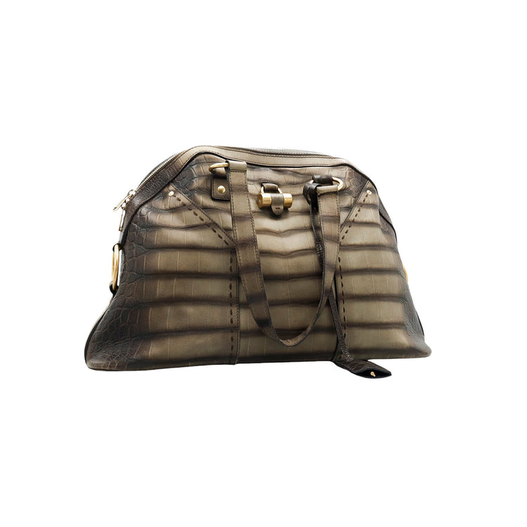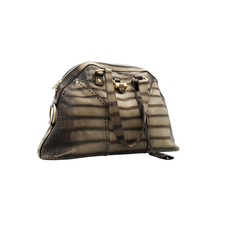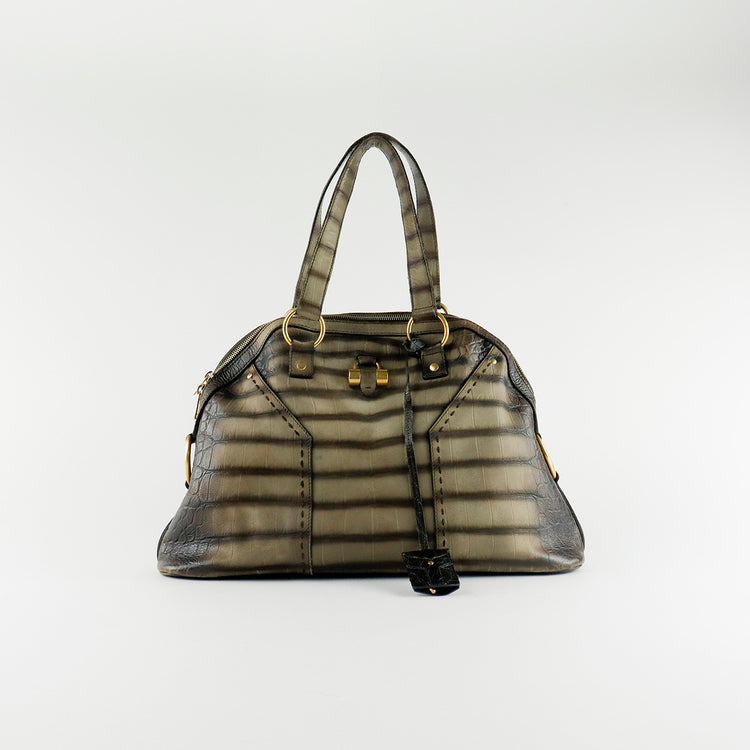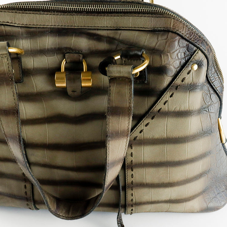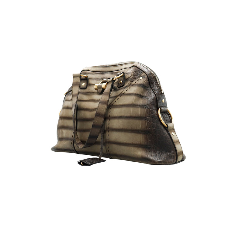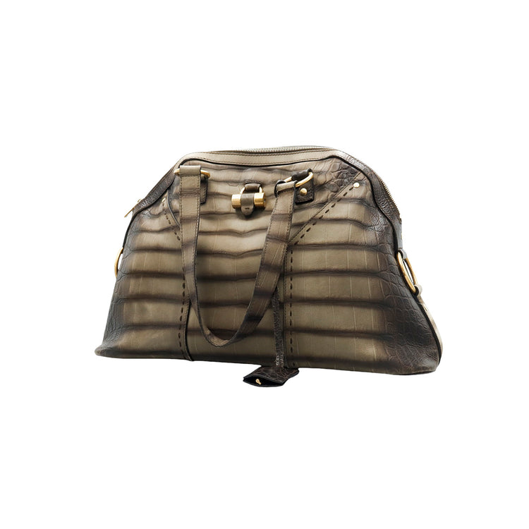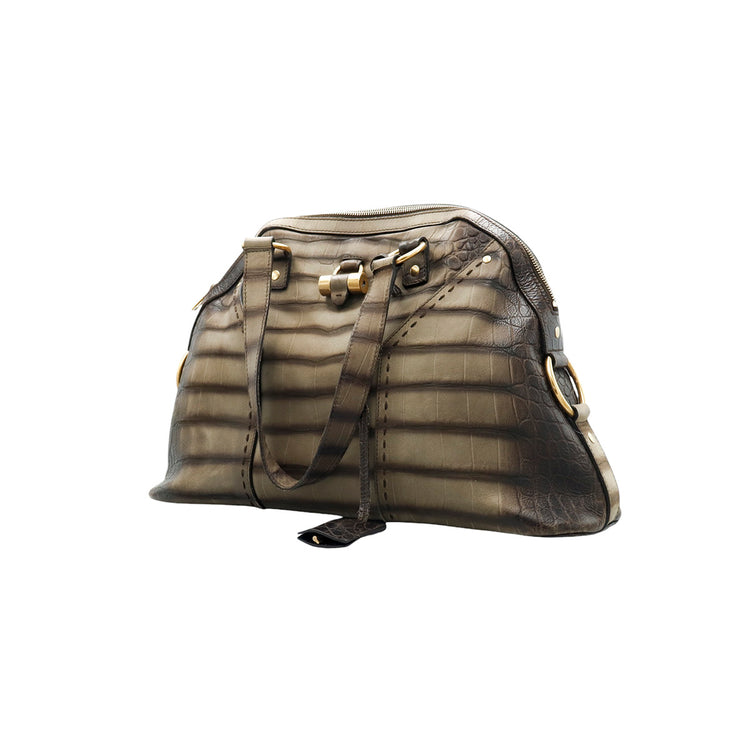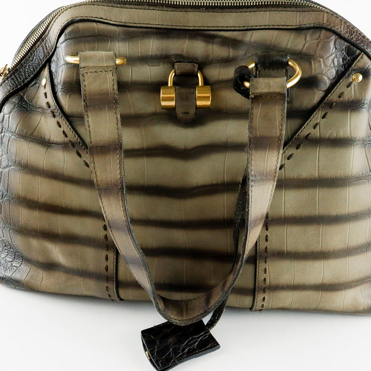 Bolso Yves Saint Laurent de la línea Muse, confeccionado en piel tipo exótica animal print, con candado y llave, forro interno en textil café, con 2 asas suaves y herrajes en color dorado. Leve rayón y detalles por uso regular.