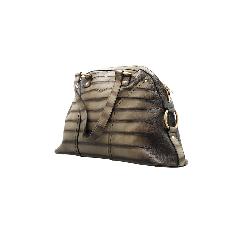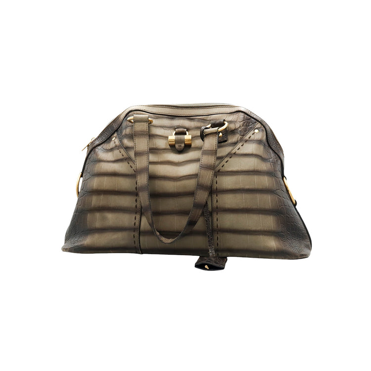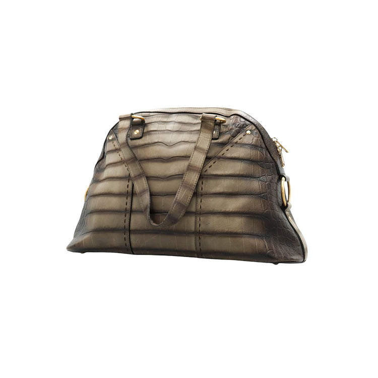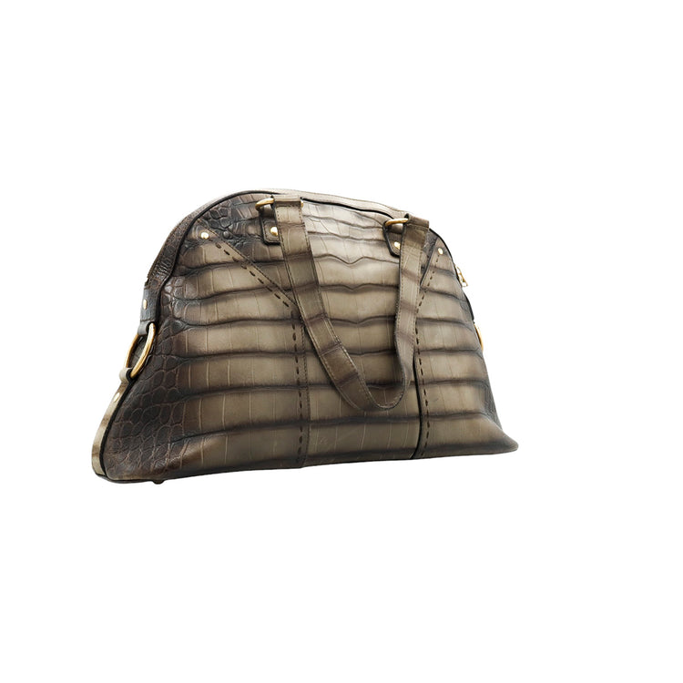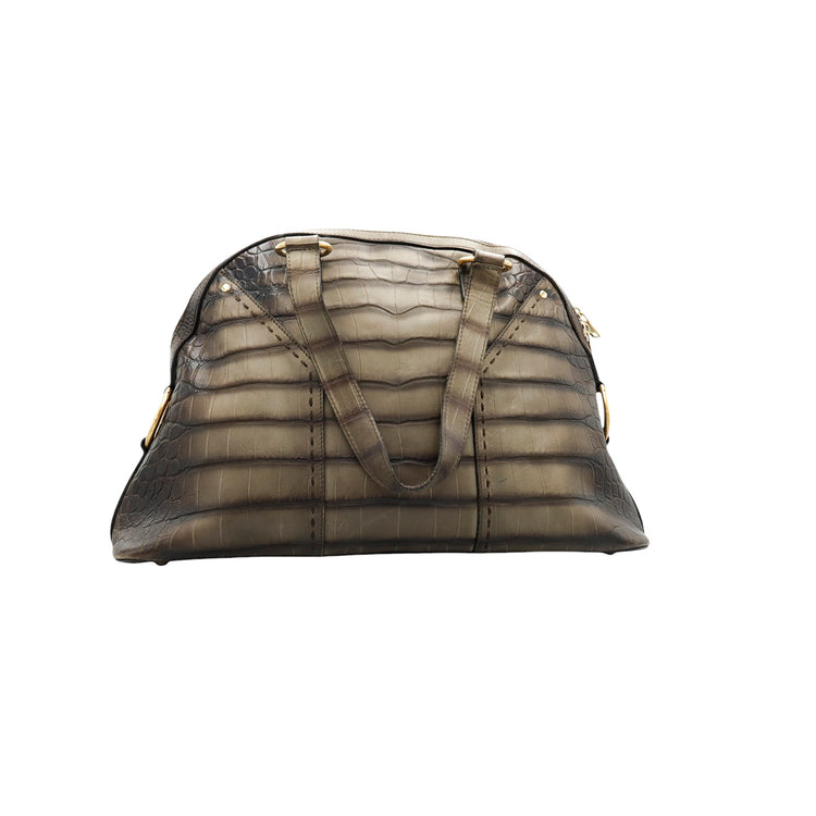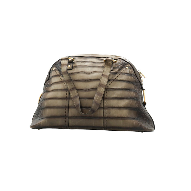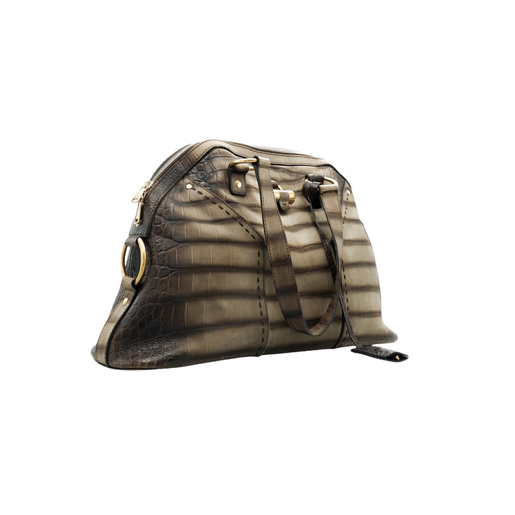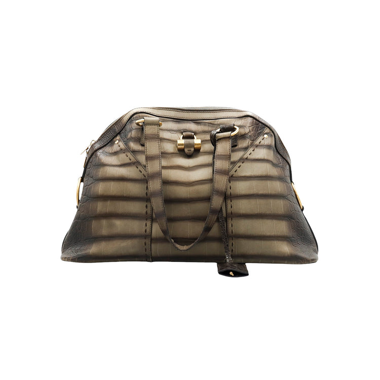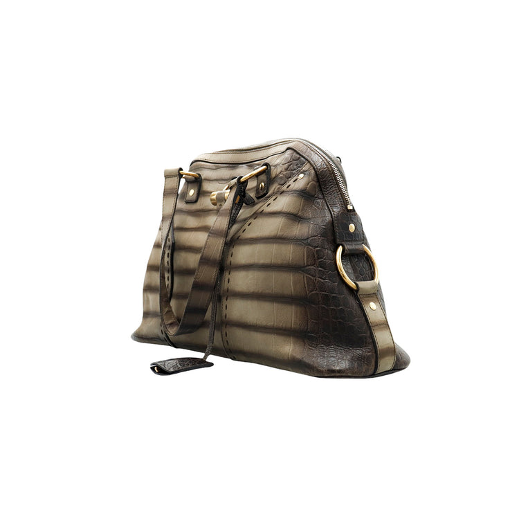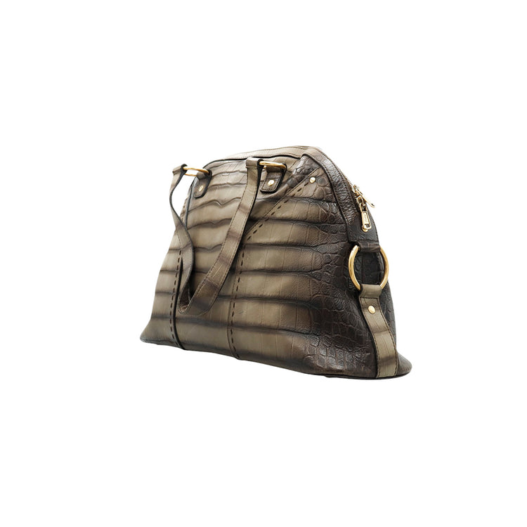 Bolso Yves Saint Laurent de la línea Muse, confeccionado en piel tipo exótica animal print, con candado y llave, forro interno en textil café, con 2 asas suaves y herrajes en color dorado. Leve rayón y detalles por uso regular.