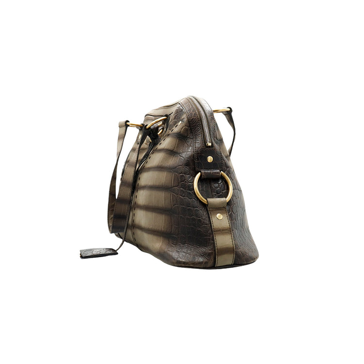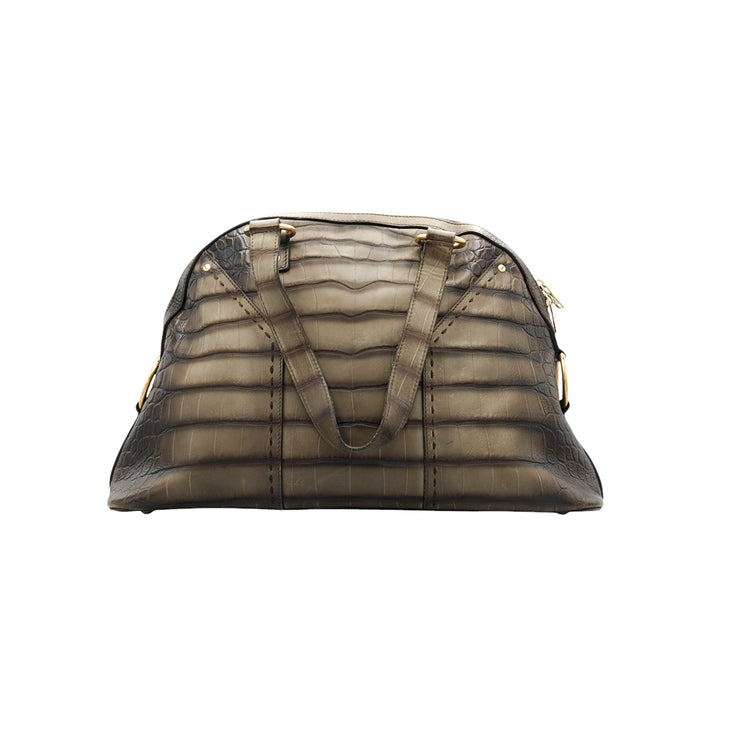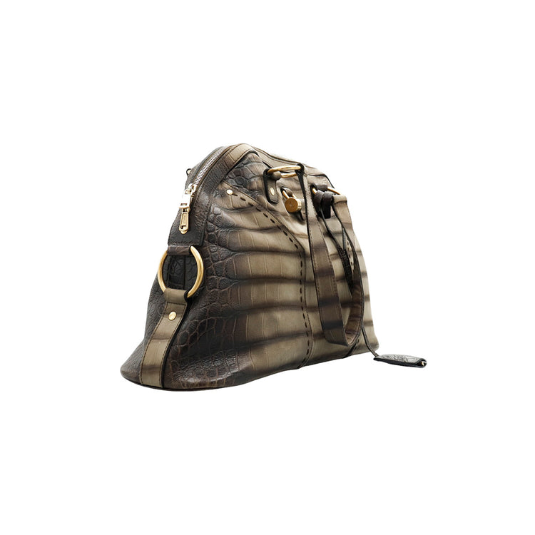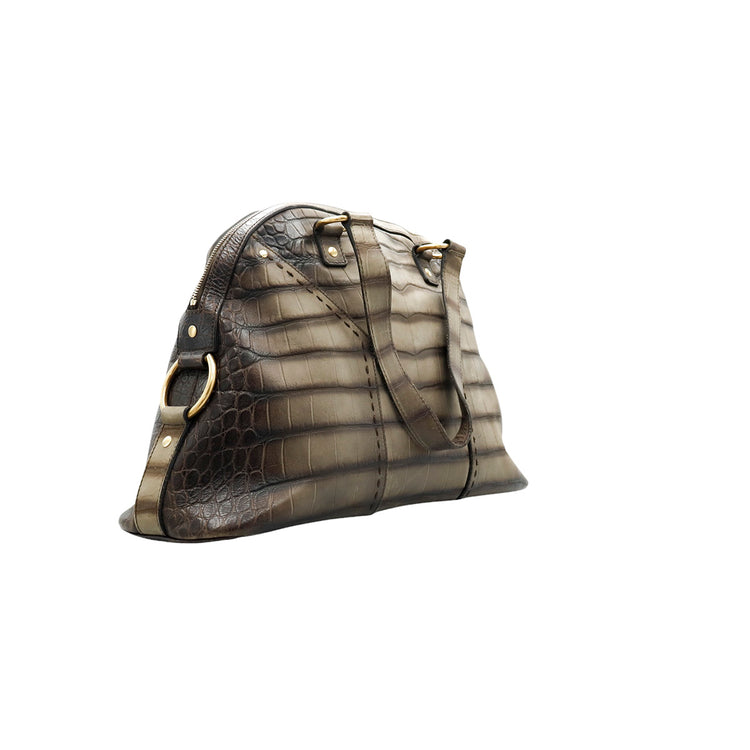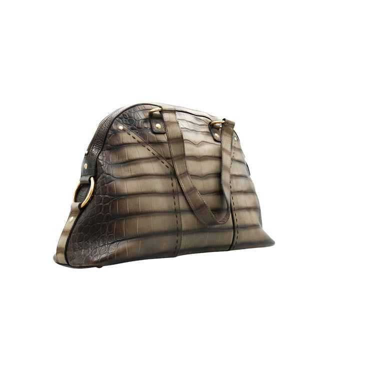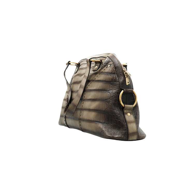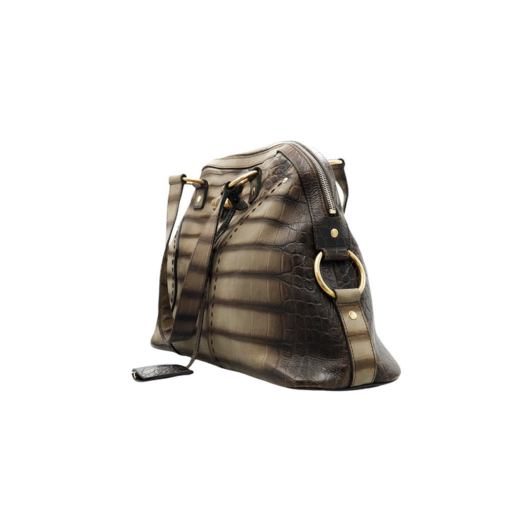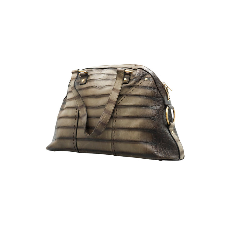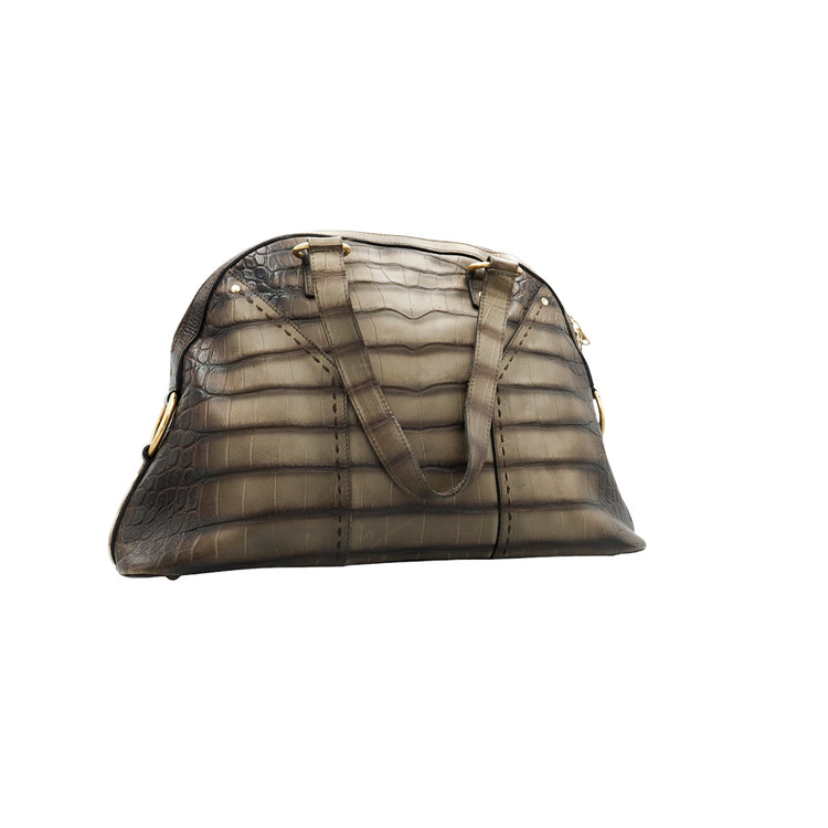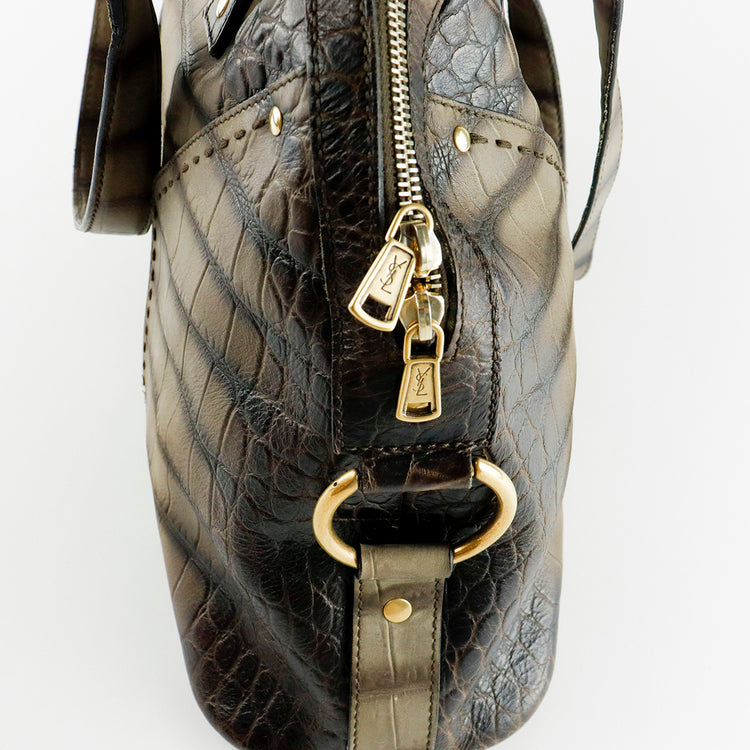 Bolso Yves Saint Laurent de la línea Muse, confeccionado en piel tipo exótica animal print, con candado y llave, forro interno en textil café, con 2 asas suaves y herrajes en color dorado. Leve rayón y detalles por uso regular.
