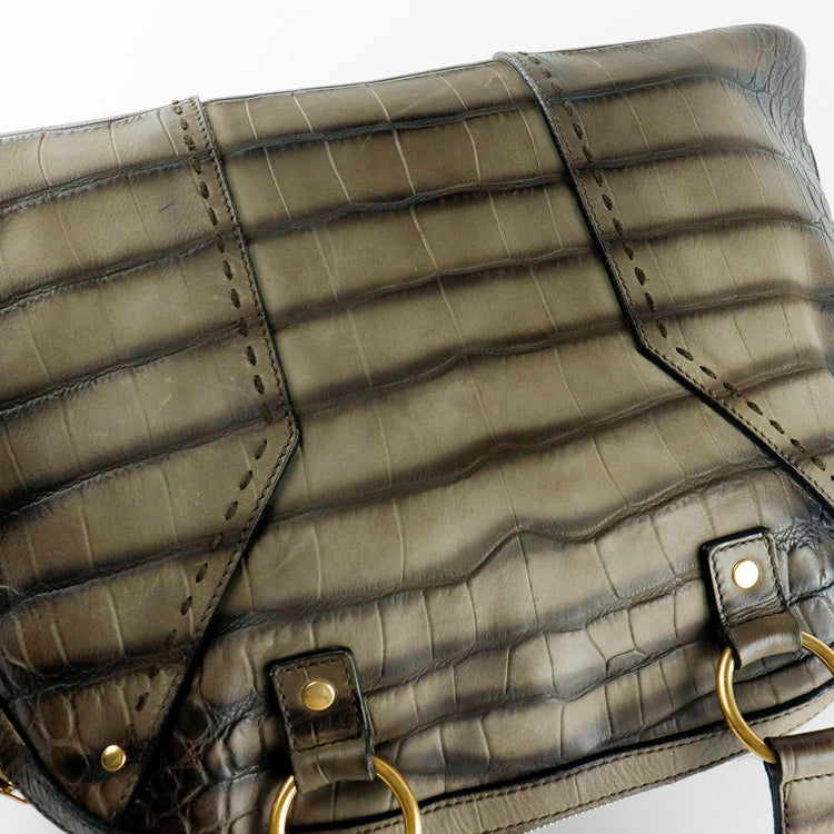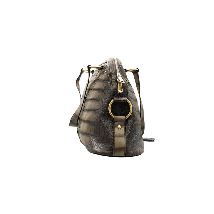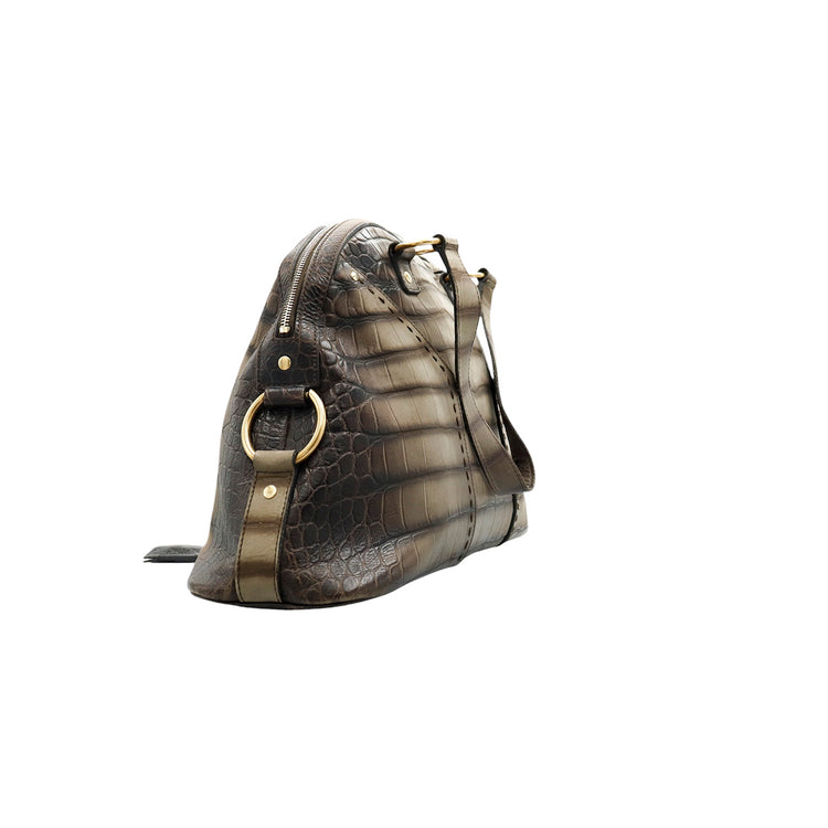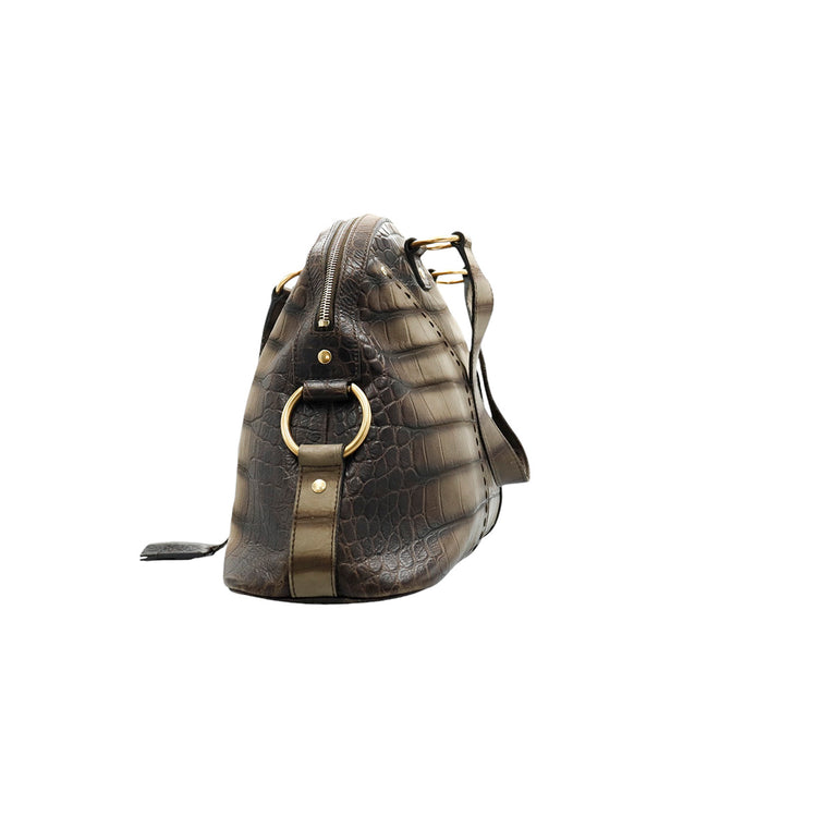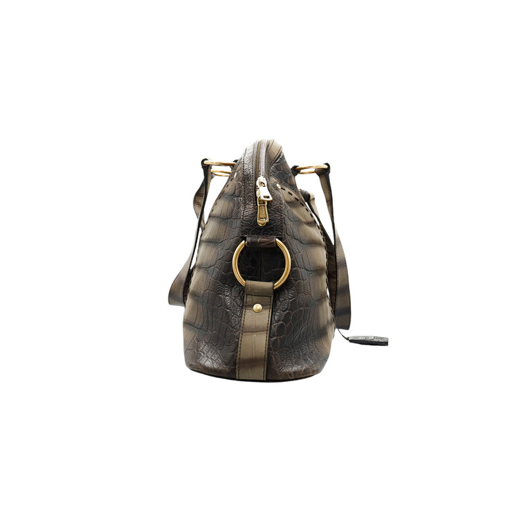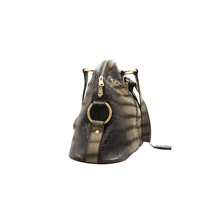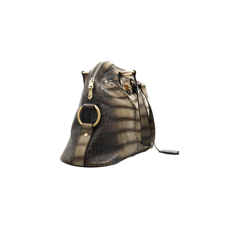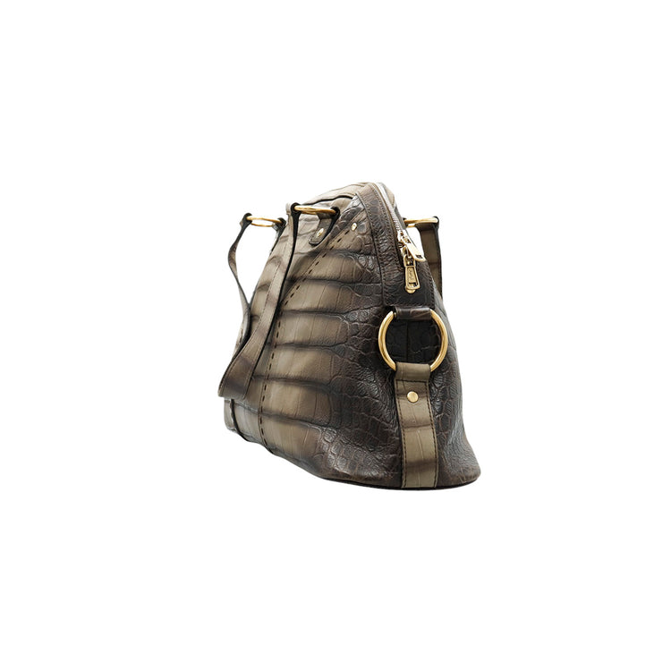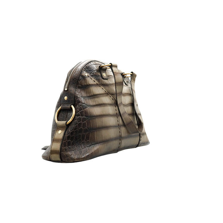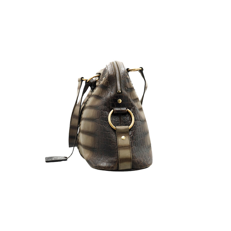 Bolso Yves Saint Laurent de la línea Muse, confeccionado en piel tipo exótica animal print, con candado y llave, forro interno en textil café, con 2 asas suaves y herrajes en color dorado. Leve rayón y detalles por uso regular.