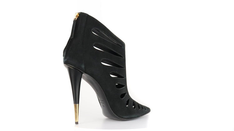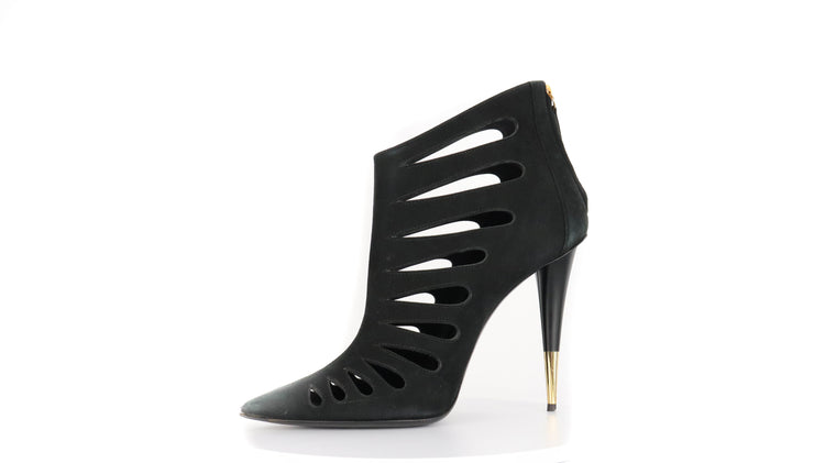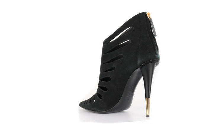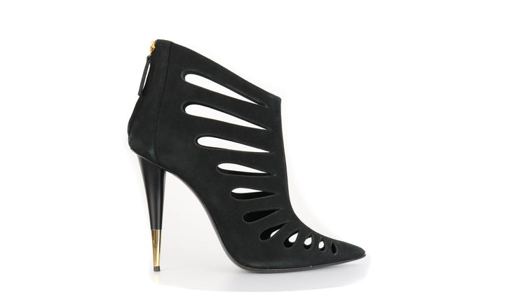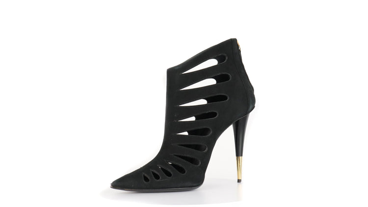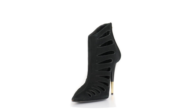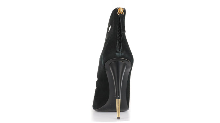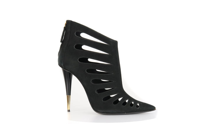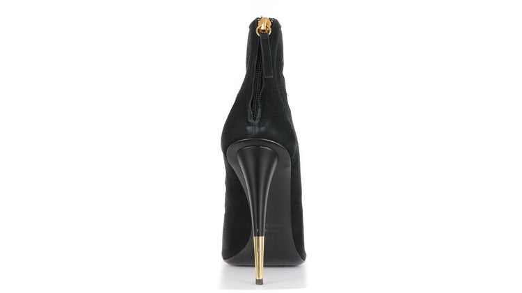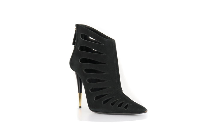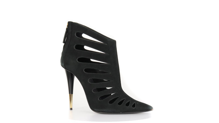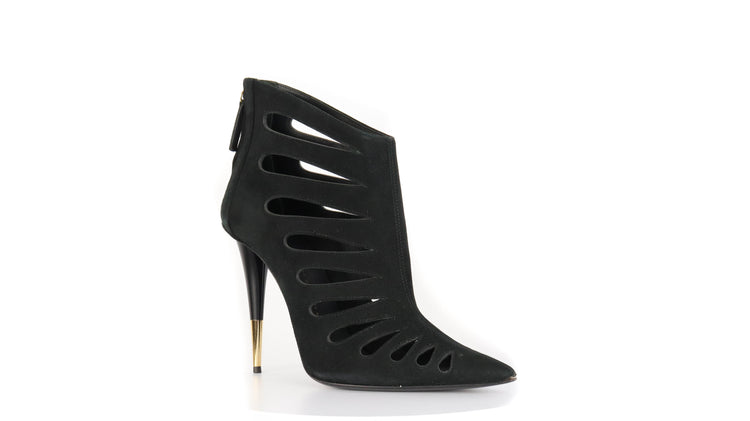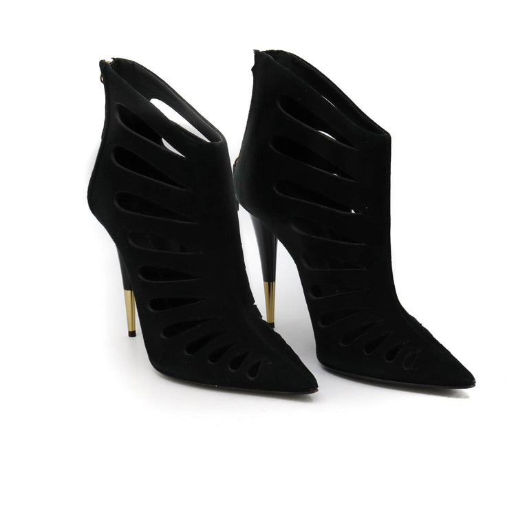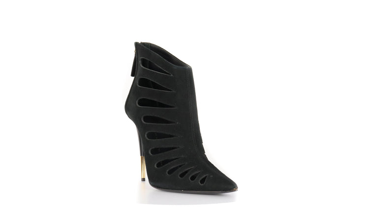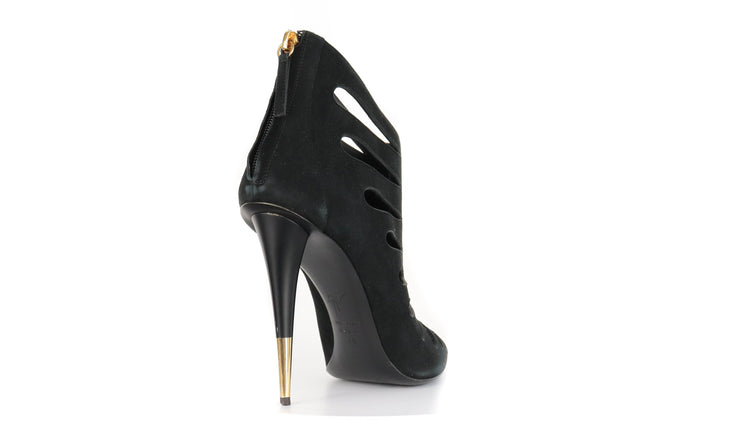 Botines Giuseppe Zanotti, elaborados en gamuza negra, con detalles de aberturas a los costados, detalle dorado en la punta del tacón, cierre con cremallera en talón.