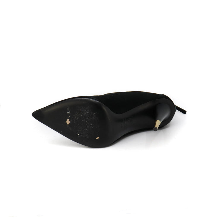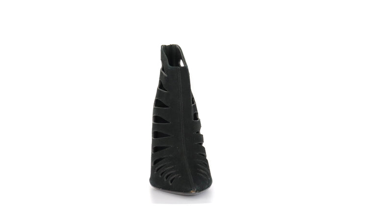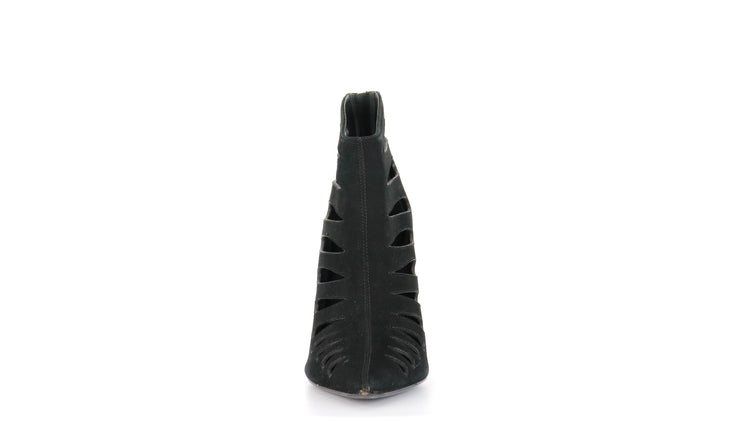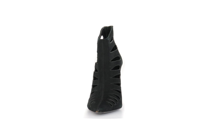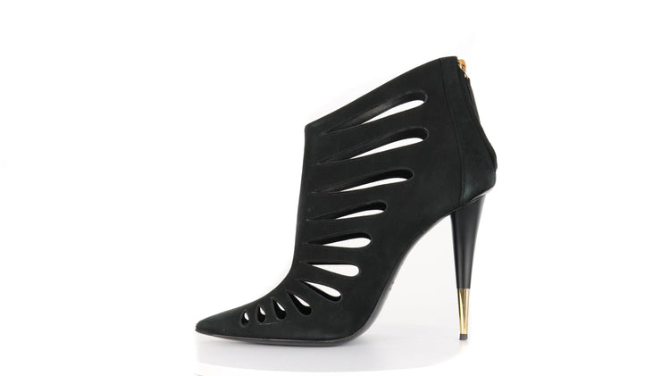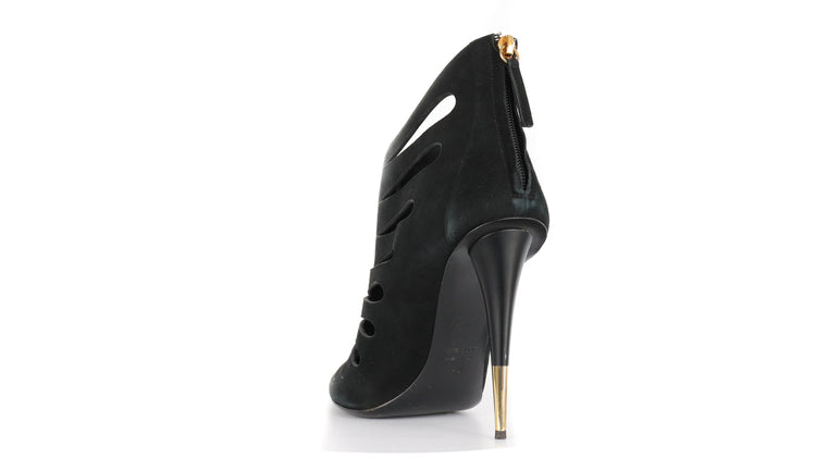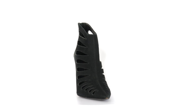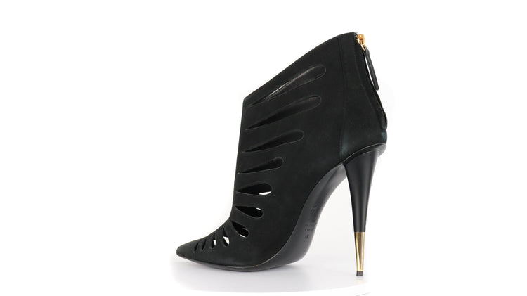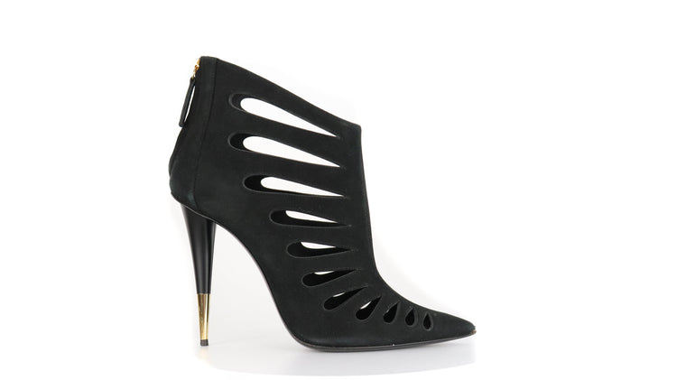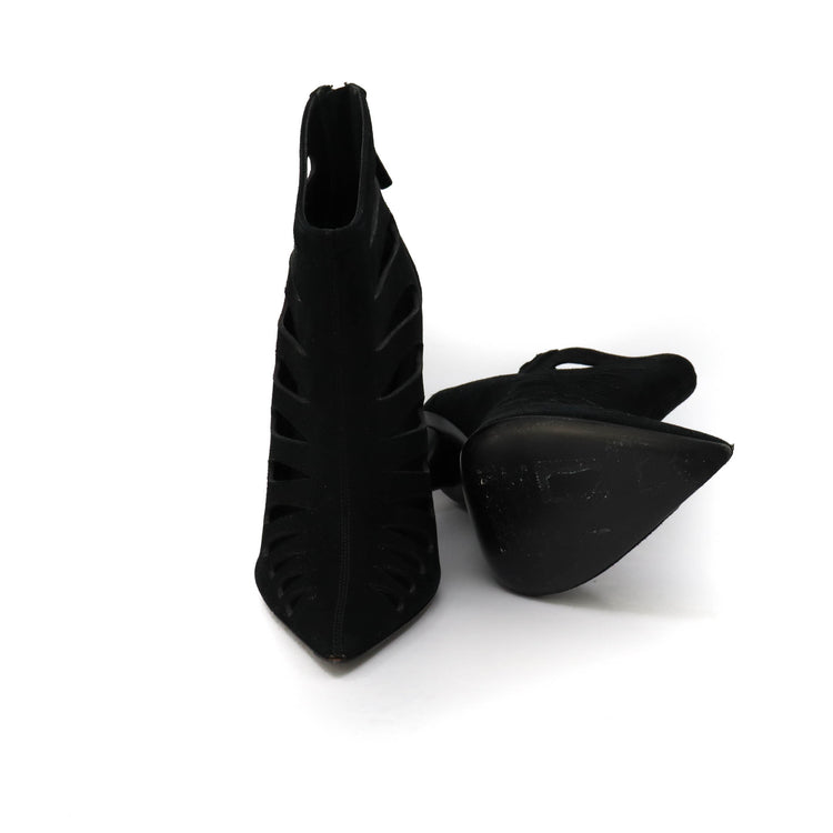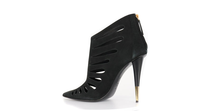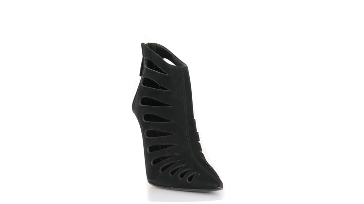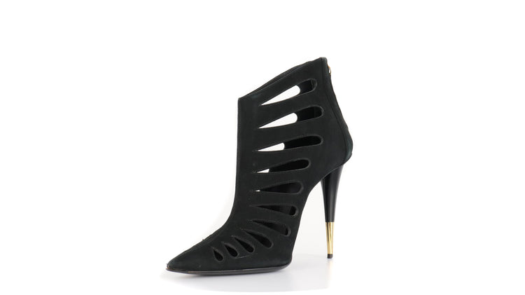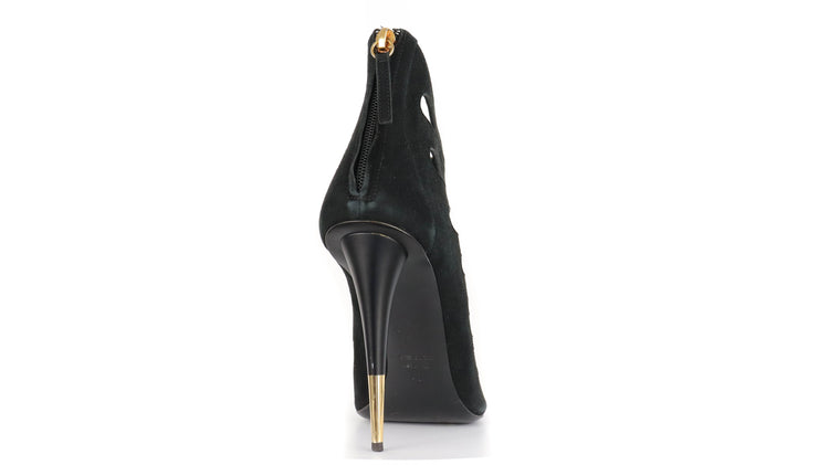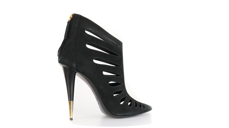 Botines Giuseppe Zanotti, elaborados en gamuza negra, con detalles de aberturas a los costados, detalle dorado en la punta del tacón, cierre con cremallera en talón.