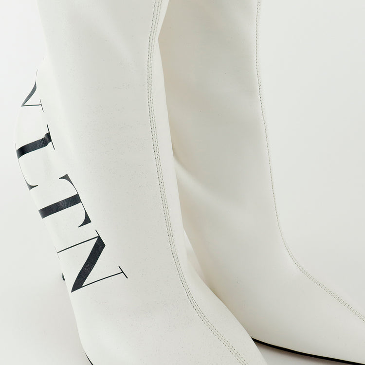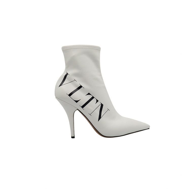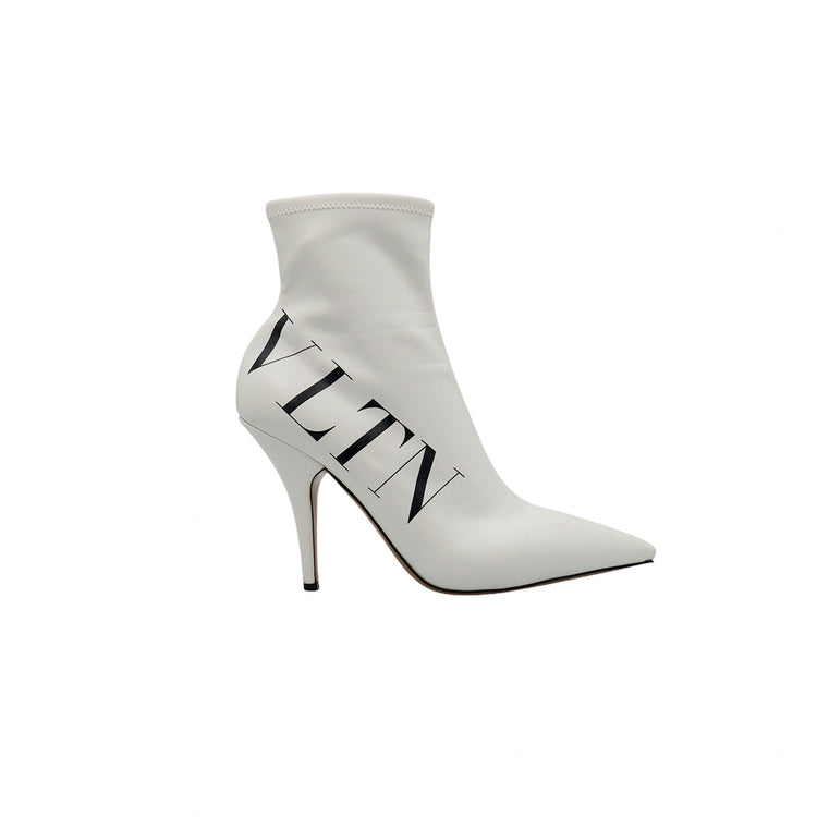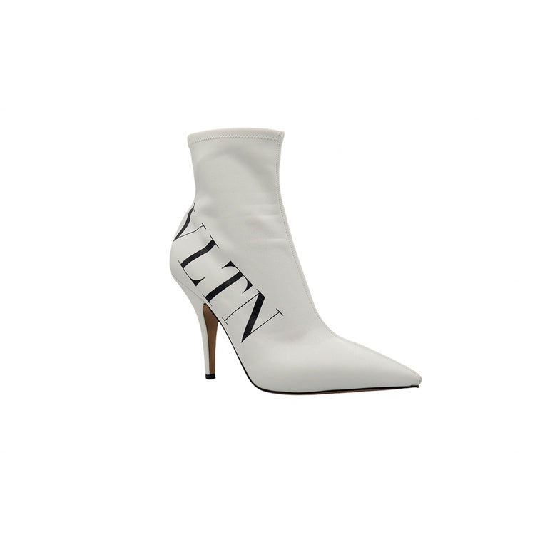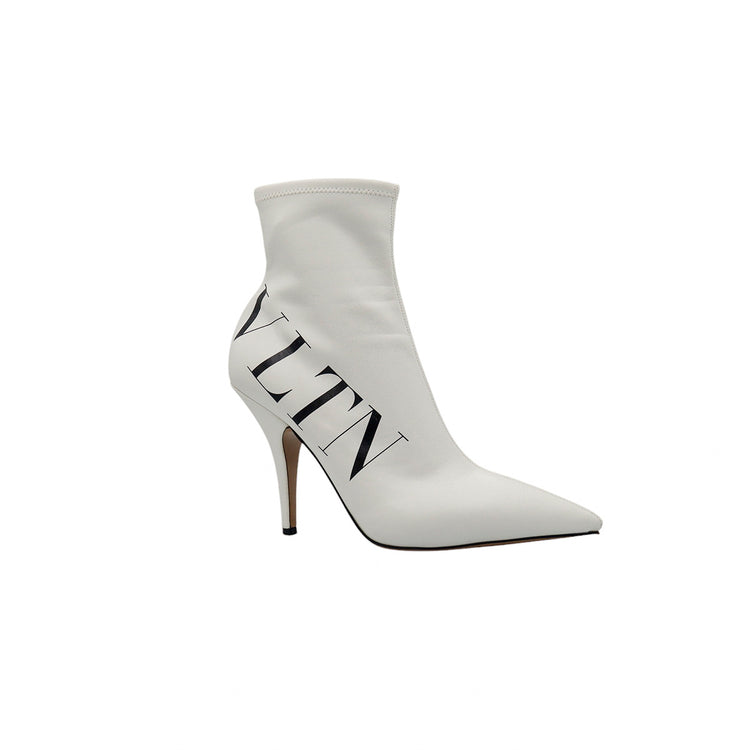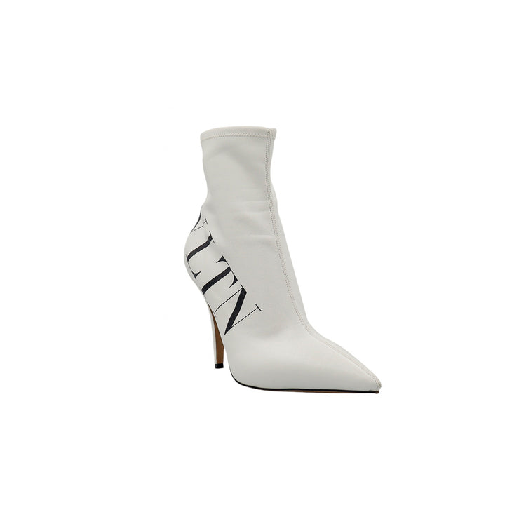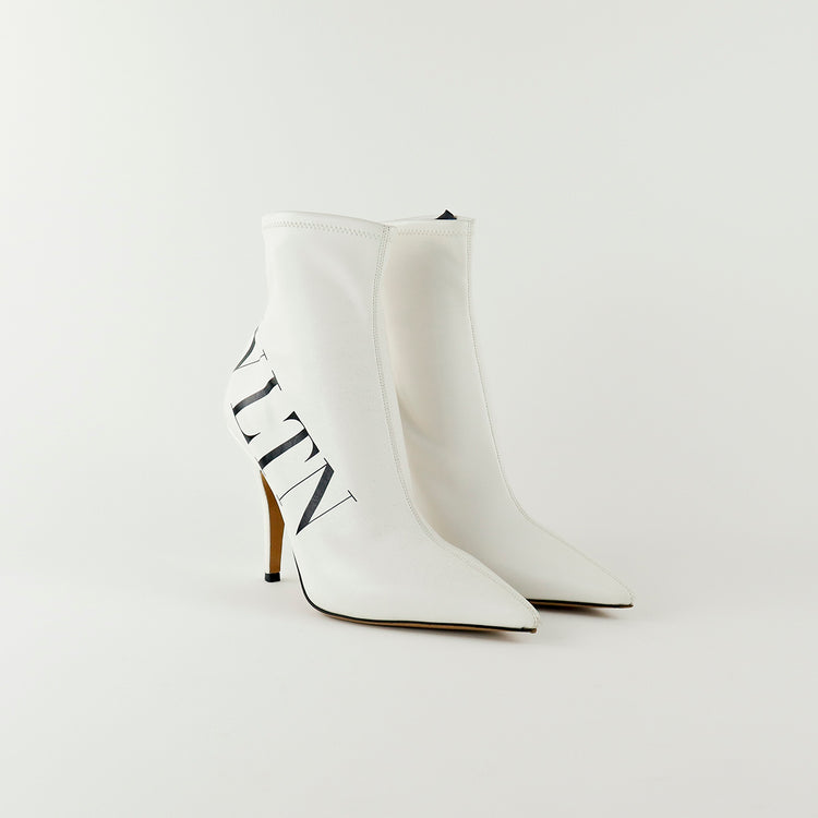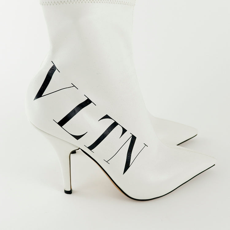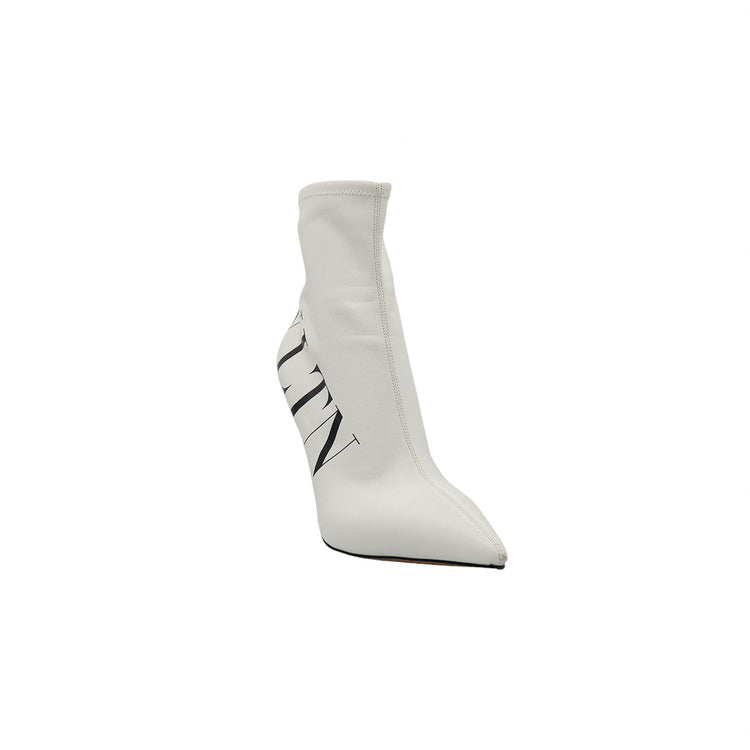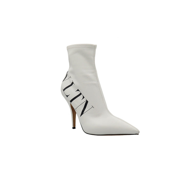 Botines marca Valentino Garavani tipo sock boots, confeccionados en tipo piel sintética color blanco con elástico, con el rótulo VLTN a los costados, suela con poco desgaste por uso, sucios con pequeñas motas en color negro.