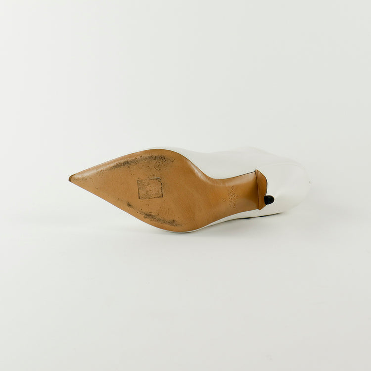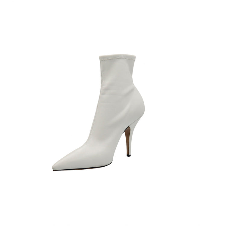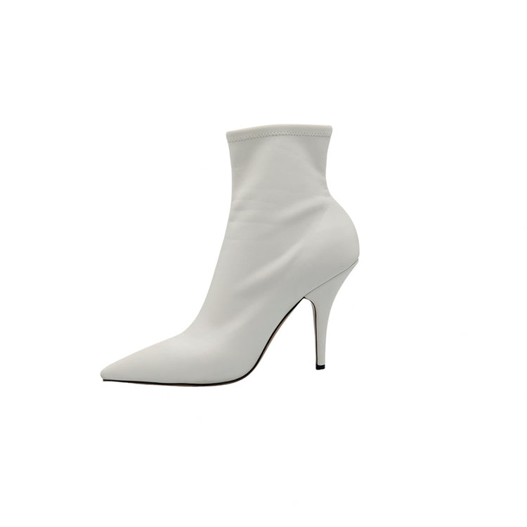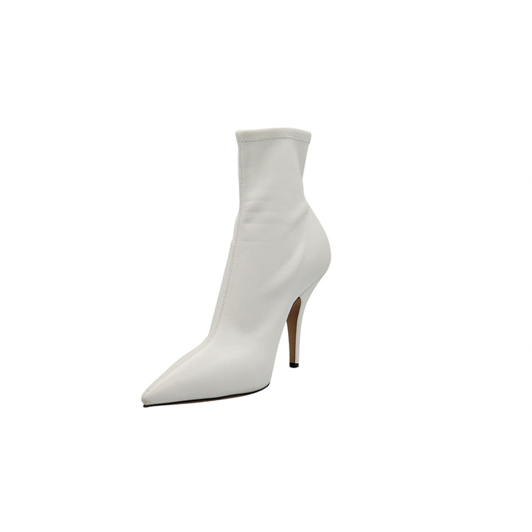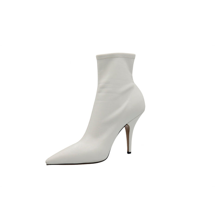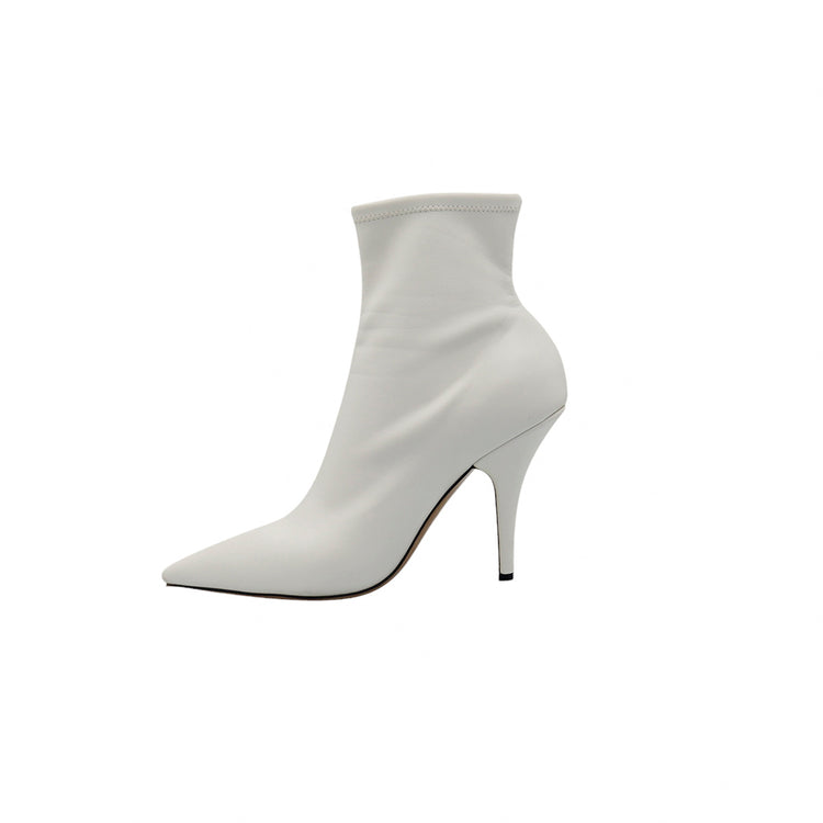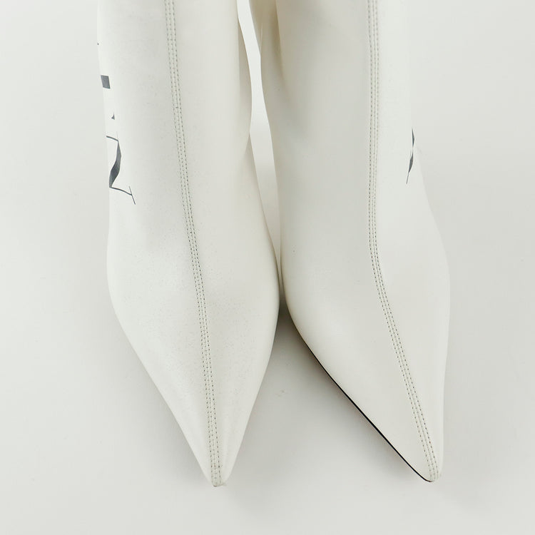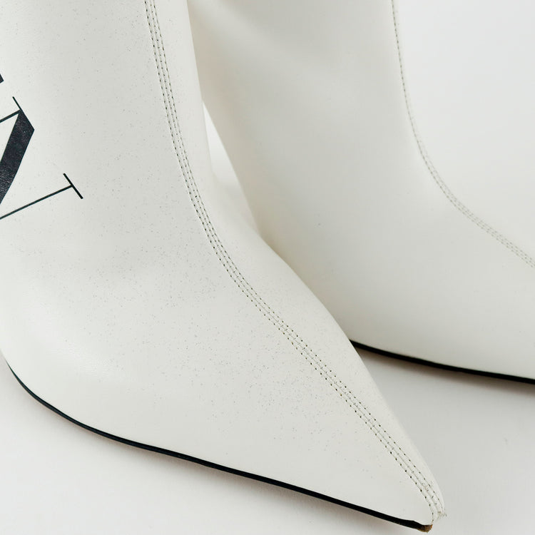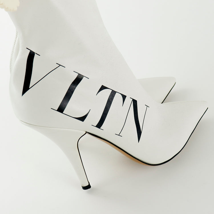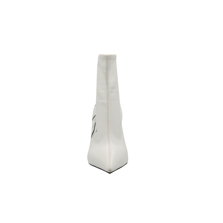 Botines marca Valentino Garavani tipo sock boots, confeccionados en tipo piel sintética color blanco con elástico, con el rótulo VLTN a los costados, suela con poco desgaste por uso, sucios con pequeñas motas en color negro.
