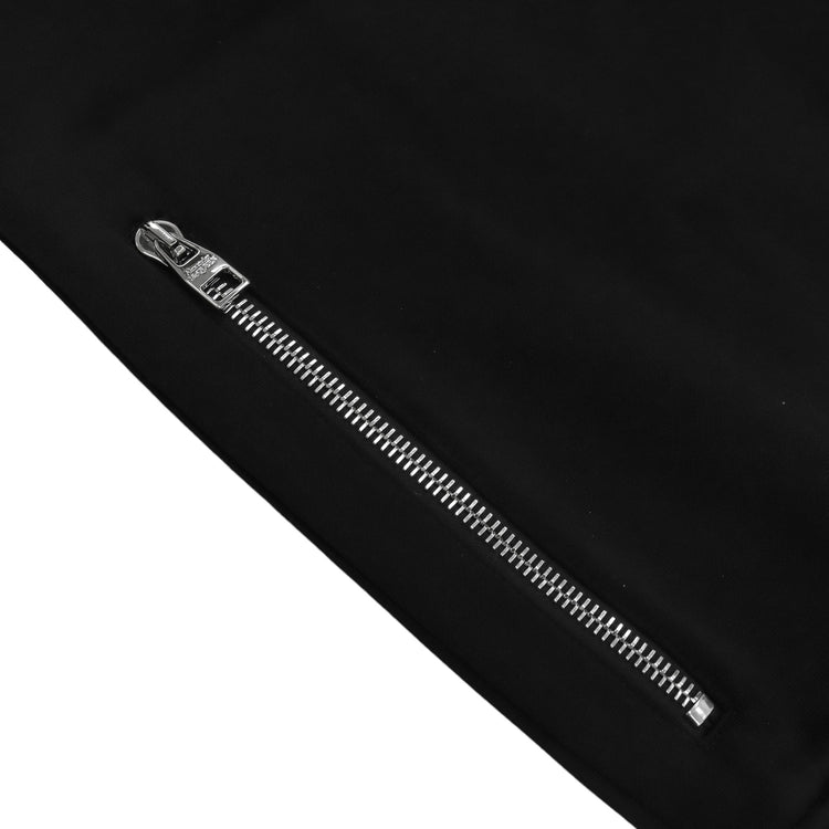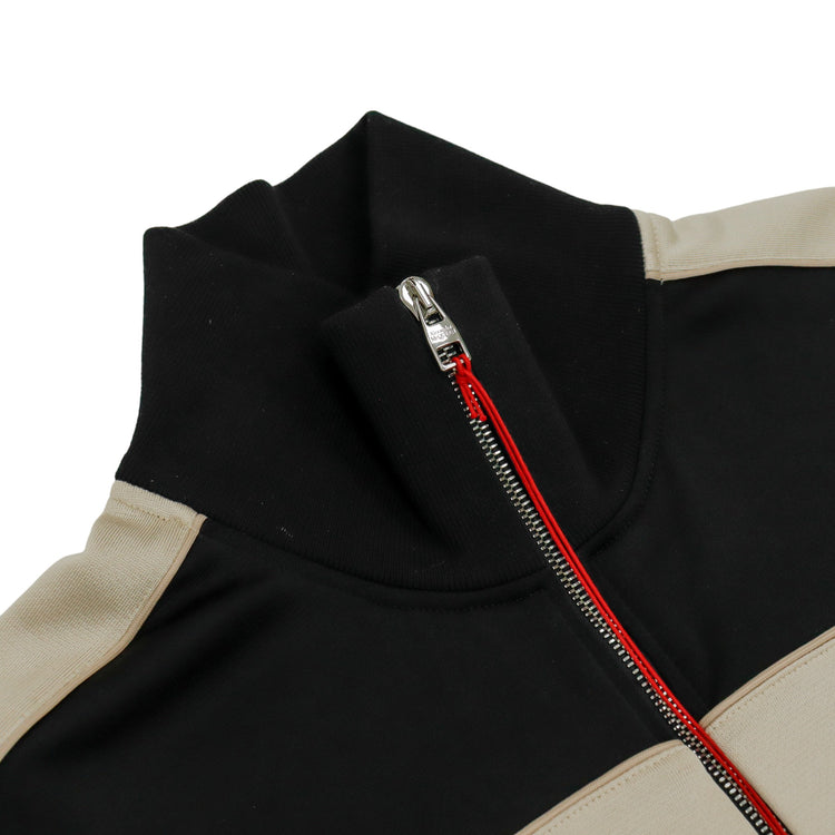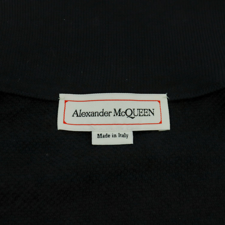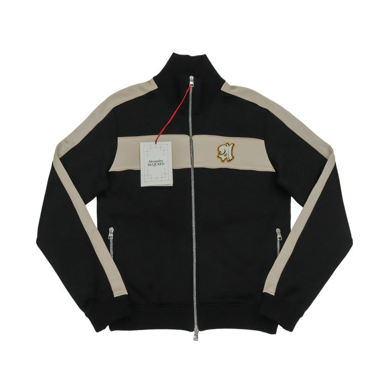 Chaqueta Alexander McQueen, confeccionada en poliéster-algodón en color negro con franjas en color beige al pecho y en las mangas, con cierre plateado de cremallera bidireccional al frente, cuenta con etiquetas. ARTÍCULO DE SEGUNDA MANO EN MUY BUEN ESTADO (Nunca Usado). No cuenta con cubre polvo. Talla L (Reducida).