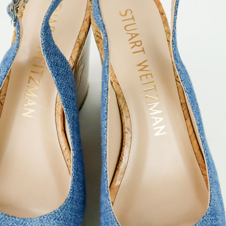 Sandalias de plataforma Stuart Weitzman en textil tipo mezclilla, con plataforma efecto amaderado. Un diseño moderno, cómodo y versátil.