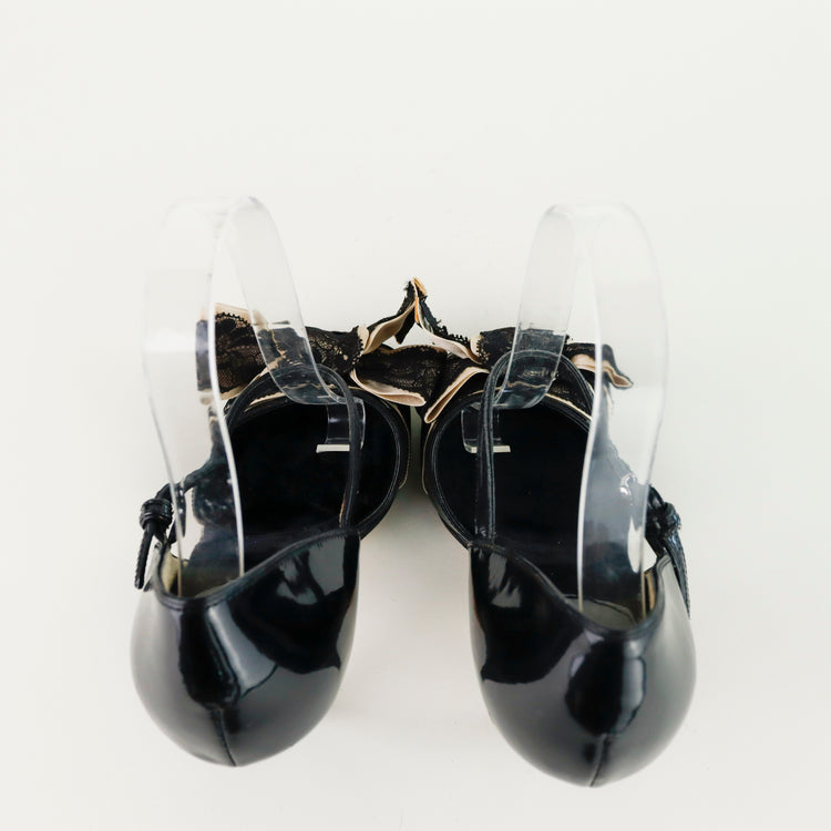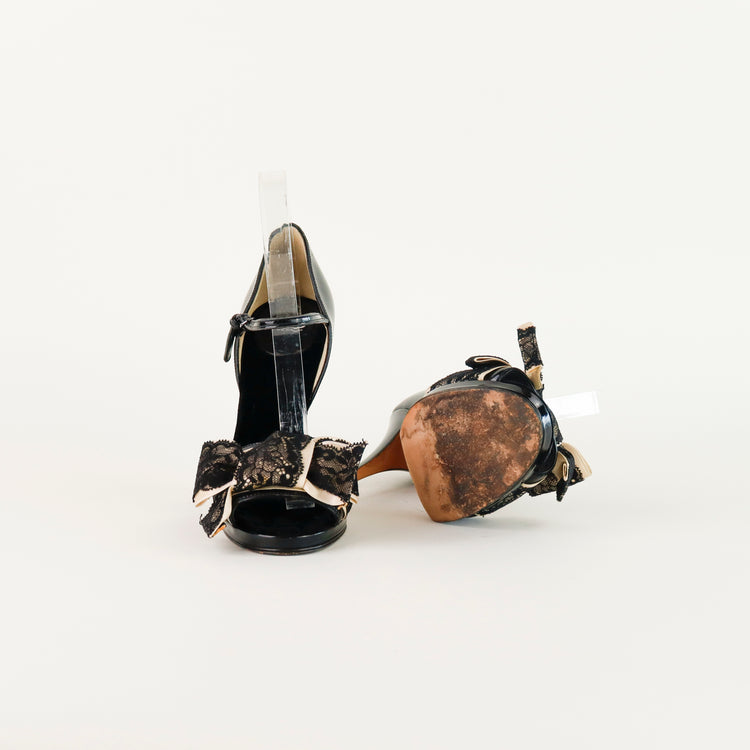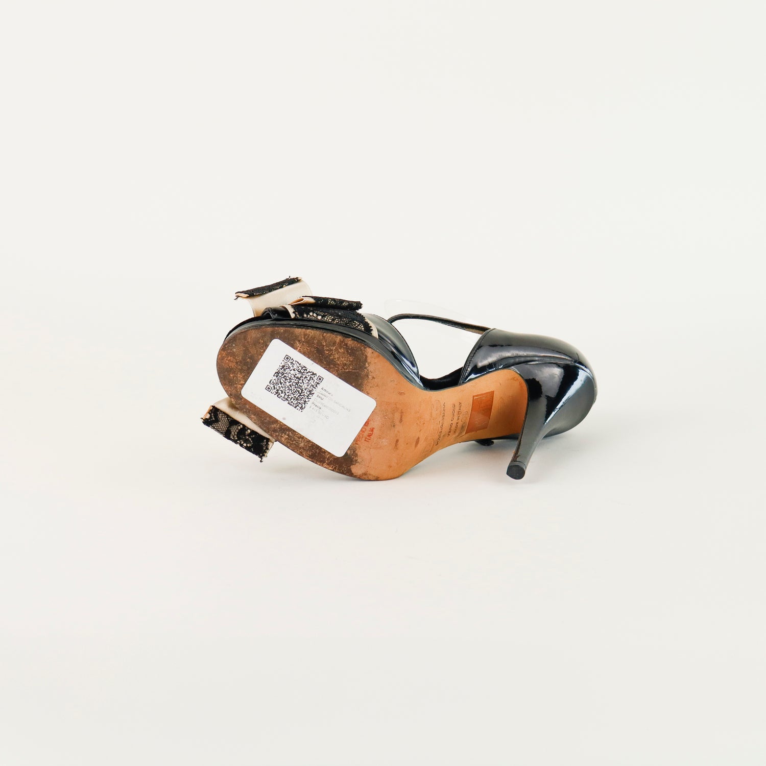 Sandalias de tacón Dolce & Gabbana en charol y terciopelo negro con moño frontal.