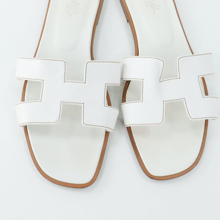 Sandalias Hermès en piel color blanco, con la emblemática “H” al frente. Un diseño icónico, elegante y atemporal.