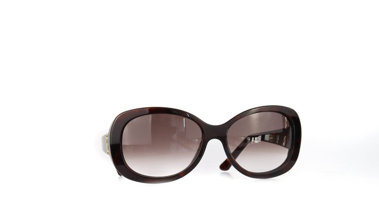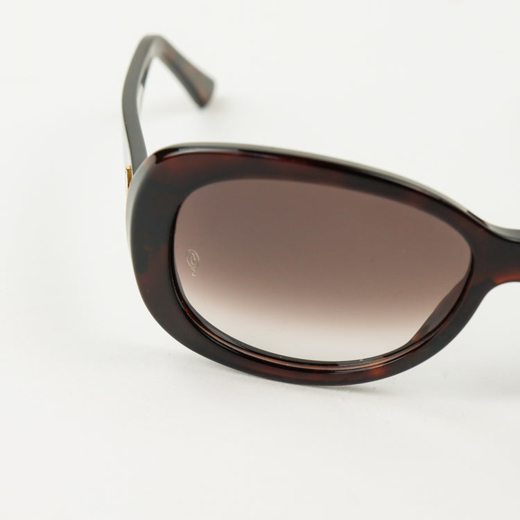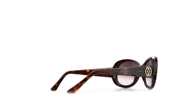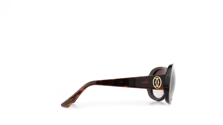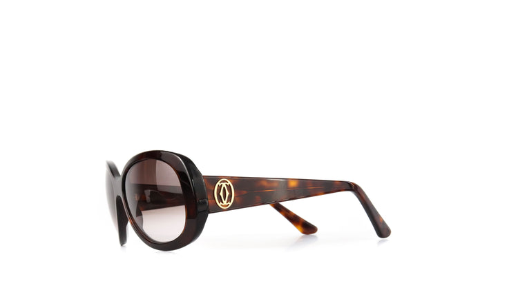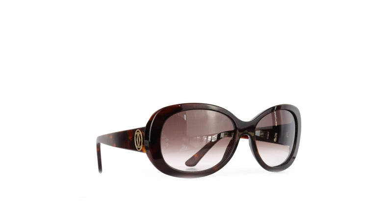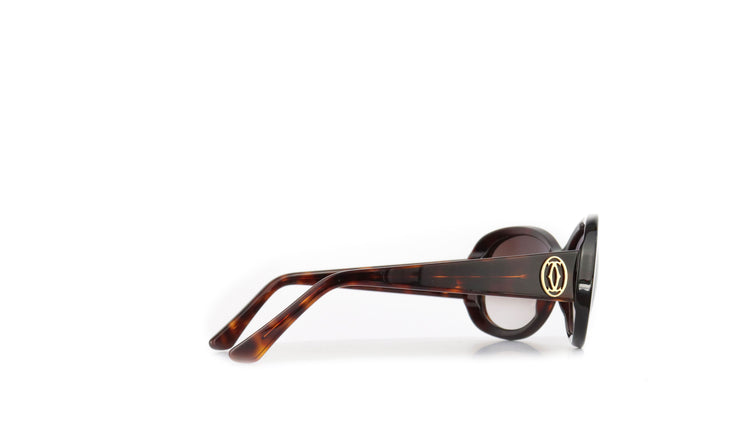 Gafas para sol de la marca Cartier. Confeccionados de acrílico en estampado tipo carey. Ligeros signos de uso a través de la moldura. Patillas con logo en incrustación dorada de la marca. Raspones en lente izquierdo.