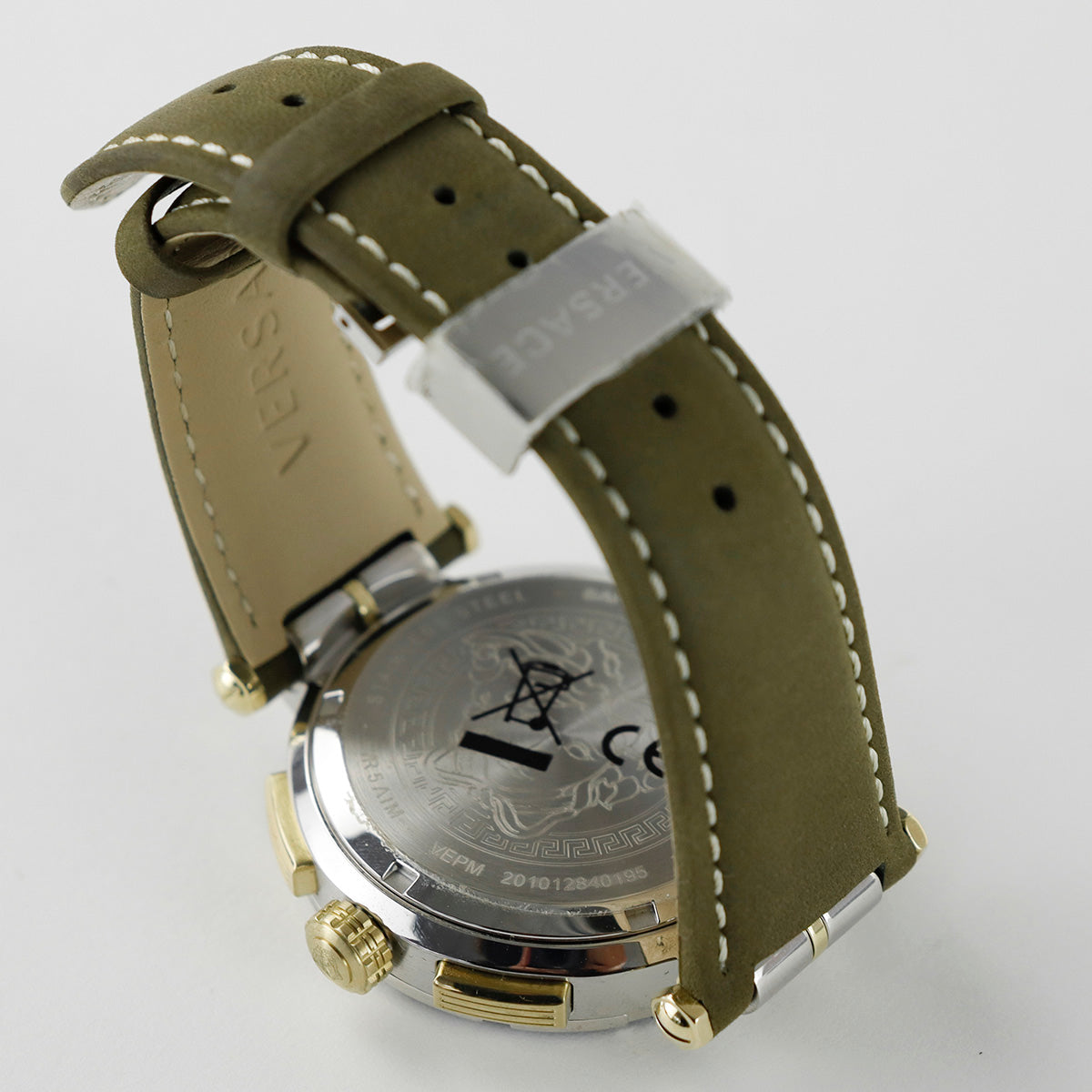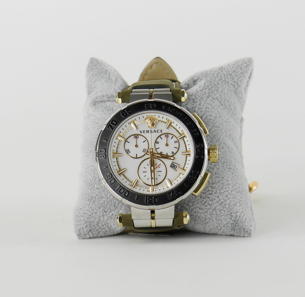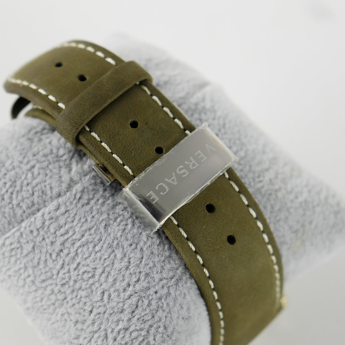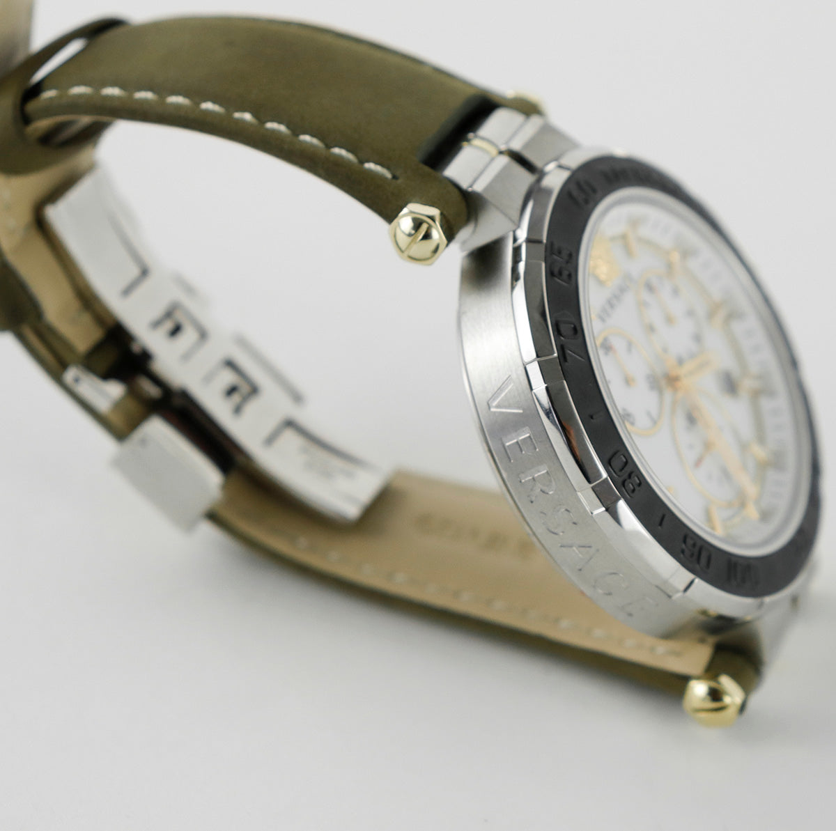 Reloj con maquinaria de cuarzo de la marca Versace, confeccionado con caja de metal 45 mm y pulso de piel color verde olivo, cuenta con taquímetro y fechador.