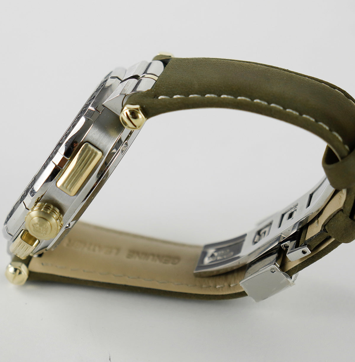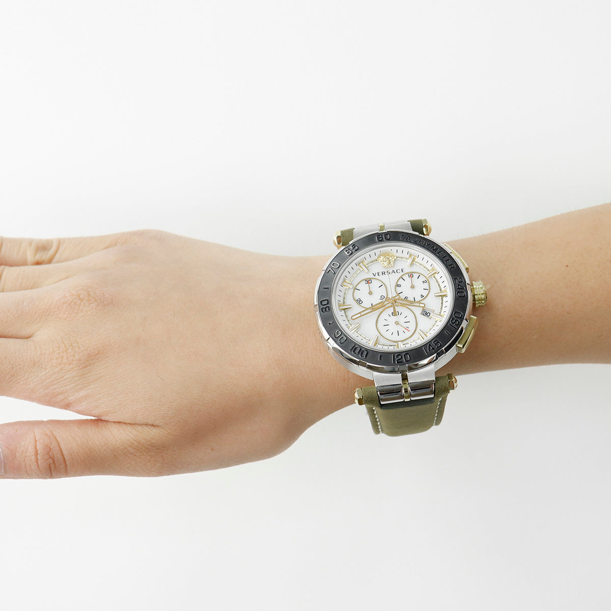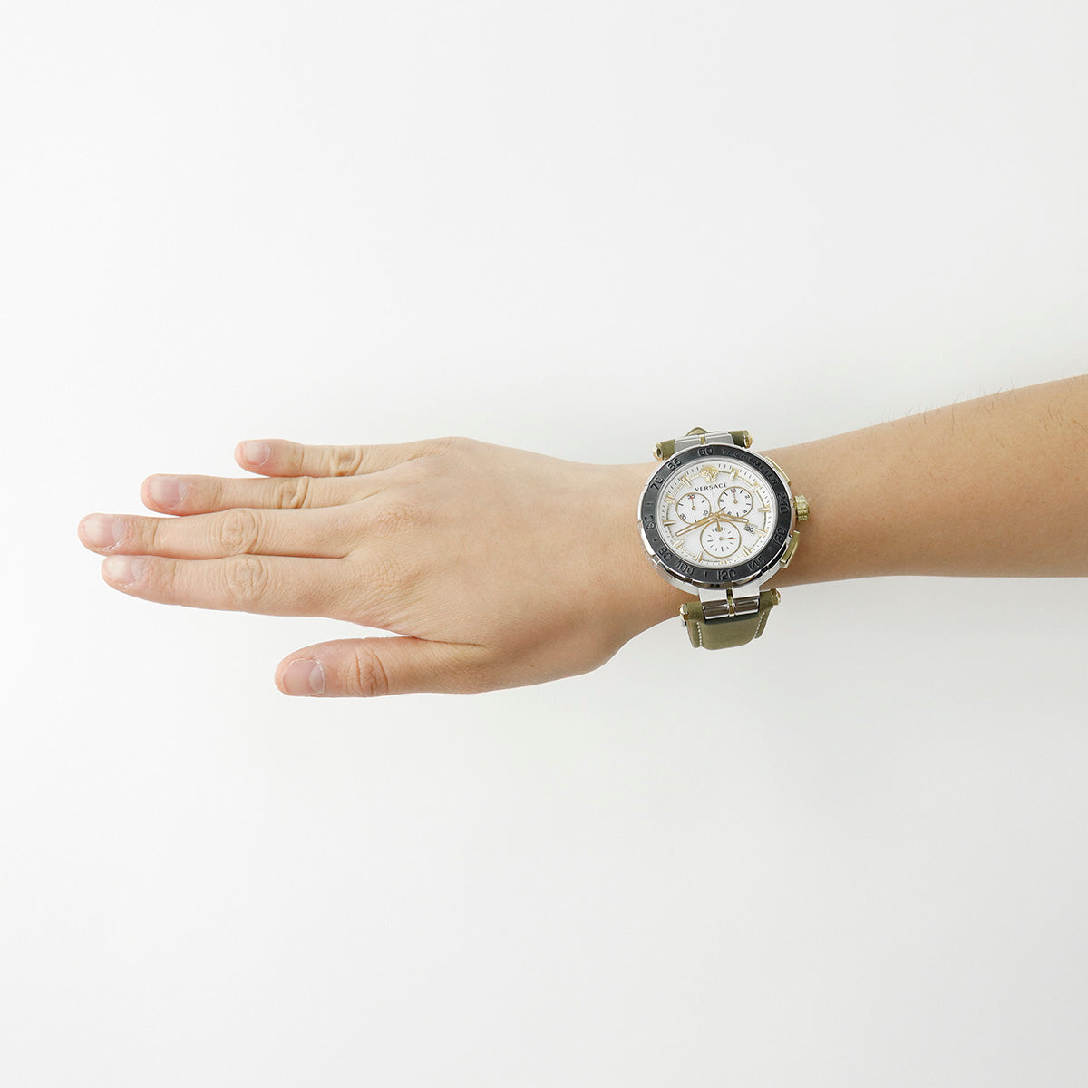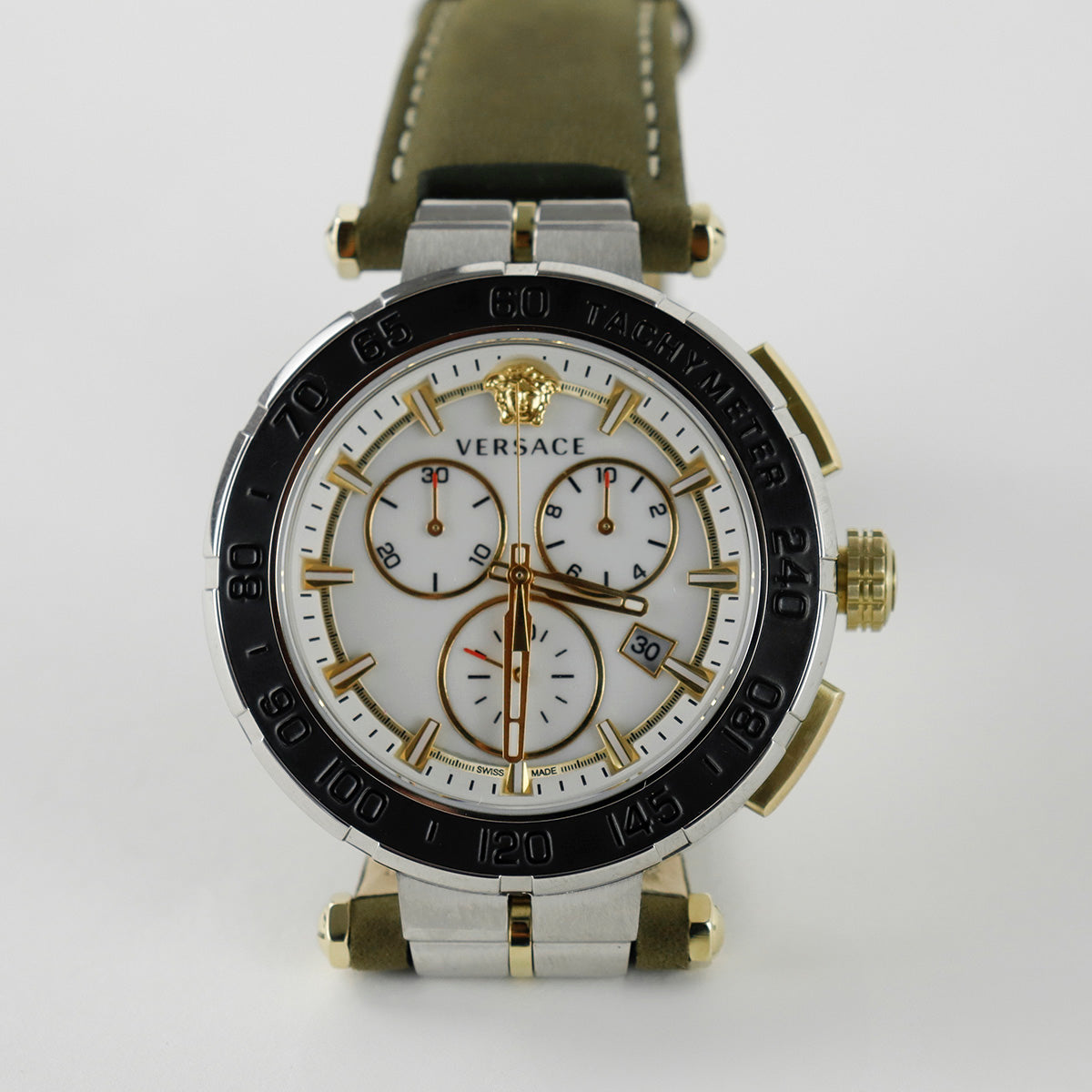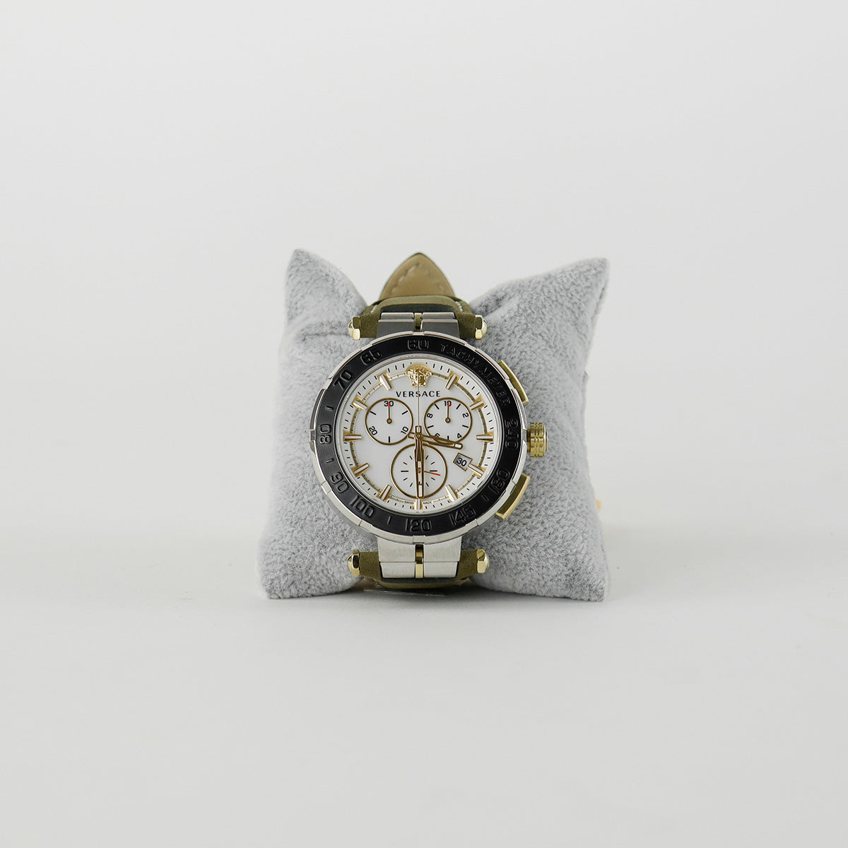 Reloj con maquinaria de cuarzo de la marca Versace, confeccionado con caja de metal 45 mm y pulso de piel color verde olivo, cuenta con taquímetro y fechador.