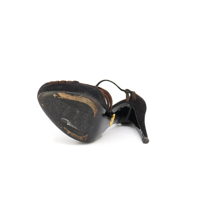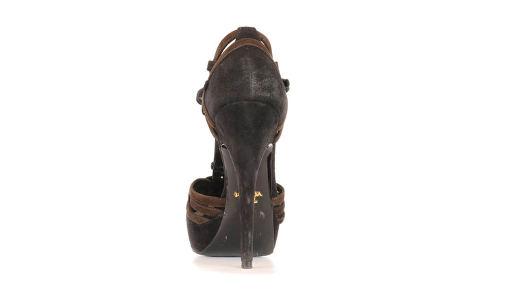 Zapatos de tacón Prada, confeccionados en piel de gamuza en color negro y café, puntera cerrada redonda con detalle entretejido, tres tiras al empeine en forma de T, con pulsera ajustable al tobillo a base de hebilla.