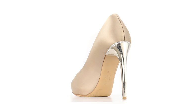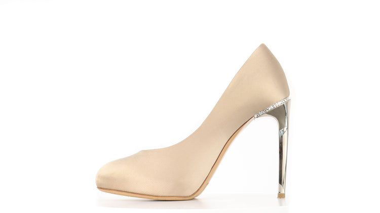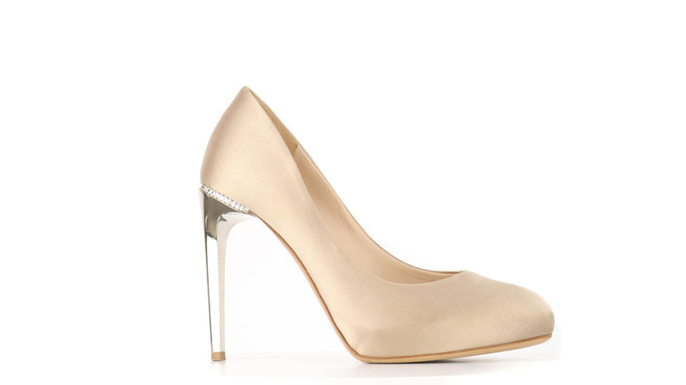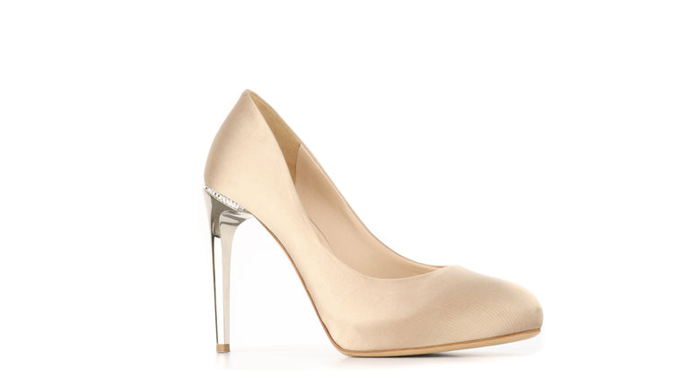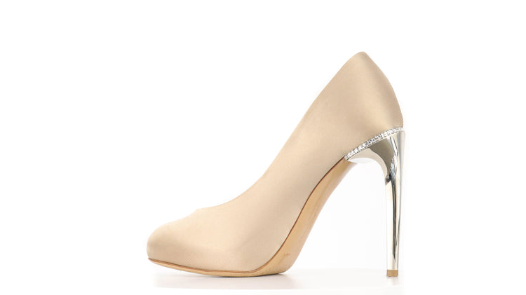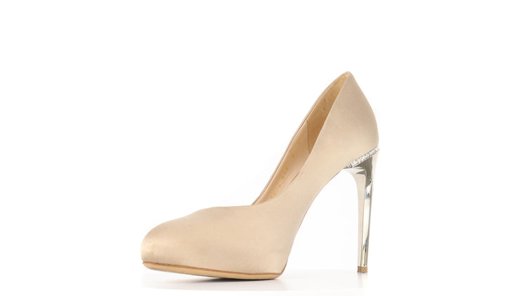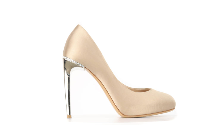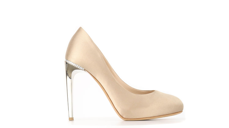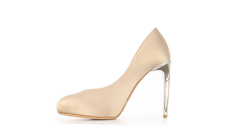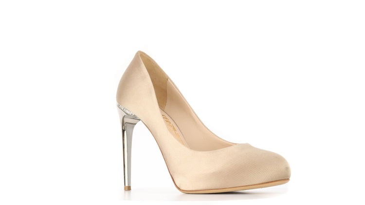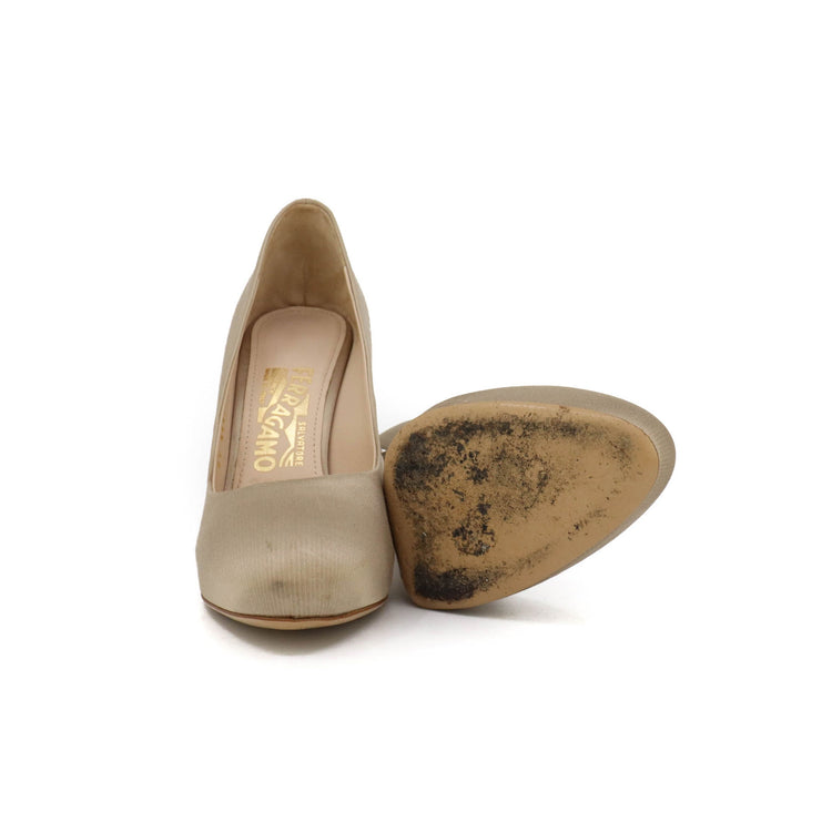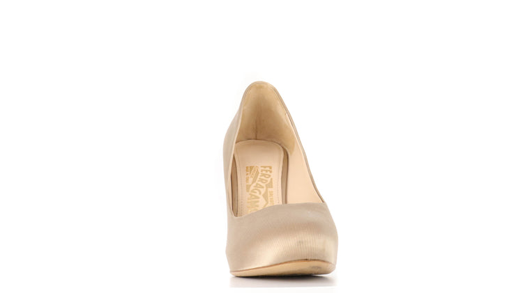 Zapatos de tacón marca Salvatore Ferragamo, confeccionados en piel satinada color dorado, con puntera redonda cerrada, tacón con adornos de cristales.