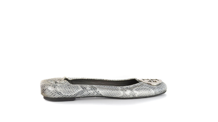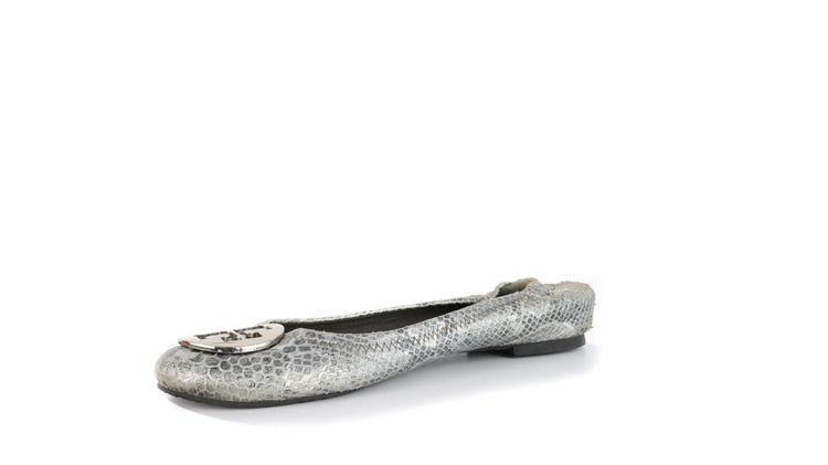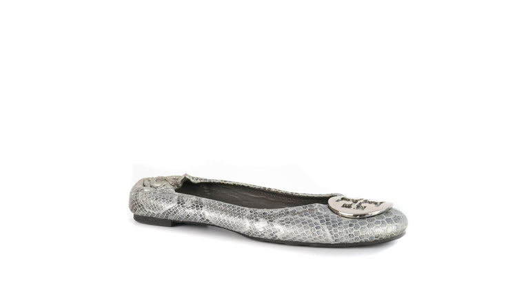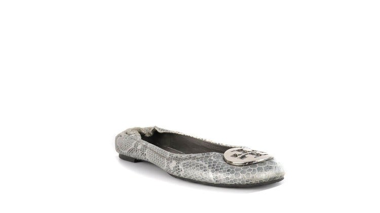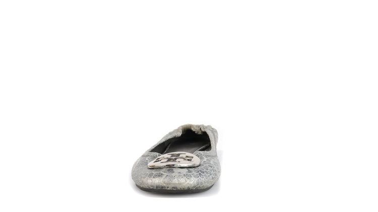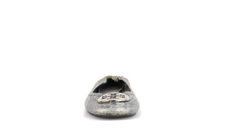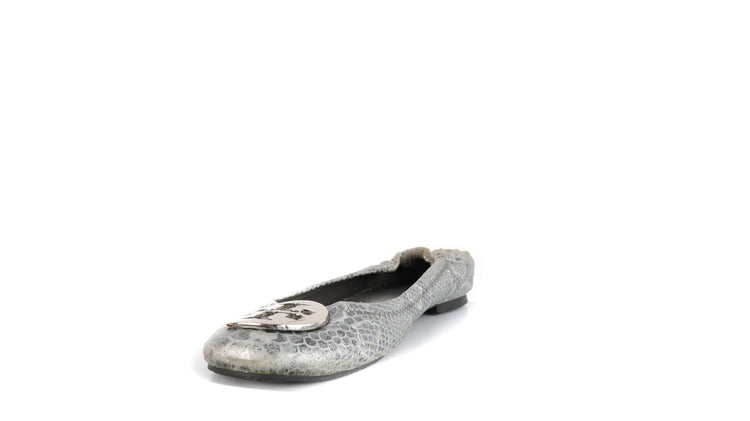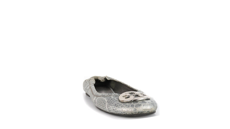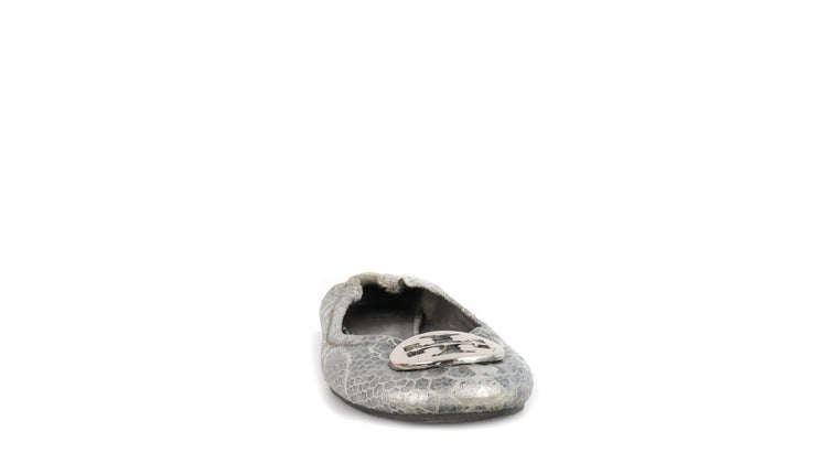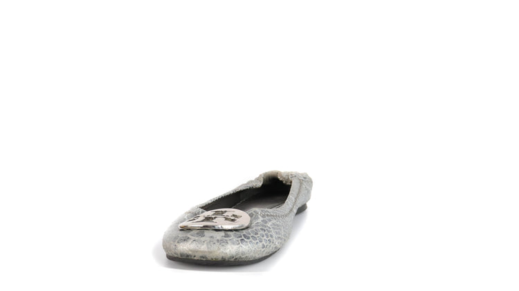 Flats de la marca Tory Burch, confeccionados en piel de becerro súper suave color plateado con puntera redonda, estilo slip-on, placa metálica del logo de la marca, plantilla con los logos y suela plana.