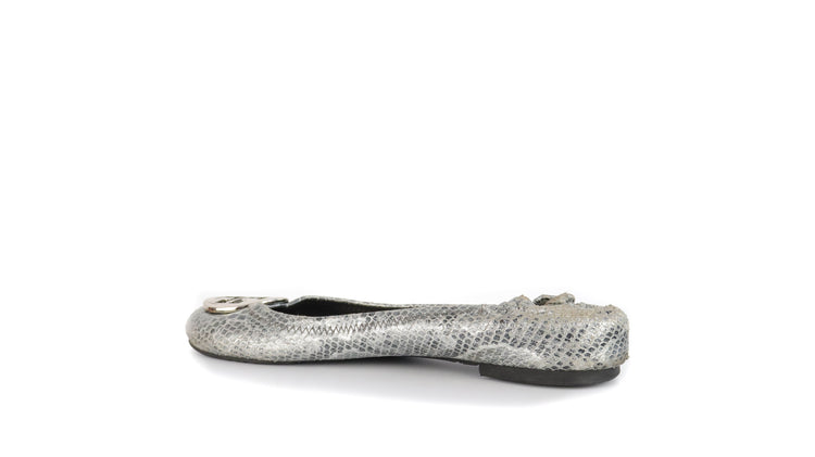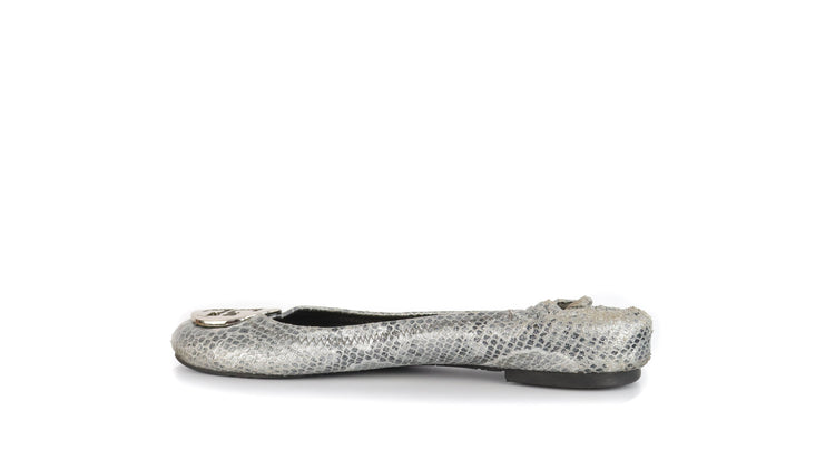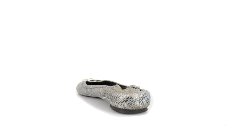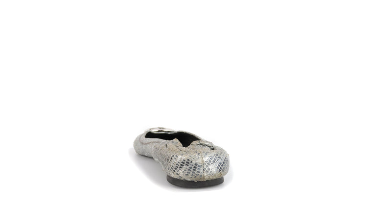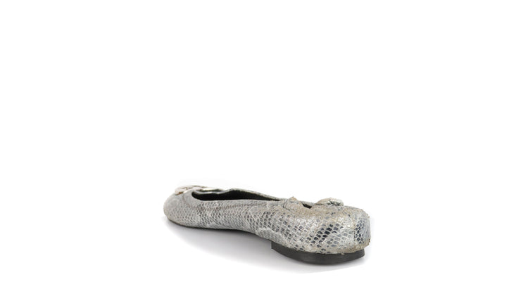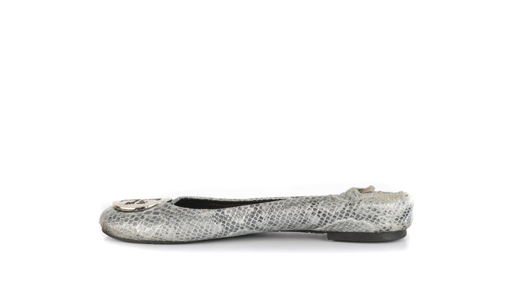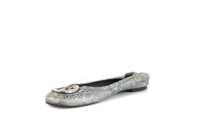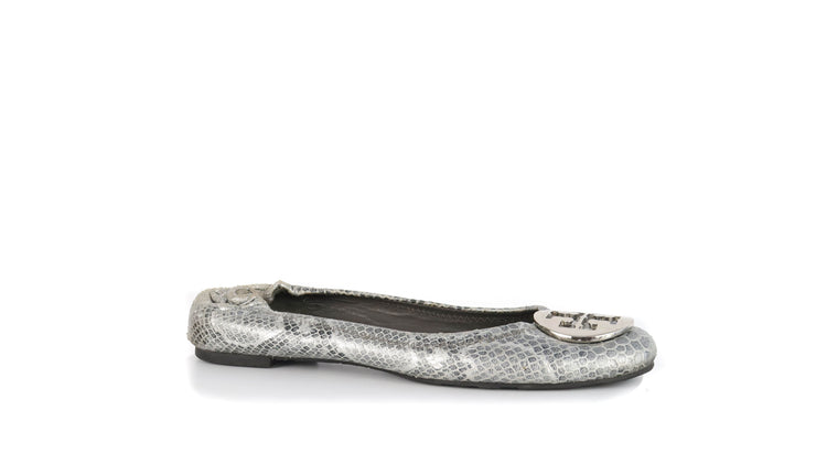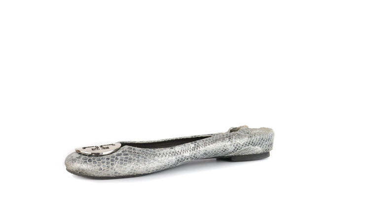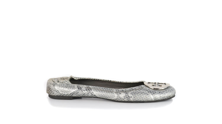 Flats de la marca Tory Burch, confeccionados en piel de becerro súper suave color plateado con puntera redonda, estilo slip-on, placa metálica del logo de la marca, plantilla con los logos y suela plana.